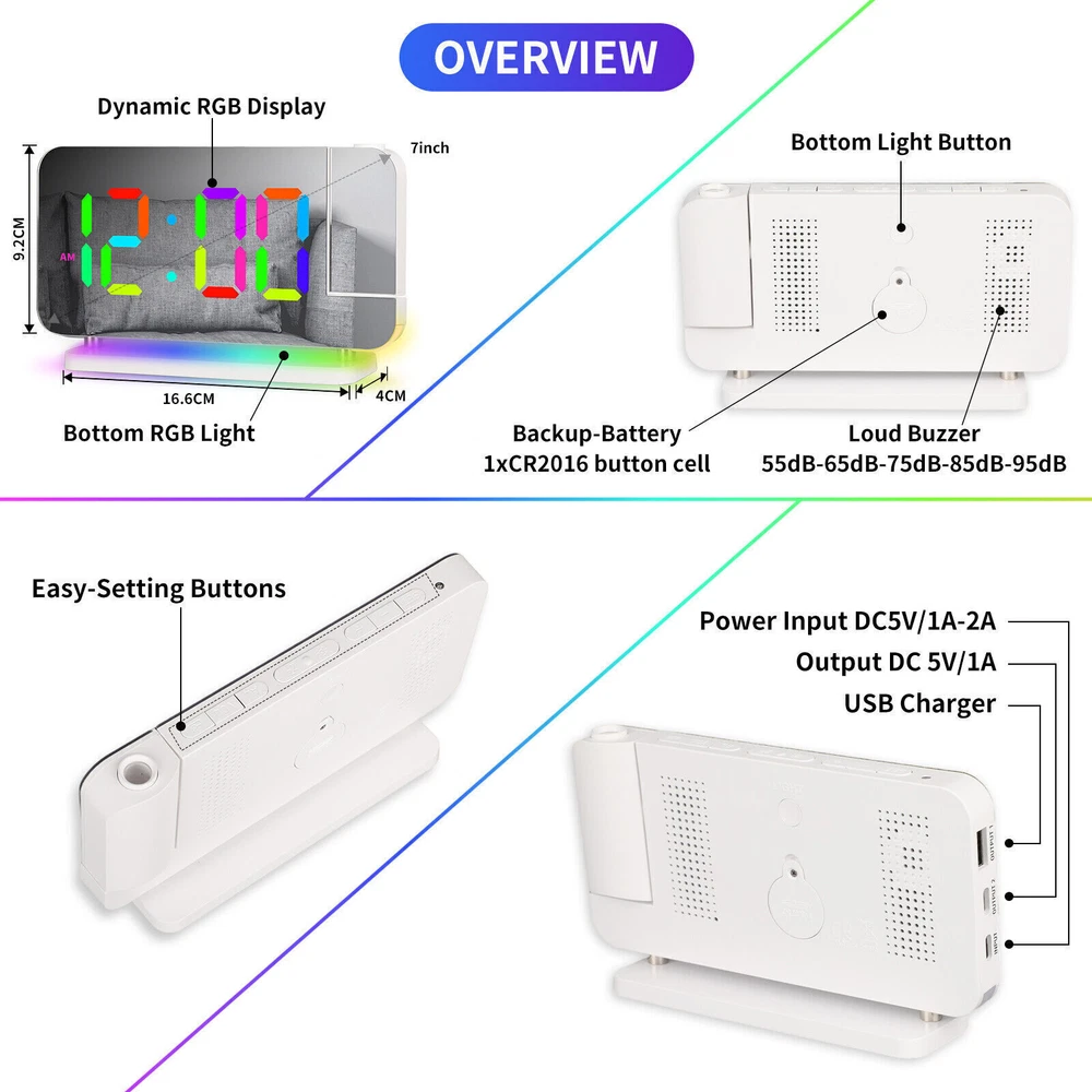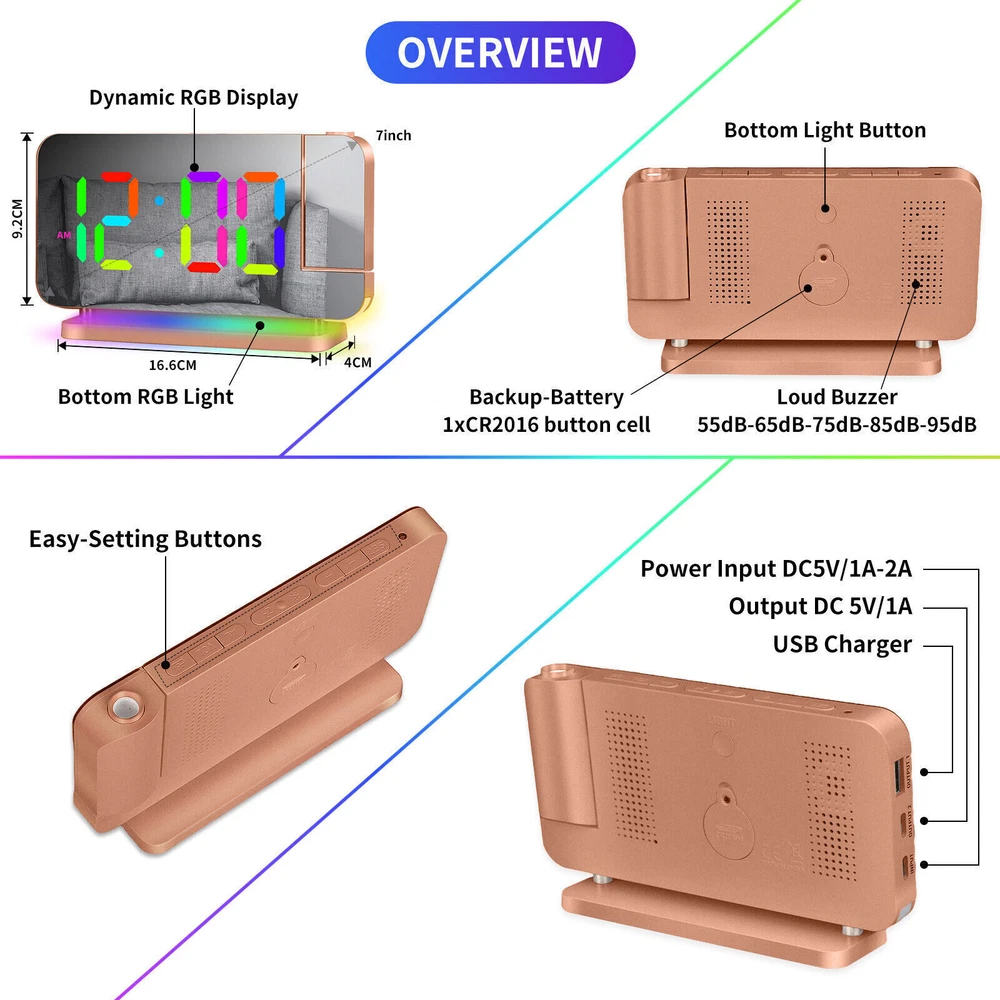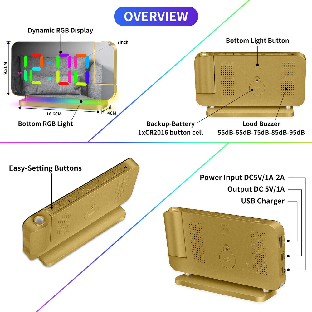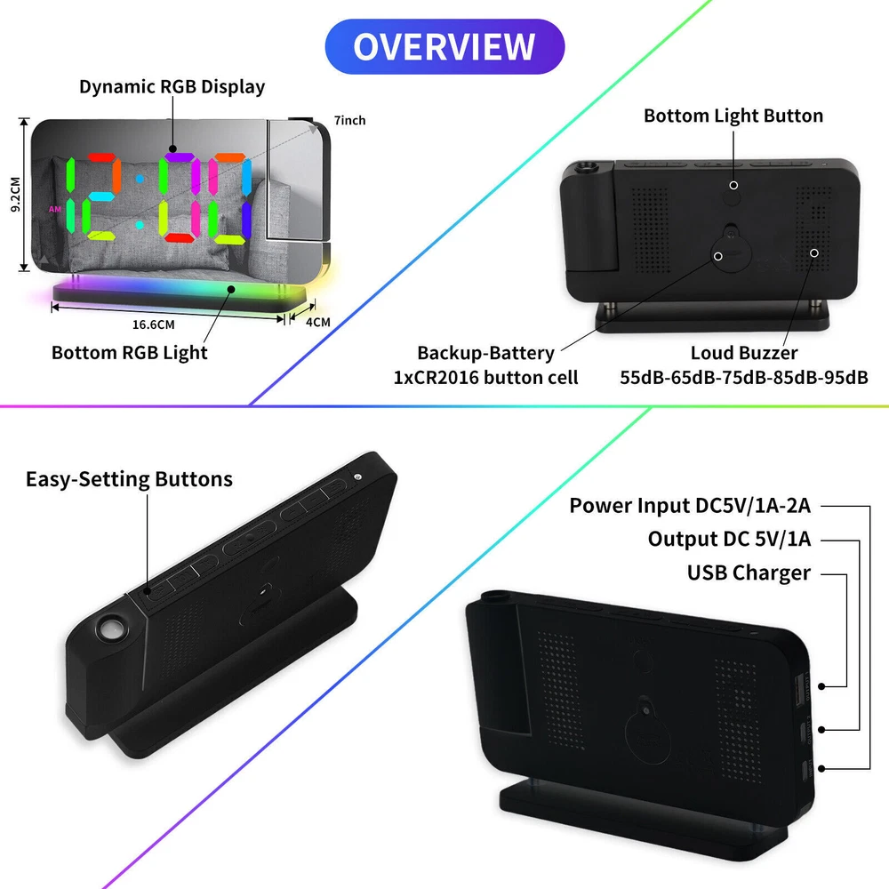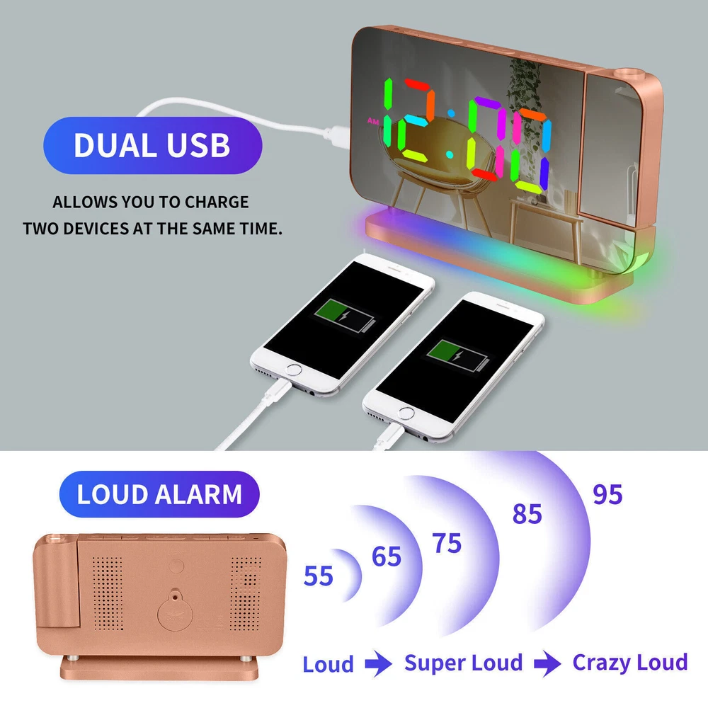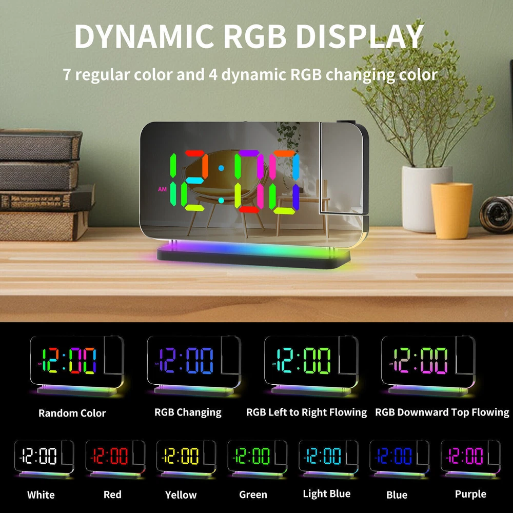 You may also like Universal Boat Outboard Engine Motor Kill Stop Switch With Safety Tether Lanyard 15.03 USD 15.99 USD Free shipping 6% off For Jeep Wrangler JL Gladiator JT Accessories Center Console Hanging Storage Box 18.79 USD 19.99 USD Free shipping 6% off For Toyota CAMRY 2018-2021 Car Silver Passenger Right Side Mirror Cover Cap HOT 28.49 USD 29.99 USD Free shipping 5% off For 2008-18 Mercedes-Benz W463 G550 G63 Left Rear Tail Lights Lamp Cover Replace 71.43 USD 75.99 USD Free shipping 6% off For 2010-2013 Acura MDX Left Rear Reflector Bumper Trim 3555-STX-A11 33555STXA11 36.09 USD 37.99 USD Free shipping 5% off Steering Wheel Audio Volume Cruise Control Switch For Nissan Pathfinder (Left) 32.89 USD 34.99 USD 5.0 USD 6% off RGB LED Mirror Sequential Signal Light& Fog Light for Infiniti Q50 Q60 2014-2022 111.85 USD 118.99 USD Free shipping 6% off 1Pair Carbon Fiber Car Rearview Mirror Cap Cover Trim For Honda Civic 2012-2015N 33.83 USD 35.99 USD Free shipping 6% off 4Pcs Roof Rack Rail End Cover Shell Cap For Lexus GX470 2003-2009 Sport 4-Door 56.39 USD 59.99 USD Free shipping 6% off For Honda Civic 2012-2015N Carbon Fiber Car Rearview Mirror Cap Cover Trim 1Pair 33.83 USD 35.99 USD Free shipping 6% off Crystal Clear Lens Brake Tail Light Turn Signal Cover For 2008-12 Accord Sedan 237.49 USD 249.99 USD Free shipping 5% off For Toyota Highlander 2015-2019 LED Rear Fog Light Tail Bumper Light Sets 84.87 USD 90.29 USD Free shipping 6% off LED Digital Projector Mirror Alarm Clock Time Projection Snooze Dual USB Alarms Feature: ⏰HD PROJECTION ALARM CLOCK -- The projector of the Alarm Clock can be rotated 180°, one-key flip time display, 4-level brightness is adjustable, 1.64-11.4 feet (0.5-3m) effective projection distance, can clearly project the time on the wall Or the best position on the ceiling for you to easily watch the time. ⏰11-COLOR RGB DIGITAL DISPLAY -- The Digital Clock adopts a color-changing LED display, with 4 dynamic RGB colors + 7 fixed color modes, 6 level brightness adjustable + auto dimming,bringing you a different visual experience. ⏰10-COLOR MODES NIGHT LIGHT --The Digital Alarm Clock has a built-in LED light, with 3 dynamic RGB colors + 7 fixed color modes, one key to switch the light color, 5 levels of brightness adjustable, and can also be used as an atmosphere light. ⏰USB-C CHARGING PORT -- The Digital Desk Clock is equipped with one USB Type C + one USB A output port, which can charge 2 electronic devices at the same time, meeting most of your charging needs. ⏰7.4-INCH MIRROR DISPLAY — The LED Alarm Clock is equipped with a 7.4-inch HD display and large digital fonts, you can clearly watch the time within 30 feet; the unique acrylic mirror design can also be used as a makeup mirror. ⏰5 LEVELS VOLUME ADJUSTABLE--The Loud Alarm Clock has a variety of volume options from 55-65-75-85-95db, you can choose the appropriate volume according to your sleep depth, which is very suitable for heavy sleepers. ⏰SNOOZE +12/24H MODE--The LED RGB Clock is designed with a snooze button on the top, which can be turned off at will, allowing you to easily get 5-60 minutes of lazy bed time; 12 and 24 hours are available in two time display modes. Package include: 1 x Projection Alarm Clock 1 x Power Adapter 1 x USB C Charging Cable 1 x Product Manual ee2e60e0336d0a67c3665b091_ee8d8c09-be98-4462-9083-9feb53bc0b7c.__CR0,0,1464,600_PT0_SX1464_V1___.jpg