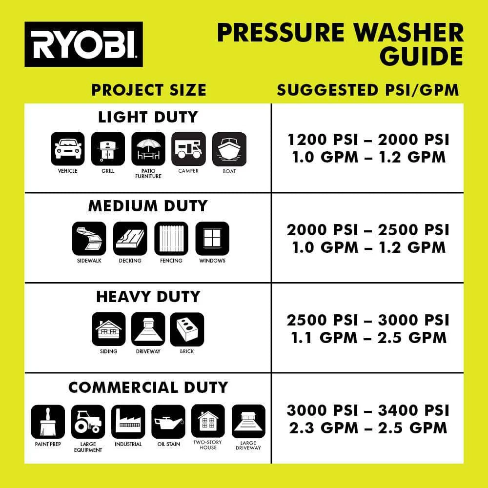 1800 PSI 1.2 GPM Cold Water Corded Electric Pressure Washer Convenient Portable Cleaning with 1800 PSI 1.2 GPM For use on Patio Furniture, Grills, Cars, Windows, & More Compact & Lightweight Design for Easy Transport The RYOBI 1800 PSI 1.2 GPM Electric Pressure Washer is the perfect lightweight and portable solution for your outdoor cleaning needs. Without the hassle of gas, this electric pressure washer is ideal for light duty tasks like cleaning patio furniture, grills, windows, bikes, boats, campers, decks, and other outdoor applications. Weighing just 16 lbs, this pressure washer is compact, making it convenient to transport and store in small spaces. The included 20 ultra flex hose is 50% lighter than a standard high pressure hose, reducing fatigue and allowing for easy maneuverability. The spray wand is equipped with a ¼ quick-connect nozzle coupler, making nozzle changes quick and simple. Clean a variety of messes with the two included nozzles, and get the job done 50% faster than a standard nozzle with the included turbo nozzle. Attach the soap applicator for a deeper clean when detergent is needed on tougher jobs. This pressure washer is backed by the RYOBI 3-year limited warranty. This kit the RY141802 1800 PSI 1.2 GPM Pressure Washer, Trigger Handle, Spray Wand, 20 Ultra Flex Hose, Soap Tank, ¼ Quick-Connect Nozzles (15°, Turbo, Soap), & Operator s Manual. Amperage (A): 13 A Assembly Required: Yes Commercial / Residential: Residential Connection Type: Bayonet Style Trigger Handle Connection Cord Length (ft.): 35 Features: Chemical/detergent injection,Cord Lock,Quick connect tips Gallons Per Minute: 1.2 Hose Material: Polyurethane Included: GFIC plug,Hose,Onboard cord storage,Onboard storage Maximum Pressure (PSI): 1800 psi Nozzle Type: Pro Style tips with quick disconnect Number of tips included: 3 Power Type: Corded Product Weight (lb.): 16.34 lb Pump Brand: Other Pump Type: Axial Reconditioned: New Returnable: 90-Day Start Type: Electronic Ignition Suggested Use: Car,Grill,Patio Furniture Water Temperature: Cold Manufacturer Warranty: 3-Year Limited Warranty Assembled Depth (in.): 18.375 in Assembled Height (in.): 7.75 in Assembled Width (in.): 11.875 in Hose length (in.): 240 in Interior Hose Diameter (in.): .25 in Wheel Diameter (in.): 0