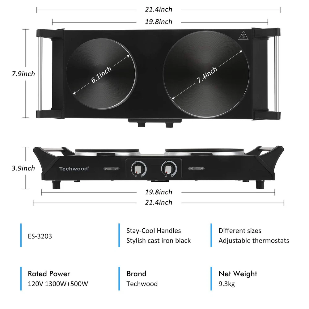 [ 2 RING HOB & VARIABLE TEMPERATURE CONTROL] - cast-iron hot plate heats efficiently with 2 thermostatically controlled heat settings conveniently to cook a variety of foods such as warm sauces, scrambled eggs, grilled cheese, soup, pasta, vegetables and so much more. Also you can use it as extra burner to keep food warm. [ ALL TYPES OF COOKWARE] - electric stove can be used with any type of cookware in your home, such as aluminium pans, copper pans, cast lron frying pans and non-magnetic stainless steel pans can heats cookware efficiently with minimal heat loss. And compatible with pots and pans with maximum size of 7.5 inches. And stainless steel body to withstand frequent use. Simply wipe with a clean cloth when cool. [ MULTIPURPOSE & PORTABLE] - The ultimate must-have kitchen accessory, countertop burner used compact and flat design makes it perfect for dorms, studios, RV/caravans, work, camping, everyday use or as an extra cooking appliance in the busy kitchen. Because of its small and light size, you can easily to used in confined spaces or anywhere. [ POWERFUL & SAFE] - Powered by 1800W, it heats up food faster than conventional cooking ranges. Modern brushed stainless steel housing. Non-slip feet for stable cooking. Solid stainless steel riveted handle stays cool and comfortable during cooking. Ergonomic design ensuring safe transport and stays cool on the stovetop. Built-in over-heat protection. Also, compared to induction cookers, electric cooktop is safe to use and doesn’t emit harmful radiation. All products are protected by US Product Liability Insurance. See the instruction manual for details.