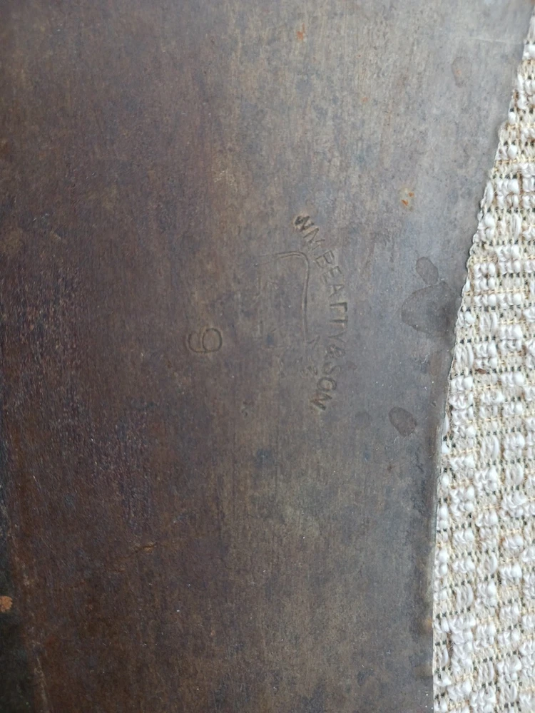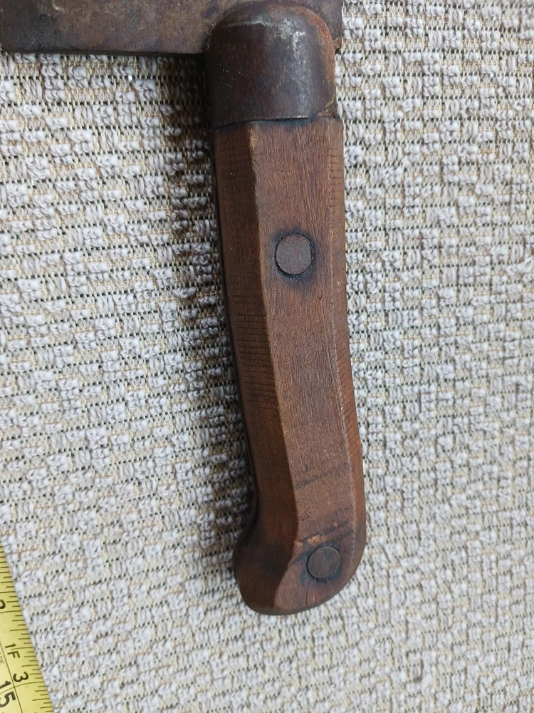 This listing is for a Wm Beatty & Sons No. 9 meat cleaver. No. 9 signifying that the blade is 9" long. Blade has some surface rust. Wood handle is in good shape. This piece has a neat look to it and would make an excellent haunted house prop.