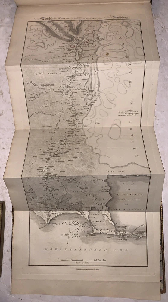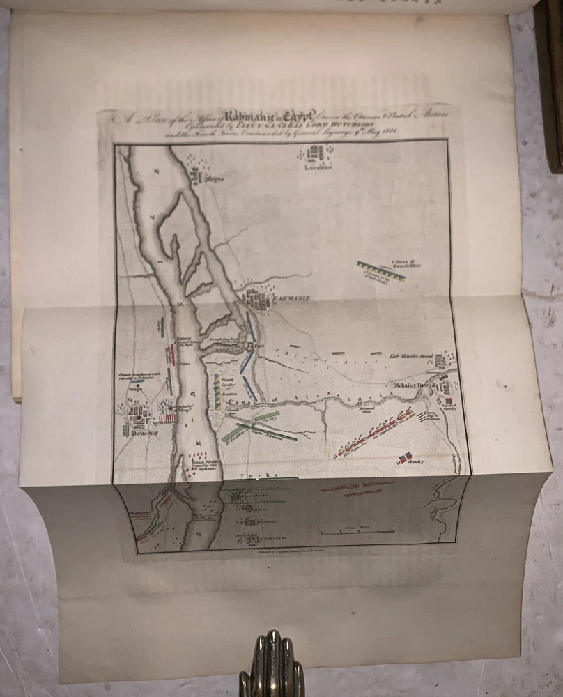 History of The British Expedition To Egypt; To Which is Subjoined A Sketch of The Present State of That Country And Its Means of Defence Illustrated With Maps And Portraits of Sir Ralph Abercromby by Robert Thomas Wilson London: T. Egerton 1803 The Second Edition Quarto, xxi, 389 pages, bound in periof full leather with gilt-lettering and decoration. Marbled endpapers. Illustrated with 2 fold-out tables and 3 fold-out maps. Top board detached, some minor rubbing and wear, minor discoloration, previous owner's inscription, else in good + condition. History of the British Expedition to Egypt; To Which is Subjoined a Sketch of the Present State of That Country and Its Means of Defence by Robert Thomas Wilson offers a detailed account of Britain’s military campaign in Egypt during the early 19th century. The book provides a comprehensive narrative of the expedition, emphasizing the strategic maneuvers, battles, and leadership that shaped the campaign, with a particular focus on the contributions of Sir Ralph Abercromby. Wilson, a British military officer and historian, enhances the work with insightful commentary on Egypt's political and military state at the time, including its defensive capabilities and resources. Featuring maps and portraits, including one of Abercromby, the book serves both as a historical record and a tribute to the military achievements of the era. It remains an invaluable resource for those interested in British military history and early 19th-century geopolitics. If you have any questions, feel free to ask, and don't forget to check out my other listings.