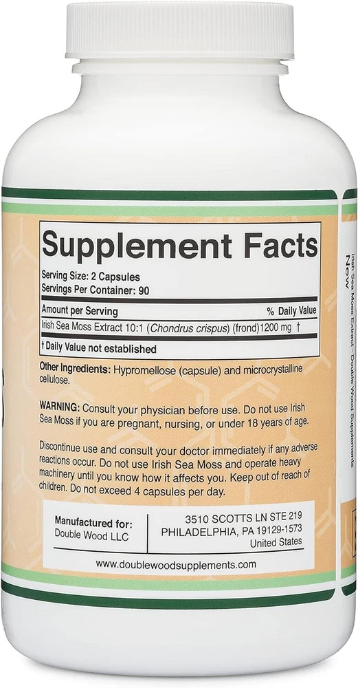 Elevate your wellness routine with Double Wood’s Irish Sea Moss Capsules —a potent and nutrient-dense superfood derived from wildcrafted and raw Chondrus Crispus , providing a wealth of vitamins and minerals in each serving. With 180 capsules per bottle and a powerful dose of 1,200mg per serving , these sea moss capsules are a convenient, vegan-friendly way to enhance your overall health. Nutrient-Rich Superfood Packed with vitamins A, E, F, and K , as well as essential minerals like calcium and iodine , these Irish Sea Moss Capsules offer a powerful boost to your daily nutrition. Known as a nutrient powerhouse, Irish Sea Moss is revered for its high mineral content that supports overall wellness, including bone, skin, and immune health. Supports Respiratory Health Thanks to its high levels of potassium chloride , Irish Sea Moss is particularly beneficial for maintaining respiratory health. Potassium chloride helps dissolve mucus and reduce inflammation, making it a natural aid for clearing the airways and promoting lung health. More Potent Than Sea Moss Gel Unlike typical sea moss gels or extracts, these capsules deliver a concentrated form of wildcrafted and raw Chondrus Crispus in an easy-to-take supplement. Each serving of 1,200mg ensures you’re getting a potent dose of this ancient superfood, with more convenience and efficacy than messy gels. Vegan and Allergy-Friendly These Irish Sea Moss Capsules are 100% vegan , made with vegetable-based capsules that are safe for plant-based diets. They are also gluten-free and non-GMO , making them a great choice for those with dietary restrictions or sensitivities. Generous 3-Month Supply Each bottle contains 180 capsules , providing you with a whopping 90 servings —enough for a full 3-month supply. This makes it a cost-effective and time-saving option for anyone looking to reap the long-term benefits of sea moss. Manufactured in the USA with Globally Sourced Ingredients Rest assured that you're getting top-quality supplements. These capsules are manufactured in the USA , adhering to strict quality control standards, and made from carefully sourced, high-quality ingredients from around the world. They are free from harmful additives, fillers, and unnecessary chemicals, ensuring you’re getting a pure, clean product. Why Choose Double Wood Irish Sea Moss Capsules? If you’re seeking a nutrient-dense superfood that supports respiratory health, immunity, skin, and energy levels, Double Wood’s Irish Sea Moss Capsules are a superior choice. They’re convenient, potent, and formulated with the highest-quality ingredients, providing you with an easy way to integrate sea moss into your daily routine. Harness the power of nature with these Irish Sea Moss Capsules —your go-to superfood for total body wellness!