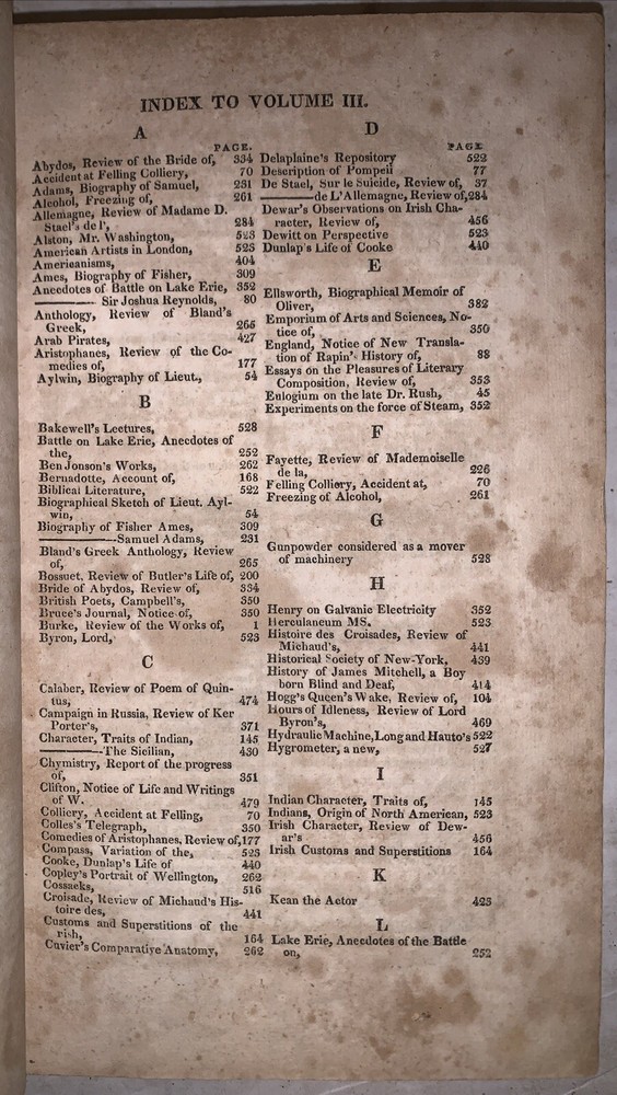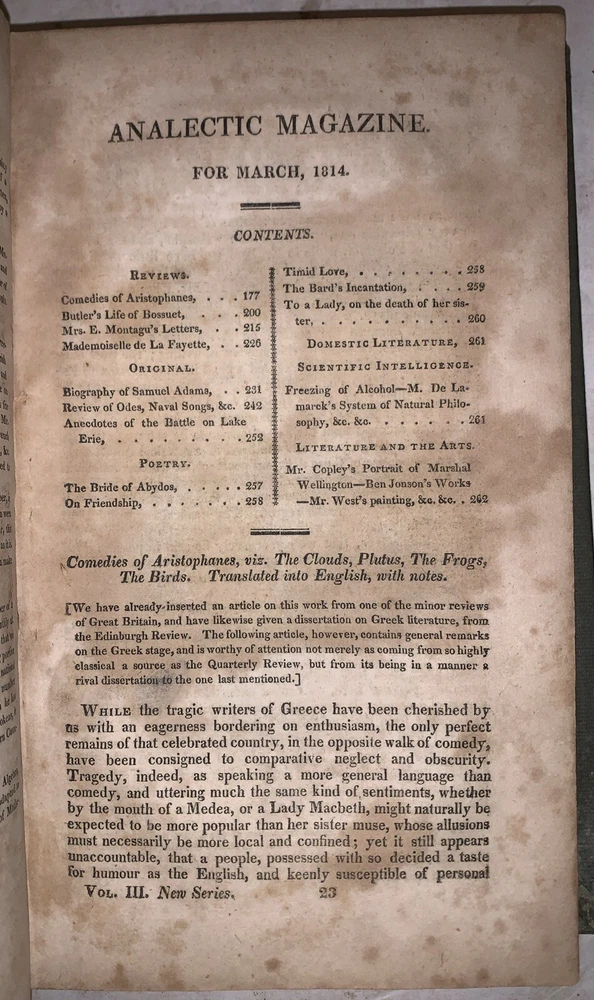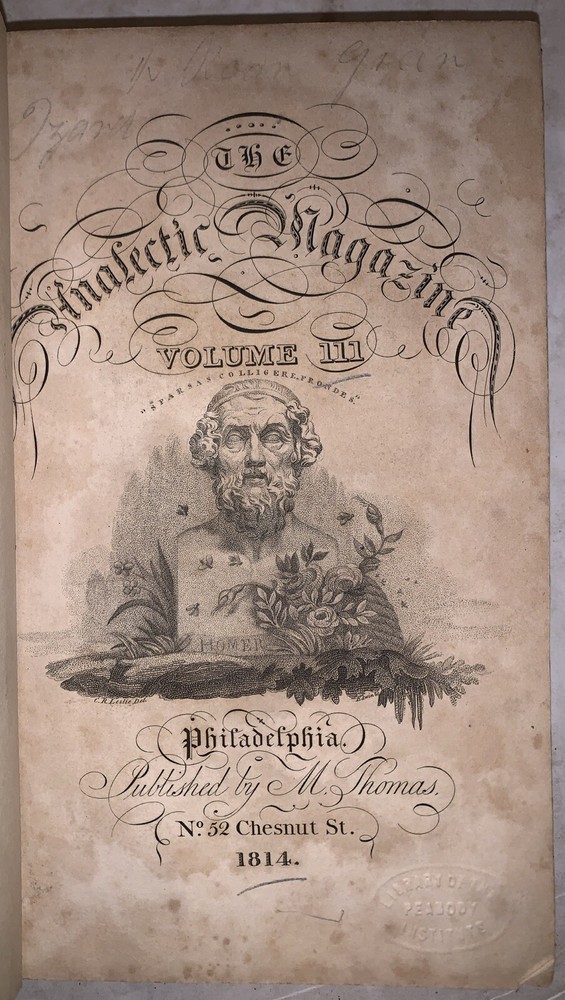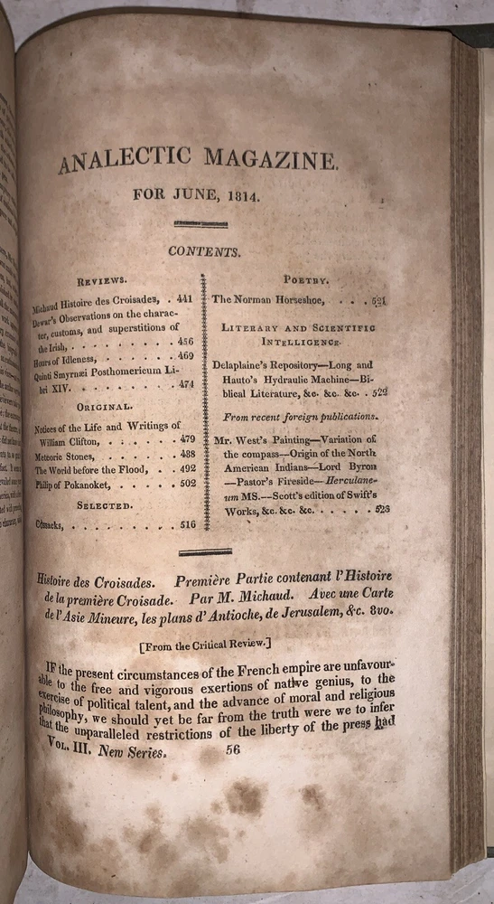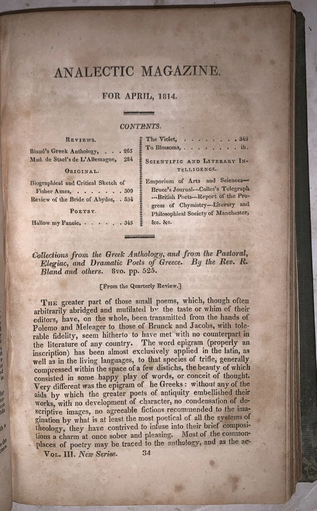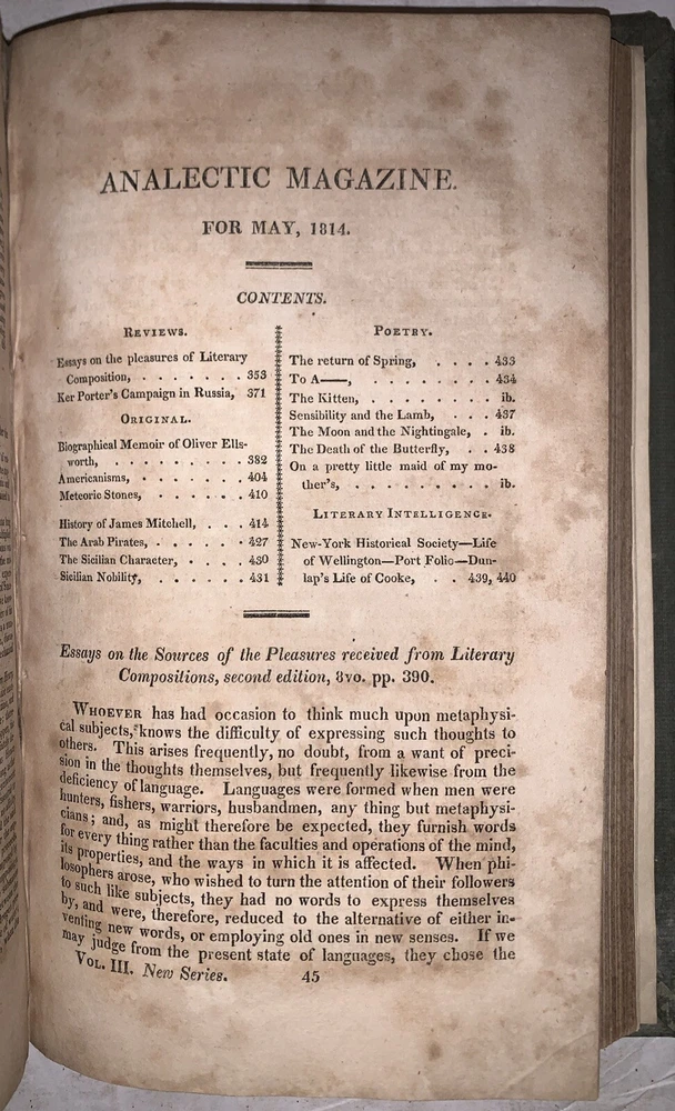 The Analectic Magazine, Containing Selections from Foreign Reviews and Magazines, of Such Articles as are Most Valuable, Curious, or Entertaining Volume III - January-June Philadelphia: Moses Thomas 1814 First Edition Octavo, ii, 528 pages, rebound in gilt lettered grey cloth covered boards. There is a stamp and a few markings indicating that this item originated from an institutional collection. Some rubbing and wear, foxing and discoloration, else in good + condition. If you have any questions, feel free to ask, and don't forget to check out my other listings.