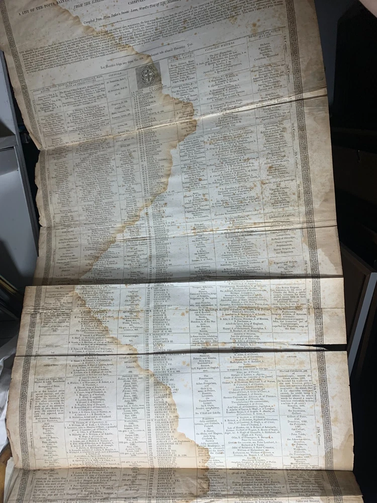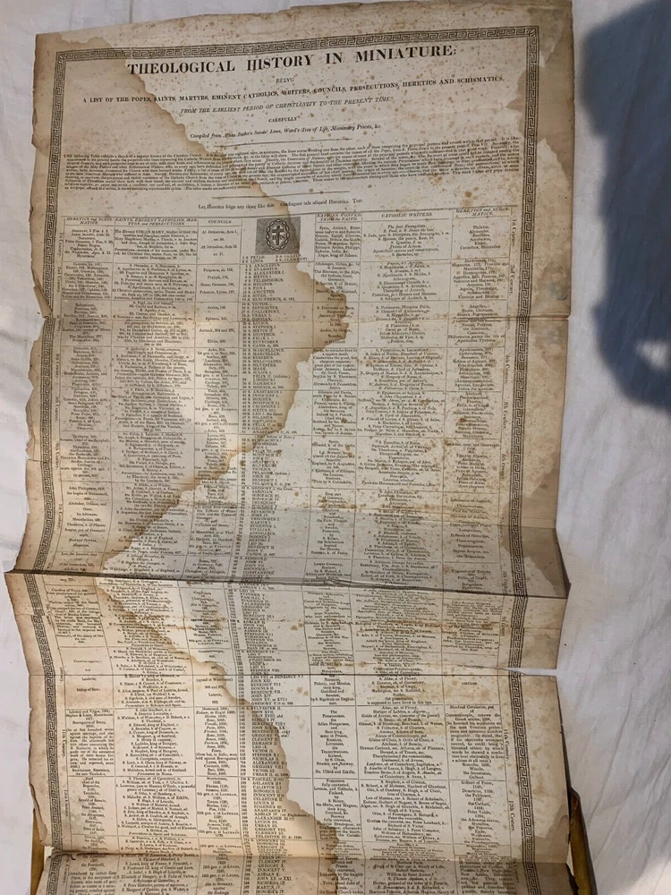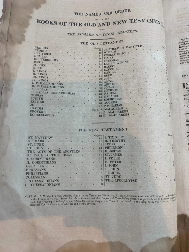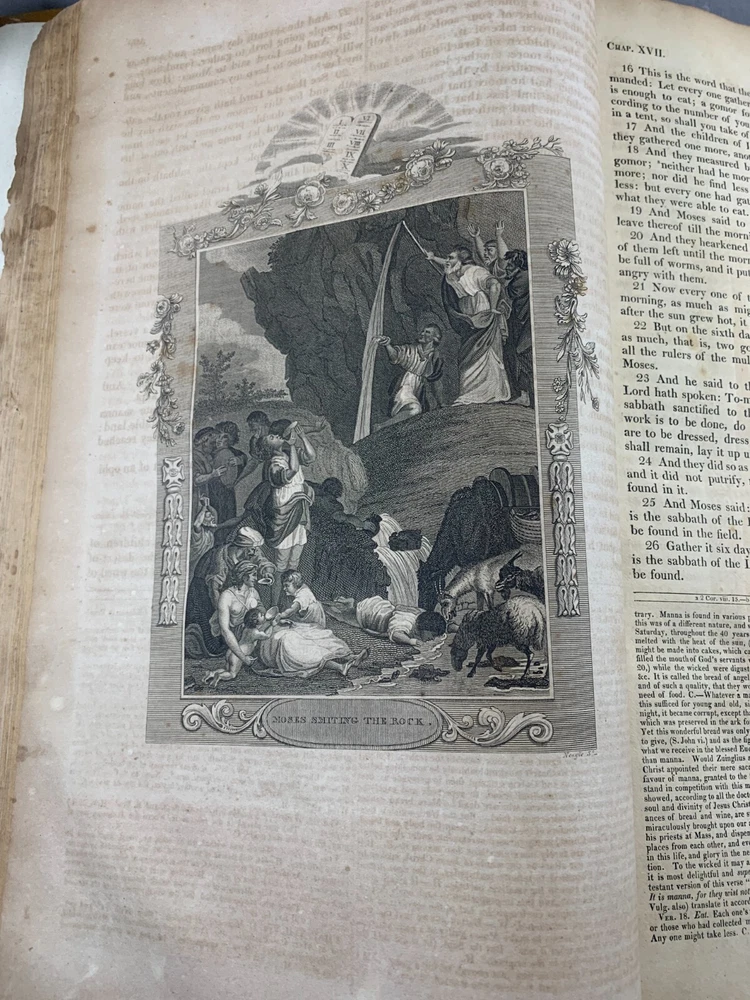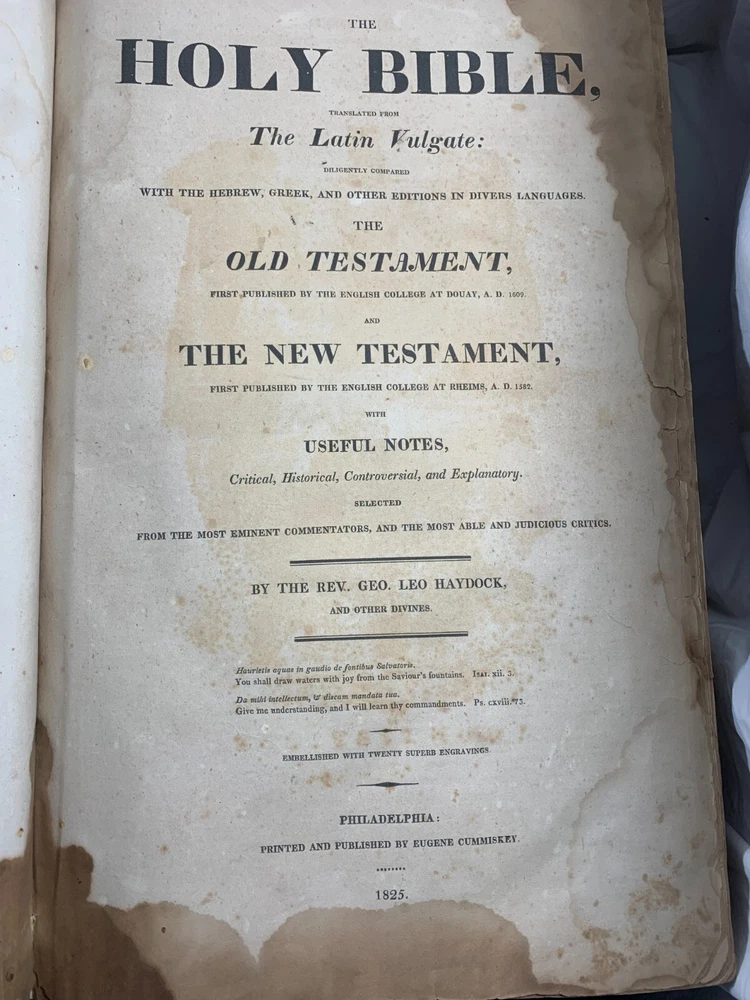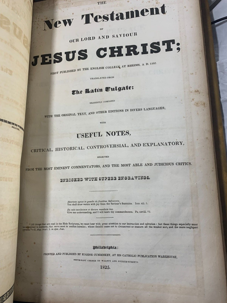 1825 Douay-Rheims Catholic Jumbo Folio Bible – Illustrated – Rare Early American Edition: DESCRIPTION Offered is a scarce and historically important 1825 Douay-Rheims Catholic Bible , classified as Herbert 1733 , in a jumbo folio format with engraved biblical illustrations . This edition is among the earliest American Catholic folio Bibles printed during a pivotal era of Catholic growth and emancipation in the United States. This Douay-Rheims translation—originally rendered from the Latin Vulgate by English Catholic scholars in exile—is presented here in its Challoner revision , which remained the standard English Catholic Bible for centuries. This specific 1825 edition is significant for being: One of the first Catholic folio Bibles published in America Illustrated with period engravings , ideal for public reading or devotional display Rare in this format , especially with engraved plates and original binding KEY FEATURES Herbert Bibliography Ref #1733 – Identifies it as a large folio Douay-Rheims edition, published in 1825. Oversized folio format – Produced for ceremonial, altar, or family display use. Illustrations – Contains full-page engravings depicting major biblical scenes (e.g., Creation, Crucifixion, Resurrection). Printed by Eugene Cummiskey – One of the earliest Catholic Bible printers in the U.S., based in Philadelphia. Textual Authority – Reflects Bishop Challoner’s revered revision of the Douay-Rheims version. Illustrations: All plates present. COLLECTOR'S NOTES This edition represents a milestone in early American Catholic publishing. Copies of the Herbert 1733 folio Douay-Rheims Bible are exceedingly scarce—especially complete with engravings and in solid condition. It is a museum-worthy volume for: Antiquarian book collectors Catholic historians and institutions Bible scholars Devotional heritage displays Dimensions: Weight - 9.1kg Height - 45cm Width - 29cm Thickness - 12cm Damage(Please see above photos for reference): There are water marks across the bible (These do not affect the reading of the text). There is foxing throughout the bible. There are pages which are either bent awkwardly or ripped.