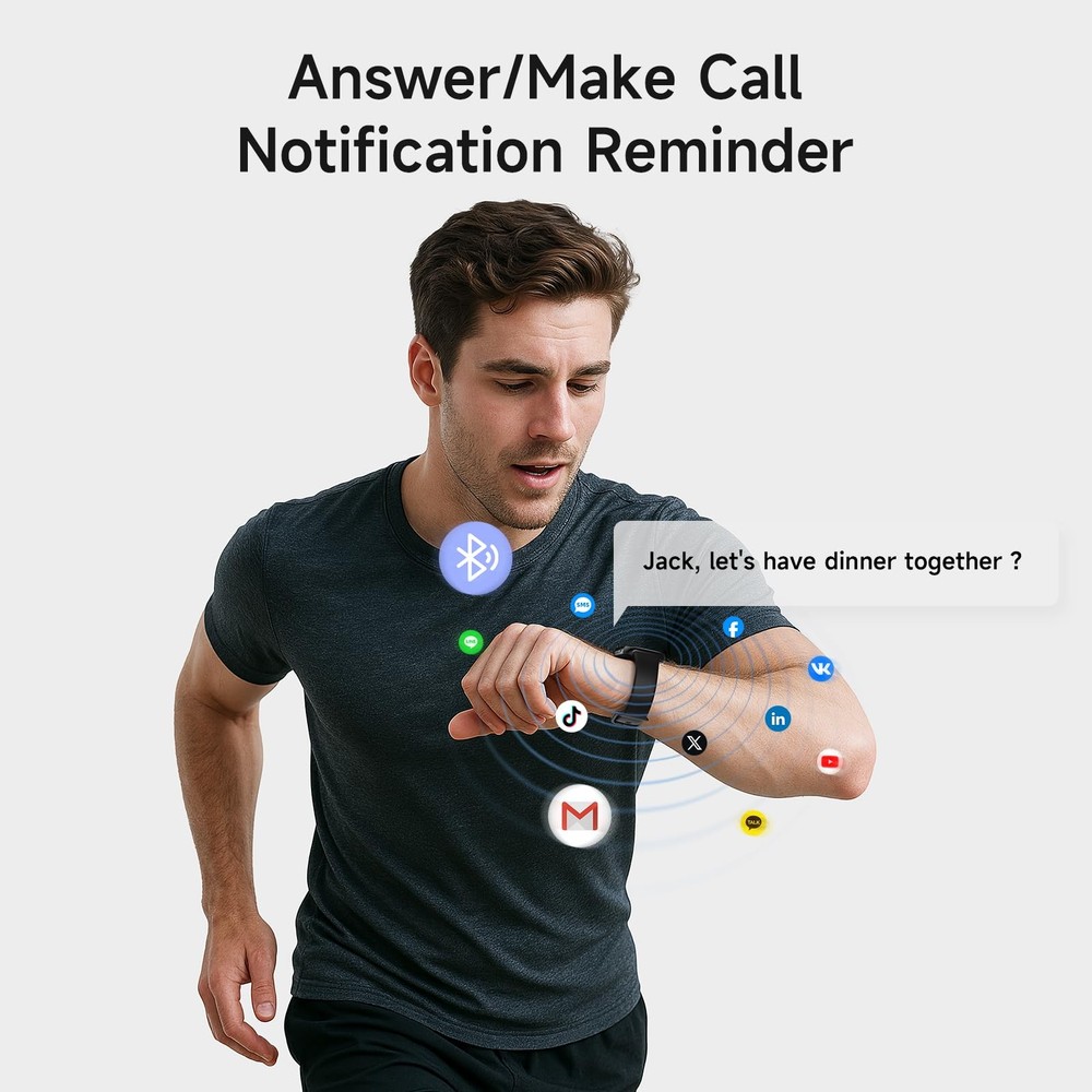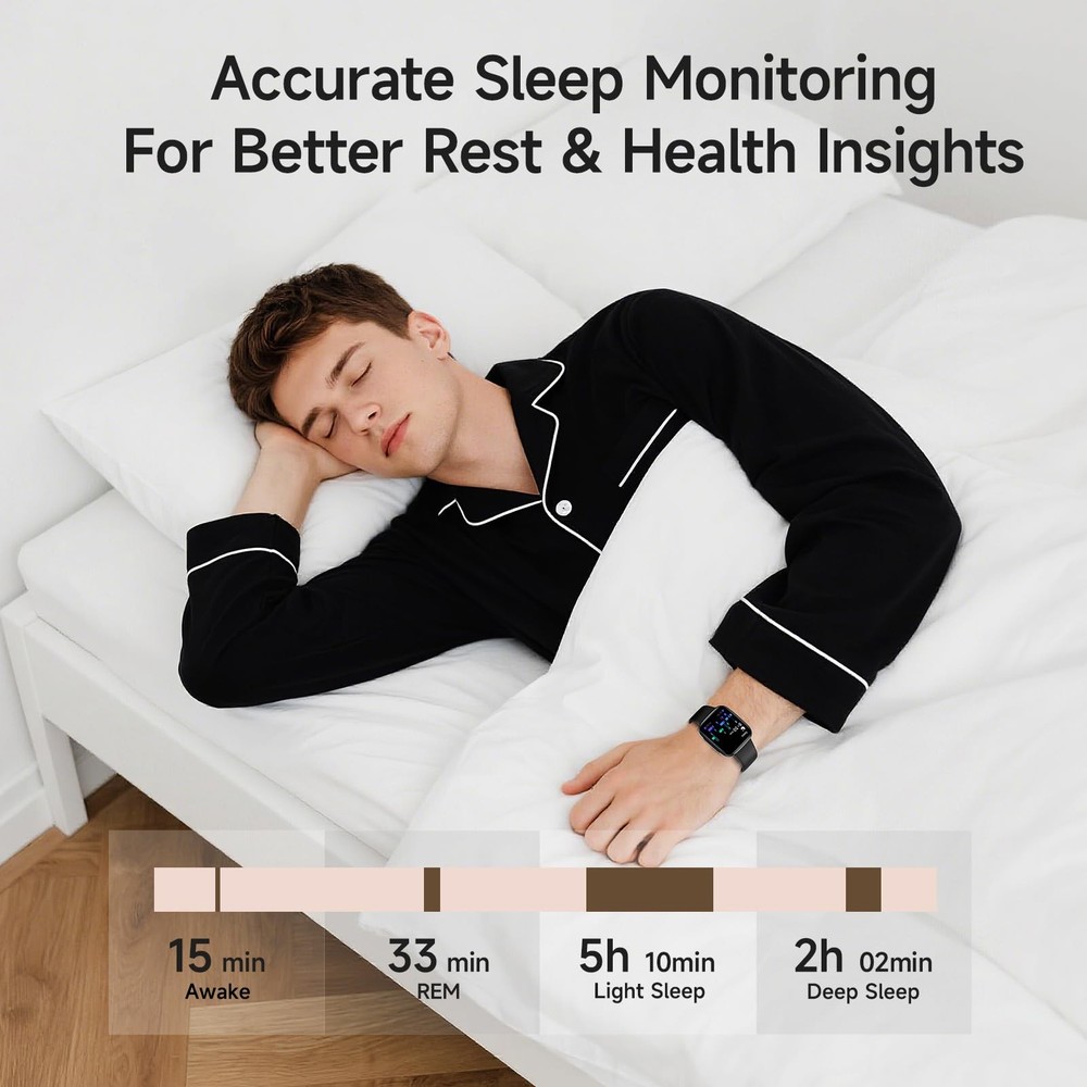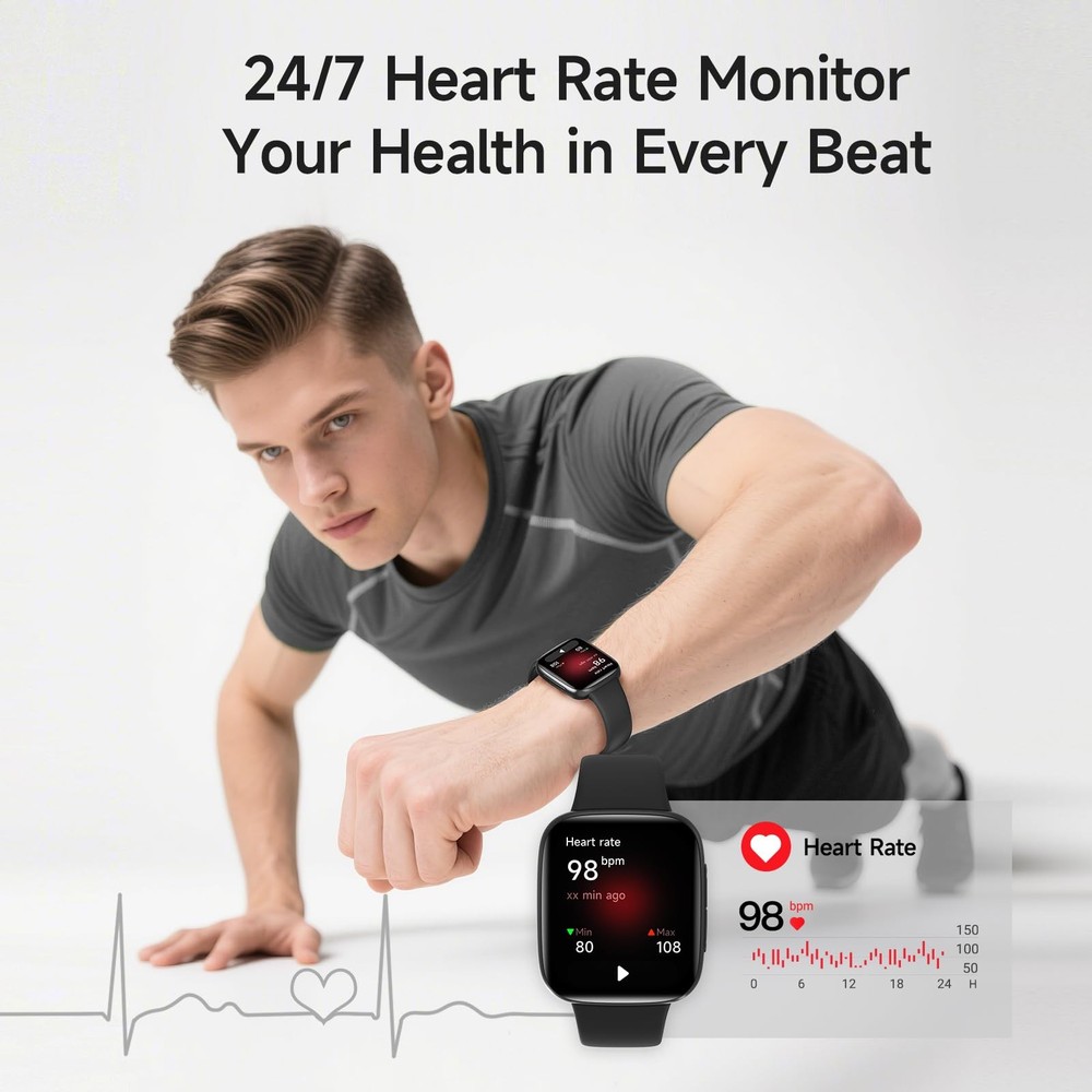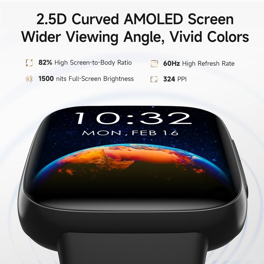Smart Watch for Men Women, 1.85" AMOLED Screen Smartwatch Compatible iPhone/Samsung/Android (Answer/Make Call), 100+ Sport Modes Fitness Tracker with Heart Rate/SpO2/Sleep Monitor, 3ATM Waterproof 【Crystal-Clear Calls & Notifications】Enjoy seamless communication with crystal-clear call quality and real-time SMS/app notifications(Not supporting reply messages), powered by Bluetooth 5.3 and advanced DSP technology. Stay connected effortlessly—all from your wrist. 【Vibrant 2.5D Curved AMOLED Display】Experience stunning visuals with our 2.5D Curved AMOLED screen, offering vivid colors and sharper resolution. Plus, customize your watch face with personal photos for a unique style. 【Precision Health Monitoring】Get accurate health insights with our proprietary BioSync Nexus Techology. Track heart rate, blood oxygen, sleep quality, and more with unrivaled precision, helping you make informed health decisions. 【Advanced Fitness Tracking】Elevate your workouts with over 100 sport modes, including running, swimming, and yoga. The IP68 waterproof design ensures durability for all your adventures. 【Seamless Compatibility & 10 Days Battery Life】Works effortlessly with iOS and Android devices. Enjoy up to 10 days of battery life on a single charge, so you never miss a beat. 【Smart Features & Reminders】Stay proactive with water intake reminders, sedentary alerts, and menstrual cycle tracking. Control music, check weather, and more—all from your wrist. 【5-Year Warranty】Enjoy peace of mind with our 5-year warranty covering hardware defects and accidental damage. Our 24/7 technical support guarantees fast responses and resolutions.