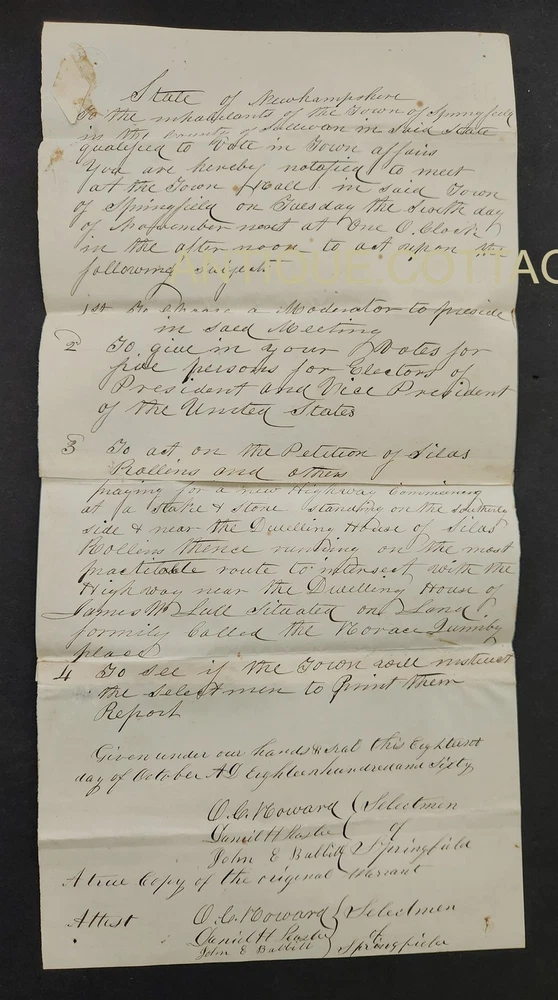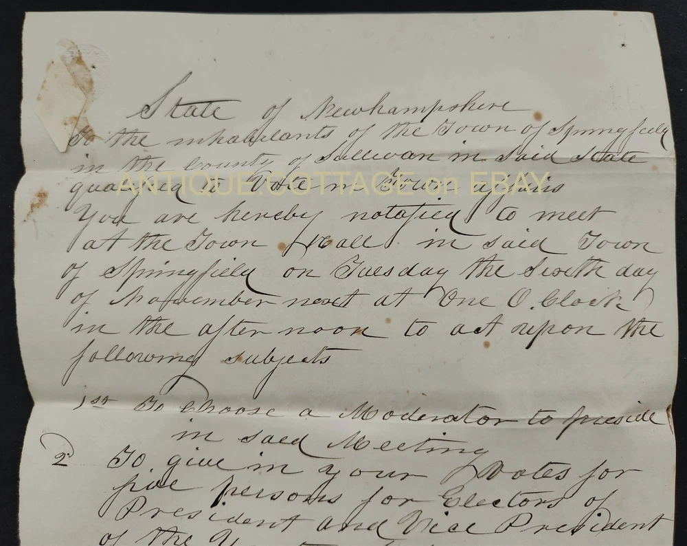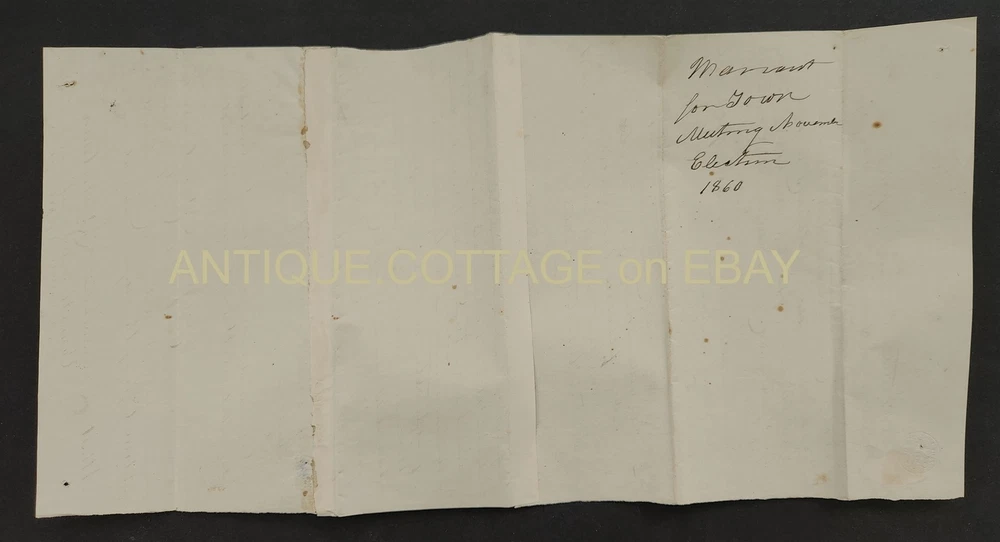 1860 antique SPRINGFIELD nh TOWN MEETING WARRANT voting presidential election SCROLL DOWN for MORE PHOTOS in DESCRIPTION Click HERE to view or search ANTIQUE.COTTAGE listings. This listing is for the paper shown. Requesting those eligible residents to meet to vote on the items identified in document. Excellent original early family and/or town genealogy, history, antique, collectible heirloom and/or ephemera. autograph CONDITION : See listing description and photos. - International buyers are responsible to pay VAT or other Taxes to their countries as required. - eBAY collects and remits sales tax on behalf of several states. If you are a dealer, you can write to eBay to file a form to become tax exempt. LOC: LOC2: PAPERBOX04-TMKT Powered by SixBit's eCommerce Solution