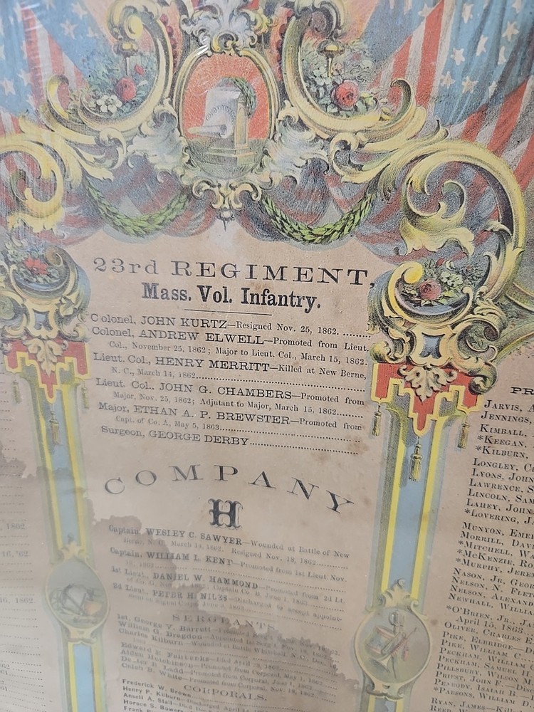 1863 Original Civil War Memorial Document Mass Vol Infantry Co H 23rd Regiment