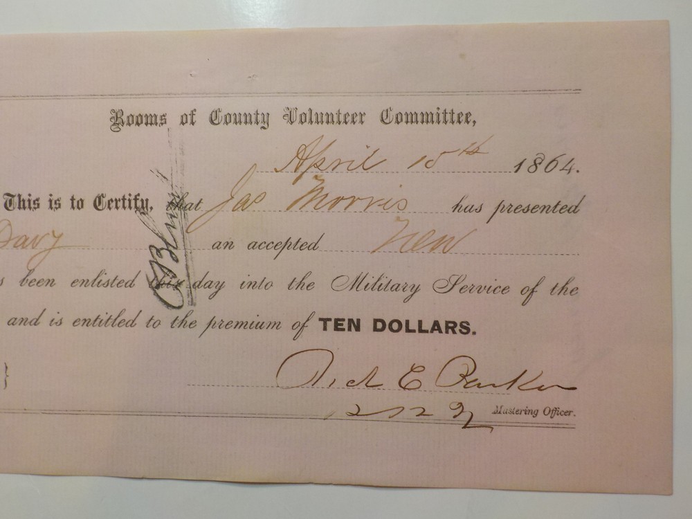 1864 Civil War Recruit Payment Document $10 Premium Military Paper VTG