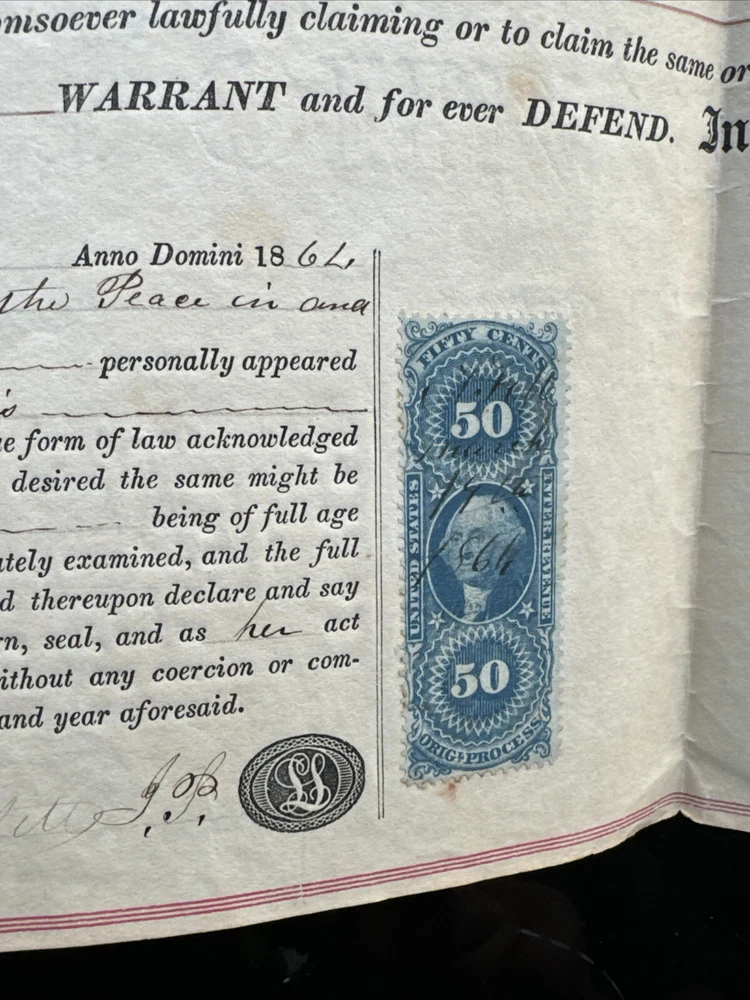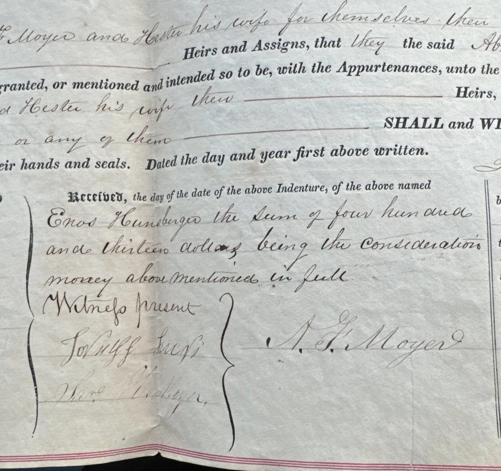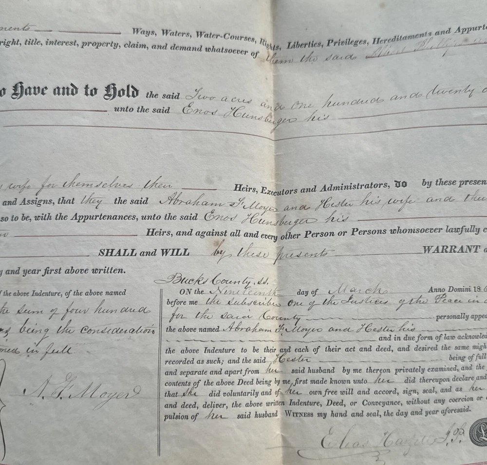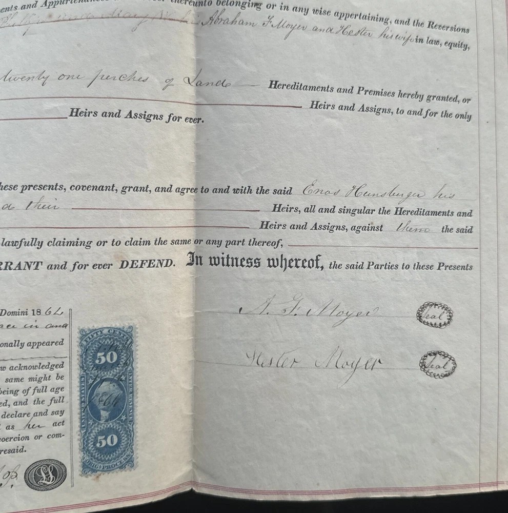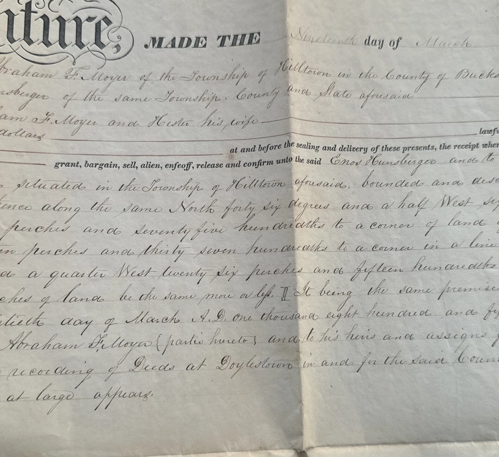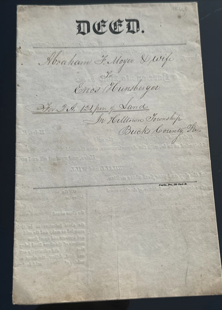 This antique land deed from 1864 is a fascinating piece of history. It shows the transfer of land from Abe F. Moyer to Enos Hunsberger in Hilltown Township, Bucks County, United States. The document is a testament to the rich heritage of the area and the people who lived there. The real estate transaction was between Abraham and his brother-in-law Enos Hunsberger. The deed is a collectible item for those interested in paper documents and historical land transfers. It is a valuable addition to any collection and a unique insight into the past. The document has been well-preserved and offers a clear view of the transaction that took place over 150 years ago. Biographical information: When Abraham Fretz Moyer was born on 19 September 1822, in Upper Salford Township, Montgomery, Pennsylvania, United States, his father, Abraham Bergey Moyer, was 37 and his mother, Elizabeth Fretz, was 41. He married Hester Hunsberger in 1844. They were the parents of at least 8 sons and 4 daughters. He lived in Franconia Township, Montgomery, Pennsylvania, United States in 1850 and Hilltown Township, Bucks, Pennsylvania, United States in 1860. He died on 4 February 1902, in Hilltown, Hilltown Township, Bucks, Pennsylvania, United States, at the age of 79, and was buried in Blooming Glen Mennonite Meetinghouse Graveyard, Blooming Glen, Hilltown Township, Bucks, Pennsylvania, United States.