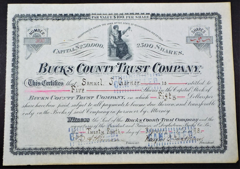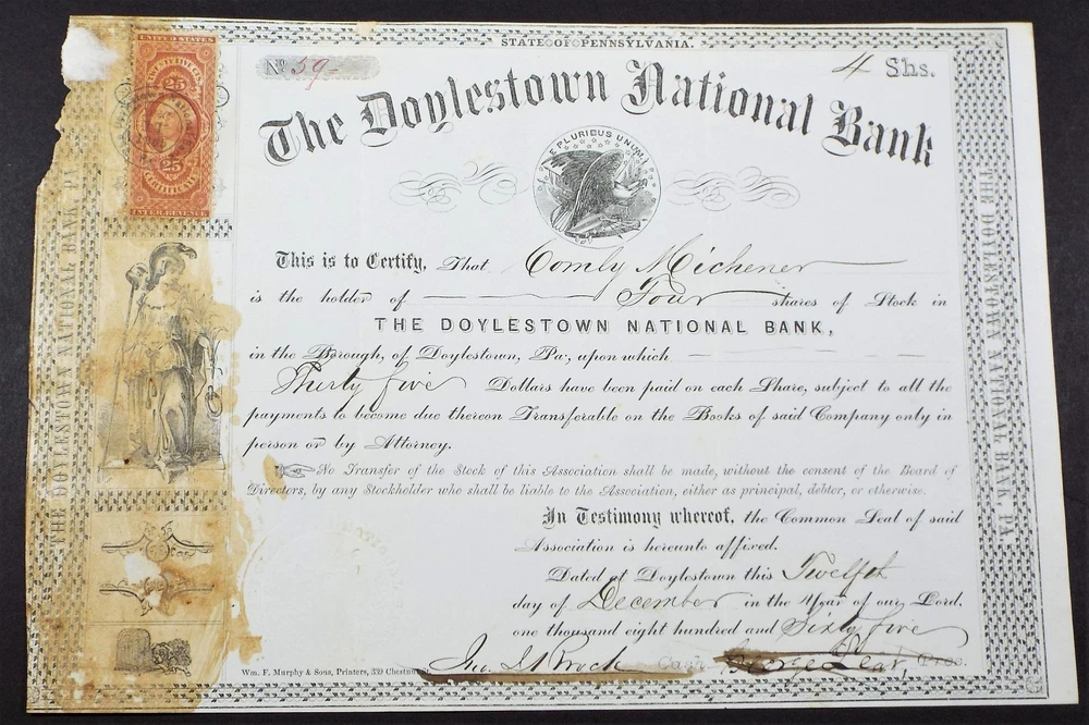 Both stock certificates were printed by Wm. F. Murphy & Sons, Phil. They have bank seals on the bottom left. The 1865 Doylestown certificate has 2 vertical folds and a 25 cent revenue stamp. The 1898 Bucks County certificate has 2 horizontal and 2 vertical folds. O ur store consists of over a thousand unique items, including antiques, vintage records, US and Foreign currency, stamps, BEP items, sea shells, old documents and more. We sell exclusively on ebay and list new items regularly. If you would like to check out our other listings or keep up on our new listings, click on "Visit store" above. If you have any questions about this item please contact us before purchasing. We strive for nothing less than 5 star feedback and 100% satisfied buyers. If for any reason you are not completely satisfied with your purchase, please contact us with any questions or concerns before leaving feedback. Thanks.