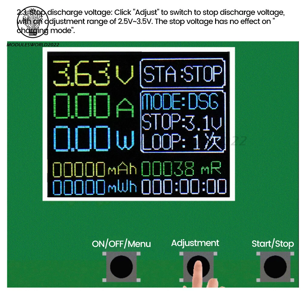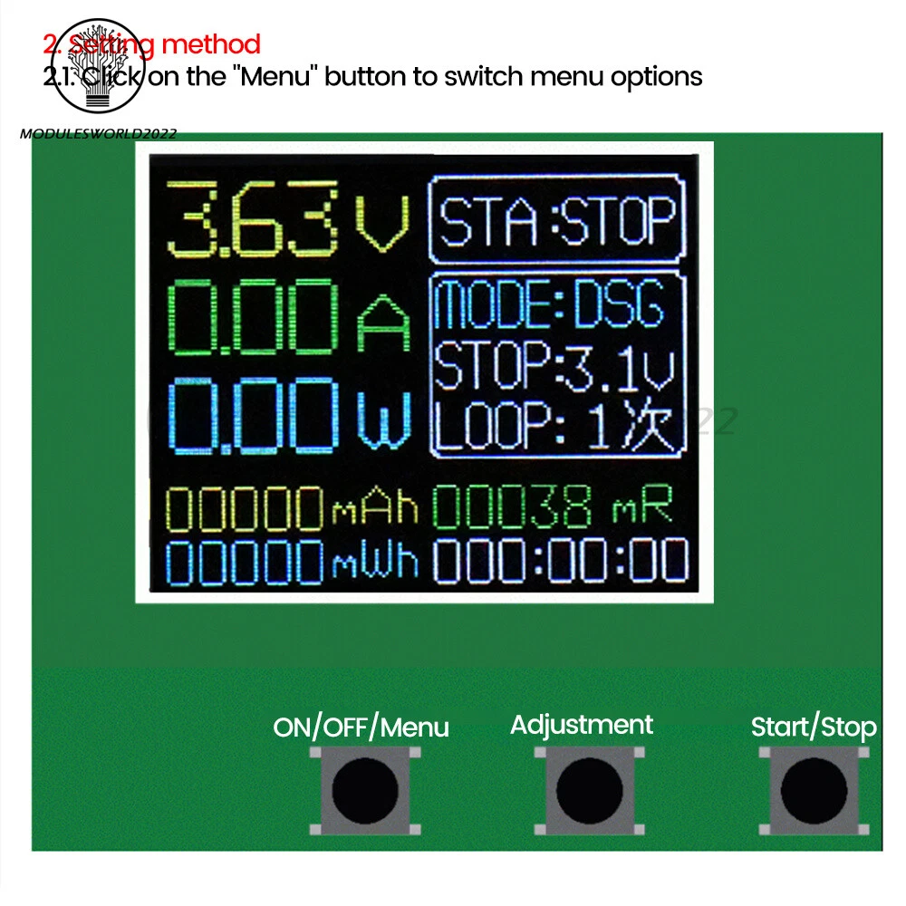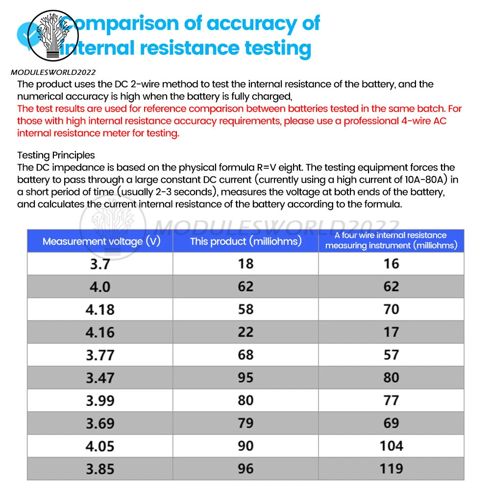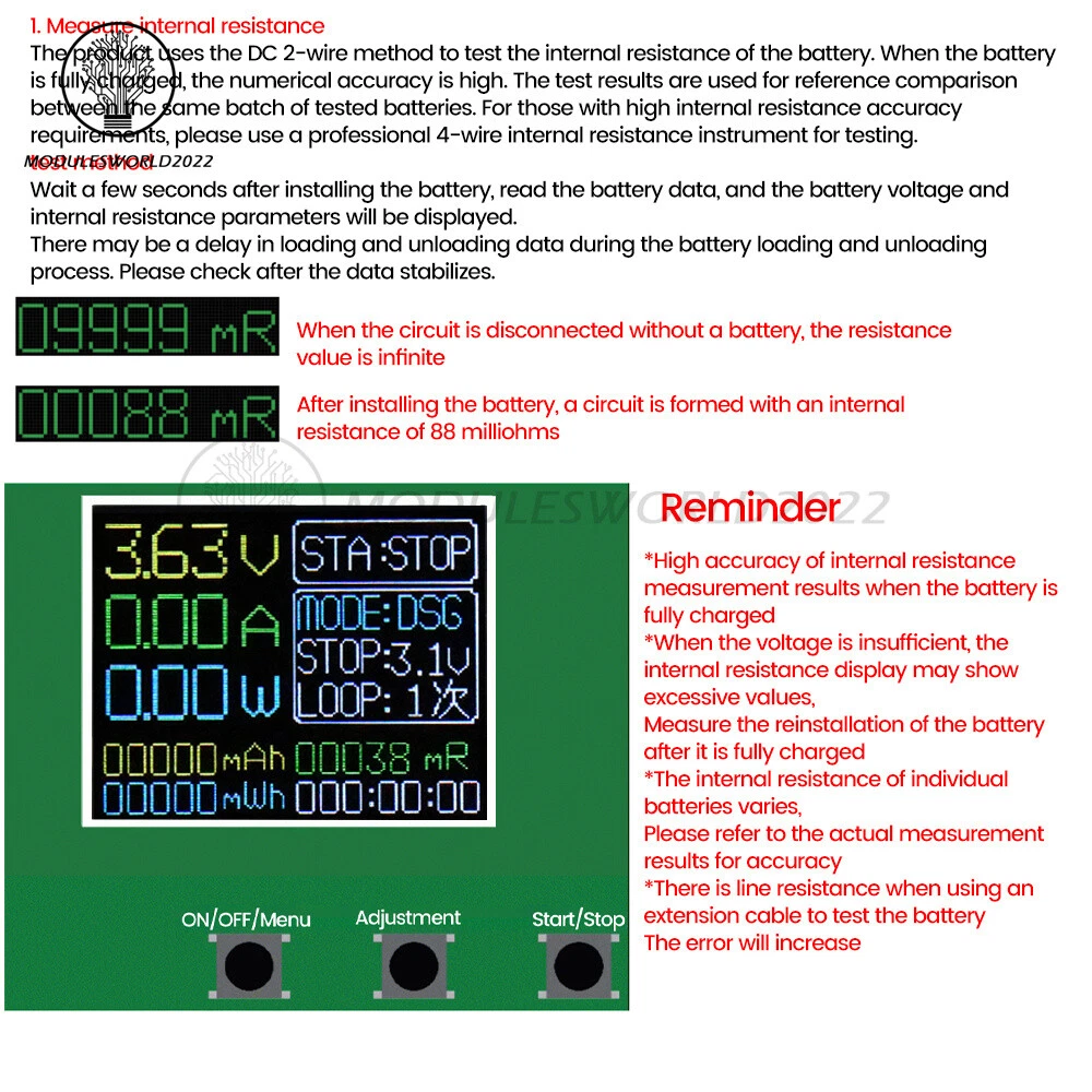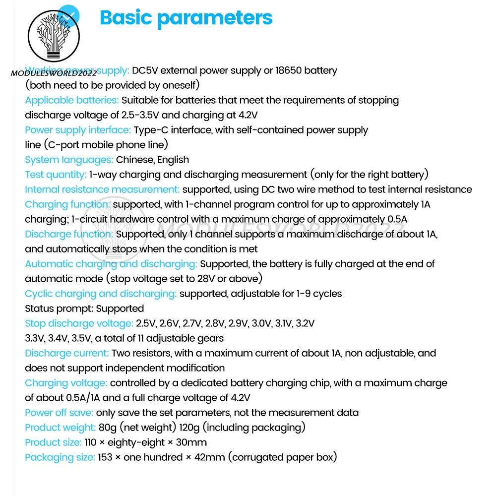 Store Categories Store Categories Other Product View Details Product Features: The product supports single-channel internal resistance and capacity measurement Supports individual charging and up to 9 charging/discharging cycles in automatic mode. Adopts DC two-wire method to test internal resistance. Compact battery holder for 18650 batteries, suitable for flat battery measurement. Maximum charging and discharging current is about 1A Note: The charging and discharging process will generate local high temperature, please ensure that the environment is open and uncovered, and if you can add a fan to dissipate the heat is preferred. In order to ensure that the battery clamps firmly, 18650 battery holder using a compact battery holder for flat battery measurement! Does not support lithium iron phosphate battery charging Power on/off: ①Power on automatically turn on ② power on state long press "ON/OFF/Menu" key to shut down. ③When the power is off without power failure, click "ON/OFF/Menu" key to turn on the power. Switch between Chinese and English interfaces: ①Turn off the power ② Press and hold the "Adjustment" key to power on, release the key after the screen lights up, turn on the power and wait for 10 seconds to shut down Turn off the power and wait for 10 seconds to turn off the power. Basic Parameters Power supply: DC5V external power supply or 18650 battery (both not include in package) Applicable batteries: meet the stop discharge voltage 2.5 ~ 3.5V, 4.2V charging batteries are applicable Power supply interface: Type-C interface System language: English/Chinese switchable Number of tests: 1-way charging and discharging measurement Internal Resistance Measurement: Support, using DC two-wire method to test internal resistance Charging function: support, 1 way program control maximum about 1A charging; 1 way hardware control maximum about 0.5A charging Discharging function: Support, only 1 channel supports max. 1A discharging, stop automatically when conditions are reached. Automatic charging and discharging: support, the battery is fully charged at the end of automatic mode (stop voltage setting 2.8V or above) Cycle charging and discharging: Support, 1~9 cycles adjustable Status Alert: Support Stop discharge voltage: 2.5V, 2.6V, 2.7V, 2.8V, 2.9V, 3.0V, 3.1V, 3.2V, 3.3V, 3.4V, 3.5V adjustable in 11 steps Discharge current: two-way resistance, maximum current of about 1A, not adjustable, does not support independent transformation Charging voltage: special battery charging chip control, maximum about 0.5A/1A charging, full voltage 4.2V Power failure save: only save the setup parameters, do not save the measurement data Data link: https://www.banber.com/gather/63f08fc5b2c1a900078b96bd Shipping List: 18650 battery capacity internal resistance tester X1 Shipping Policy Payment Method Returns Policy Shipping Policy Payment Method Returns Policy Home Payment Shipping About us Contact us Copyright©2018 datacaciques Home Payment Shipping About us Contact us Store Categories Store Categories Other Product View Details Product Features: The product supports single-channel internal resistance and capacity measurement Supports individual charging and up to 9 charging/discharging cycles in automatic mode. Adopts DC two-wire method to test internal resistance. Compact battery holder for 18650 batteries, suitable for flat battery measurement. Maximum charging and discharging current is about 1A Note: The charging and discharging process will generate local high temperature, please ensure that the environment is open and uncovered, and if you can add a fan to dissipate the heat is preferred. In order to ensure that the battery clamps firmly, 18650 battery holder using a compact battery holder for flat battery measurement! Does not support lithium iron phosphate battery charging Power on/off: ①Power on automatically turn on ② power on state long press "ON/OFF/Menu" key to shut down. ③When the power is off without power failure, click "ON/OFF/Menu" key to turn on the power. Switch between Chinese and English interfaces: ①Turn off the power ② Press and hold the "Adjustment" key to power on, release the key after the screen lights up, turn on the power and wait for 10 seconds to shut down Turn off the power and wait for 10 seconds to turn off the power. Basic Parameters Power supply: DC5V external power supply or 18650 battery (both not include in package) Applicable batteries: meet the stop discharge voltage 2.5 ~ 3.5V, 4.2V charging batteries are applicable Power supply interface: Type-C interface System language: English/Chinese switchable Number of tests: 1-way charging and discharging measurement Internal Resistance Measurement: Support, using DC two-wire method to test internal resistance Charging function: support, 1 way program control maximum about 1A charging; 1 way hardware control maximum about 0.5A charging Discharging function: Support, only 1 channel supports max. 1A discharging, stop automatically when conditions are reached. Automatic charging and discharging: support, the battery is fully charged at the end of automatic mode (stop voltage setting 2.8V or above) Cycle charging and discharging: Support, 1~9 cycles adjustable Status Alert: Support Stop discharge voltage: 2.5V, 2.6V, 2.7V, 2.8V, 2.9V, 3.0V, 3.1V, 3.2V, 3.3V, 3.4V, 3.5V adjustable in 11 steps Discharge current: two-way resistance, maximum current of about 1A, not adjustable, does not support independent transformation Charging voltage: special battery charging chip control, maximum about 0.5A/1A charging, full voltage 4.2V Power failure save: only save the setup parameters, do not save the measurement data Data link: https://www.banber.com/gather/63f08fc5b2c1a900078b96bd Shipping List: 18650 battery capacity internal resistance tester X1 Shipping Policy Payment Method Returns Policy Shipping Policy We will arrange shipping for you within 24 Hours after payment cleared except the holidays. -We ship items 