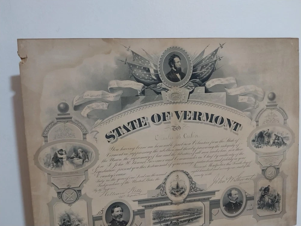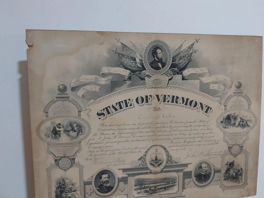 1871 Vermont Civil War Volunteer Certificate of Service document Charles BCarlin Diemensions : Approx 48.2 cm x 36.3 cm Terms of Sale Pictures are part of the item description YOU WILL GET EXACTLY WHAT YOU SEE ITS ONE SINGLE RARE PIECE AND NOT MADE IN A COMMERCIAL NUMBERS All items we sell are genuine guaranteed Shipping Information Economy shipping may take up to 60 days in some cases If your country is mentioned or excluded contact us first please . 😊 It takes less than 30 seconds to leave a Feedback 😊 Thanks for looking