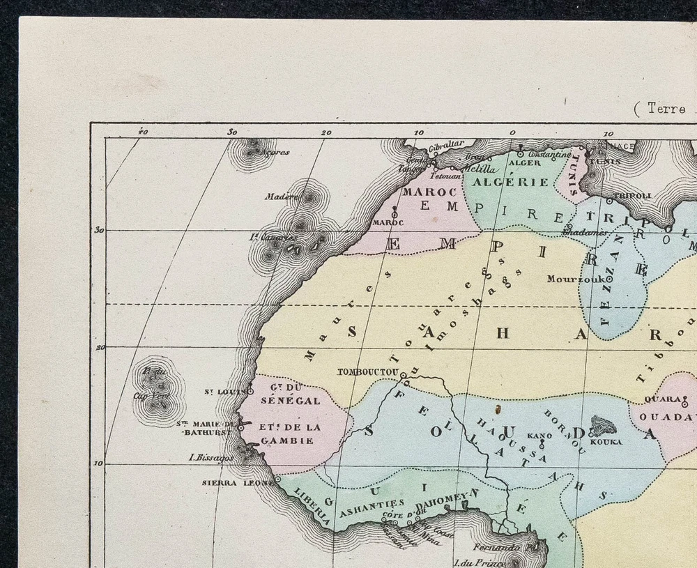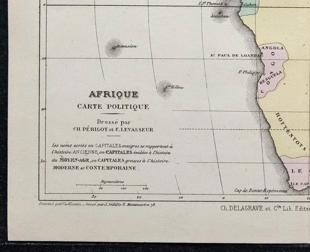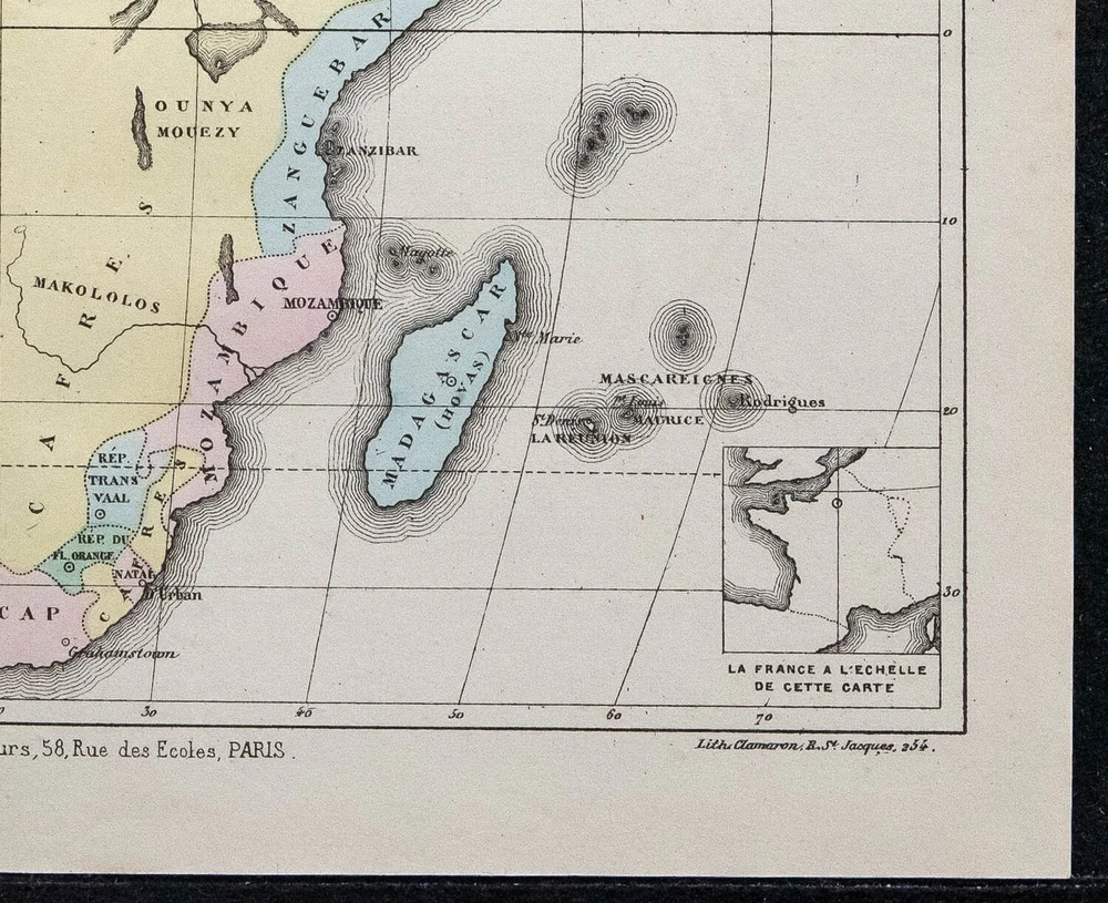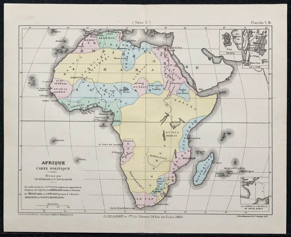 antique map certified authentic antique map entitled "Africa Political Map Drawn by Ch. Perigot & E. Levasseur". Color lithograph. Map authentic published by Delagrave in 1874. This is a political Map of Africa, showing the territorial divisions and empires of the time. The Map shows different regions of Africa with distinct colors for each territory. At the top right there is a small additional Map showing Tunis and Lecaire and its surroundings as well as France at the same scale for comparison. The names of the territories and major cities are shown on the Map . By 1874, interest in political maps was growing due to European colonial expansion in Africa. This Map represents a snapshot of the geographical and political knowledge of this period, before the definitive colonial division of the African continent during the Berlin Conference (1884-1885). Certificate of authenticity available upon request. Quality shipping with suitable protection, carried out by our company specializing in the sale of old engravings around geography. Dimensions: 18 x 22.50 cms Please look carefully at the photos. Good condition. Double board with central fold. Professional in the sale (and passion) of historical and geographical engravings, I will ship your purchase with the greatest care as I myself would like to receive it. My products are guaranteed to be vintage and will delight any history enthusiast or simply lover of these authentic visuals that have stood the test of time. Your advantages & guarantees: Consolidation of shipping costs in case of multiple purchases (Ask for the total before paying). Authenticity guaranteed. Carefully shipped between two rigid supports or rolled in a tube, in order to reduce any risk of deterioration during transport (Will be shipped in the original folds if there are any). Return within 14 days if you are not satisfied! Quick response to any request (information, research, negotiations, etc.). Possible change of shipping method. All the services and guarantees of a professional seller who loves his products. For the French overseas departments and territories, contact me for a more precise (and more advantageous!) shipping cost amount. Combining history and geography, the collection of old engravings and maps will remain one of the strongest symbols of its owner's erudition and escape. Please look at the pictures. You buy what you see. Shipping Photos Terms and Conditions Carefully shipped in a rigid support or tube depending on the case. Certificate of authenticity on request at the time of order. Do not hesitate to group your purchases to save on shipping costs (Contact us before paying), by visiting our Ebay store or by consulting our sales . We are professionals in the sale of old maps (antique map), engravings, atlases... We take our photos with a professional camera to ensure you get the best image quality possible before your purchase. We try to reproduce the colors and whites faithfully. However, each image will have a different rendering depending on the quality and type of your screen. For any return, the packaging must be of superior quality. You must provide us with a photo of the item and its shipping method before returning it. We try to describe our items as best we can. However, it is impossible to describe exactly every small stain, micro tear or every action of time. For the rest, the photos will serve as descriptions. Uncollated works. Dimensions with a margin of error of approximately 2 cm. You will need to pay any customs taxes outside the EU. Please see the full T&Cs at the bottom of this ad. antique map entitled "Africa Political Map Drawn by Ch. Perigot & E. Levasseur". Color lithograph. Map authentic published by Delagrave in 1874. This is a political Map of Africa, showing the territorial divisions and empires of the time. The Map shows different regions of Africa with distinct colors for each territory. At the top right there is a small additional Map showing Tunis and Lecaire and its surroundings as well as France at the same scale for comparison. The names of the territories and major cities are shown on the Map . By 1874, interest in political maps was growing due to European colonial expansion in Africa. This Map represents a snapshot of the geographical and political knowledge of this period, before the definitive colonial division of the African continent during the