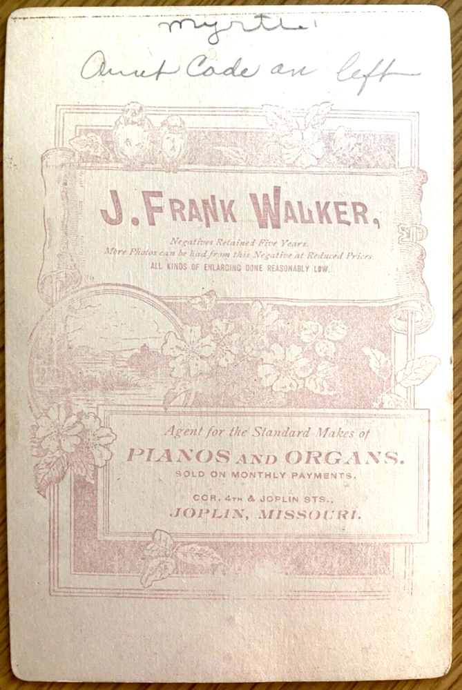 Two sisters Myrtle & Cade Antique cabinet card photograph 1880s Photo taken by J.F. Walker of Joplin, Missouri Size of photo is 4.25"x 6.5" inches Visit our store for 2,000+ items – Thank You!