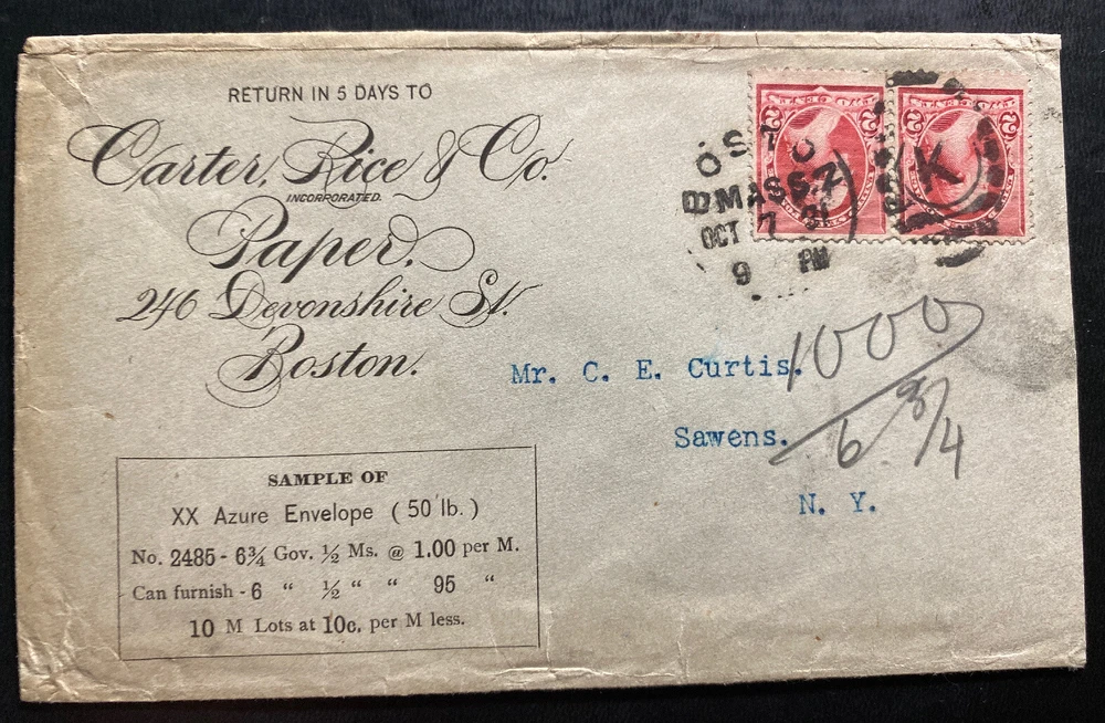 Up for auction is a beautiful advertising meter Cancel cover from Boston Ma USA to Sawens . Postmarked in 1881 . Excellent condition. Great franking, cancels and cachet. Caster Rice Paper .