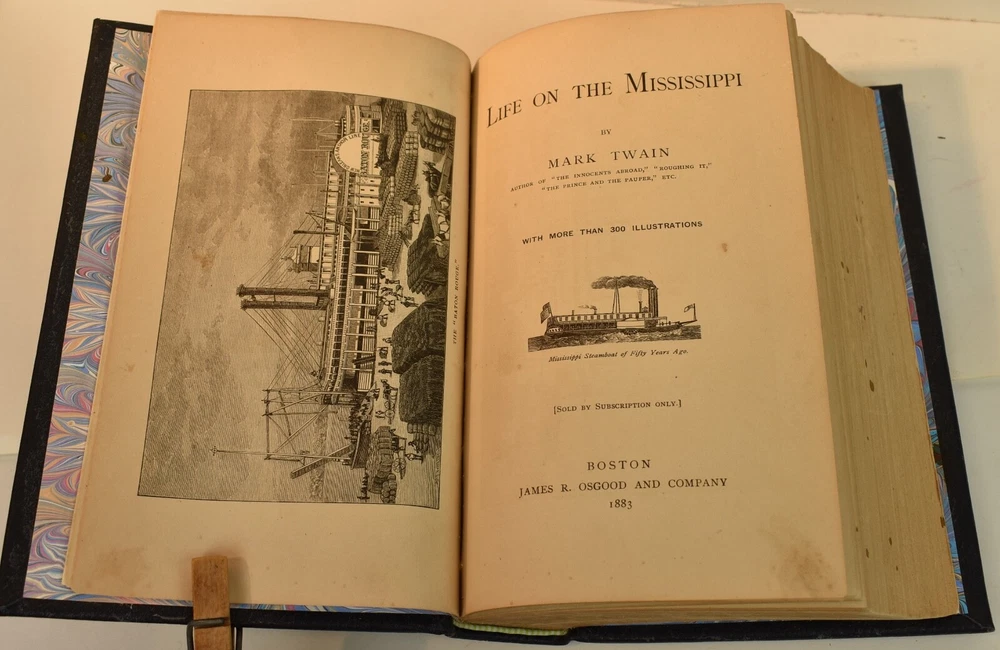 LIFE ON THE MISSISSIPPI Written by Mark Twain and published by James R. Osgood and Company, Boston; copyright 1883. This is the first edition; second state with 1883 on the title page and without “Twain in flames” (this image disturbed Twain’s wife Olivia) on page 441, and with St. Louis Hotel corrected to St. Charles Hotel on page 443. Like most of Twain’s book’s published in the 19th century, this book is profusely illustrated with 316 illustrations. The illustrations comprise an integral part of the book’s humor. This book has been rebound into a new leather binding that features hand-carved and colored inlay. It also comes in a similar leather clamshell box. All leather carving and coloring was done by me. Designs were taken from the original artwork in the book which were done many years ago by E. H. Garrett, Frank Merrill and John J. Harley LIFE ON THE MISSISSIPPI is a memoir by Mark Twain, of his days as a steamboat pilot on the Mississippi River before the American Civil War, and also a travel book, recounting his trip along the Mississippi many years after the Civil War. Twain once remarked that he considered this book his masterpiece, and that it would outlive his other works and endure as a classic. The book begins with a brief history of the river from its discovery by Hernando de Soto in 1542. It continues with anecdotes of Twain's training as a steamboat pilot, as the 'cub' of an experienced pilot. He describes, with great affection, the science of navigating the ever-changing Mississippi River in a section that was first published in 1876, entitled "Old Times on the Mississippi". In the second half, Twain narrates his trip many years later on a steamboat from St. Louis to New Orleans. He describes the competition from railroads, and the new, large cities, and adds his observations on greed, gullibility, tragedy, and bad architecture. He also tells some stories that are most likely tall tales. Simultaneously published in 1883 in the United States and Great Britain, it is said to be the first book submitted to a publisher as a typewritten manuscript. DESCRIPTION: 624 pages 8 3/4 x 6 inches unique artist designed leather bound hardcover with original 1883 First Edition Mark Twain text block CONDITION: This hard-cover book is in fine condition with a custom slip-case. The book has been rebound in full navy cowhide that has leather inlays that are hand-carved, dyed, tooled and colored by me—Bookpa. The interior is completely original with all pages and illustrations present. The book has been bound with new marbled paper (made by me) endpapers. The book is very old but is in remarkable condition considering that it is 130+ years old. The paper shows age toning but is clean overall. The paper shows age toning—as is the case with nearly all examples of this book because early pulp paper was used. This book may have been in a library at one time, although there are no stamps, numbers, pockets, etc., the margins have been cut down about 1/4” in length and width which was a common practice with library books. The interior is otherwise mostly clean with no foxing, major grubbiness or staining. There are a few smudges or finger-marks. I have pictures of the worst. There is a name and date (1887) written on the first blank endpaper. Binding and hinges are excellent as the book was rebound using traditional methods and non-acidic materials. The book is capable of being read using proper care if you so desire. The box is hand-made with heavy red leather with a hand-carved and stamped, colored leather inlay on the front or top panel. The interior of the box is covered with linen. BECAUSE MEDIA RATE SHIPPING IS FREE ON THE BOOKS I SELL, COMBINE THIS WITH OTHER ITEMS FROM MY EBAY STORE. I AM AN EXPERIENCED EBAY SELLER (23+ YEARS) AND SHIPPER WITH 100% (always!--since 1997!) FEEDBACK RATING. ALL ITEMS ARE CAREFULLY AND SECURELY PACKED TO REDUCE OR ELIMINATE DANGER OF CRUSHING AND OR WATER/MOISTURE DAMAGE. ALL BOOKS ARE SHIPPED IN STURDY BOXES WITH TRACKING AND DELIVERY CONFIRMATION INCLUDED. I PERSONALLY GUARANTEE ALL OF THE BOOKS, AUTOGRAPHS AND SIGNATURES ON BOOKS I SELL.