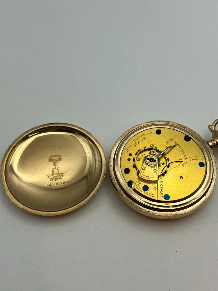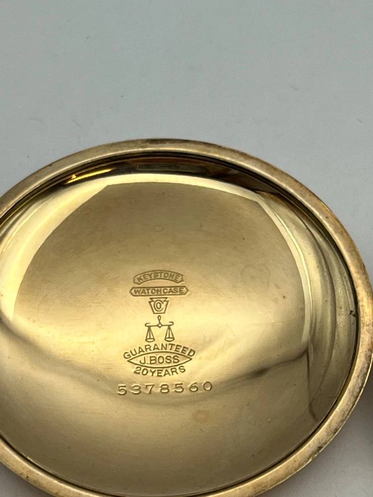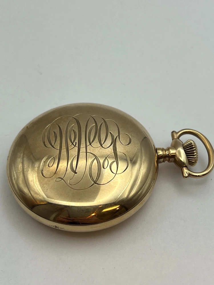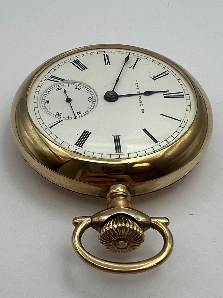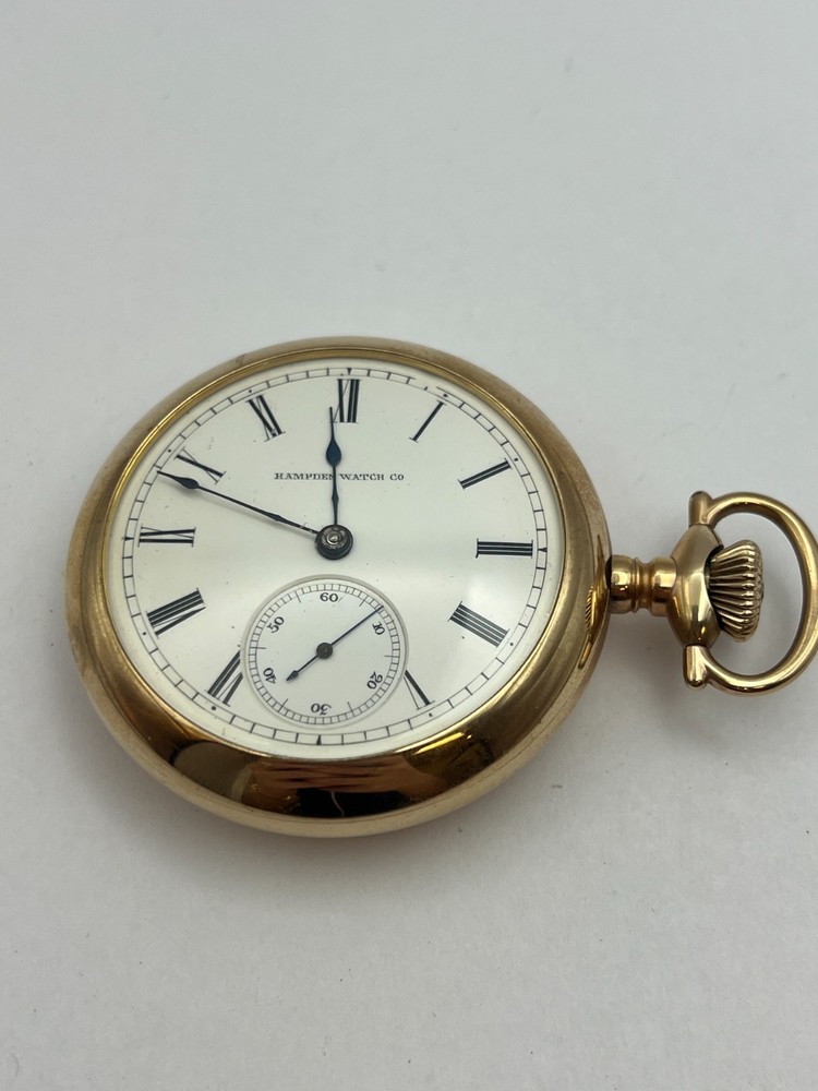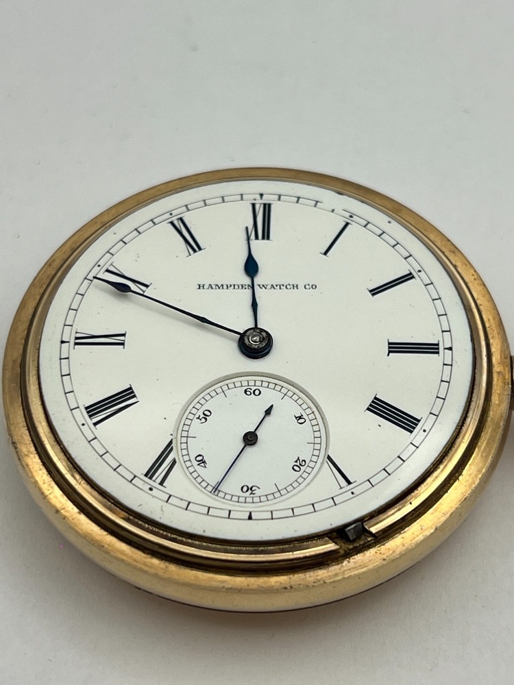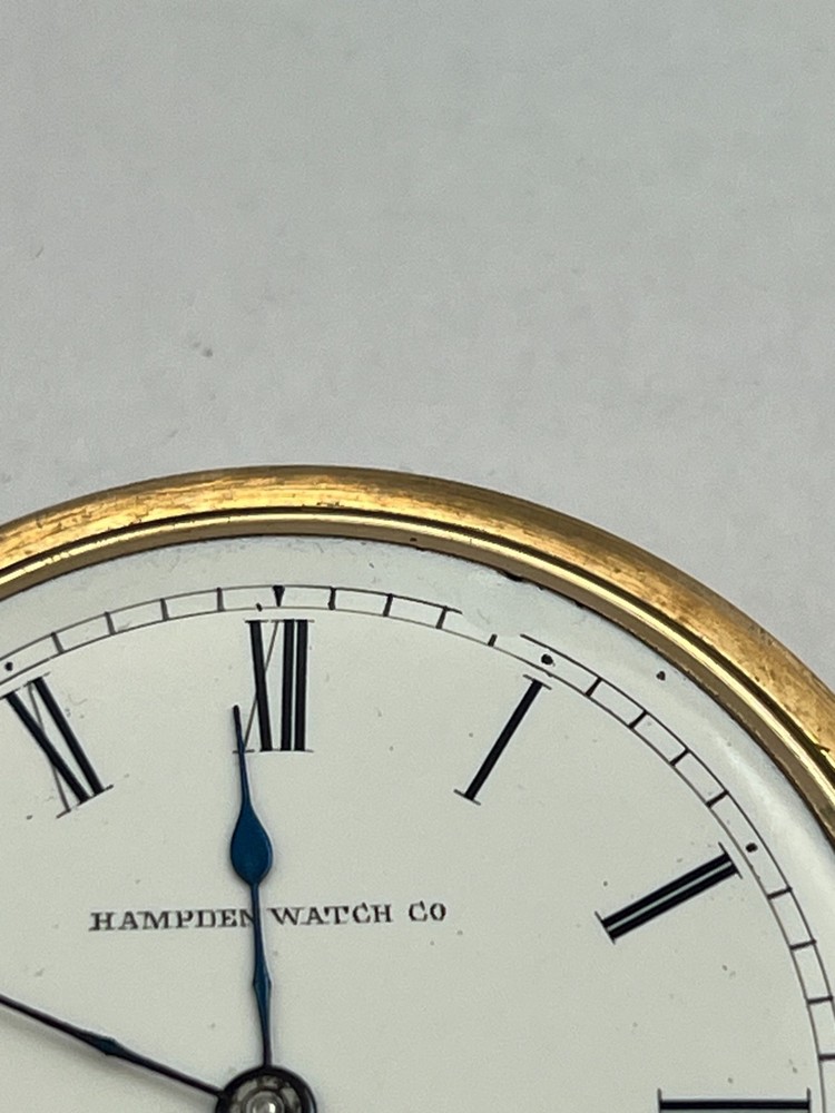 1. This vintage Hampden pocket watch is a stunning piece of history! The dial is remarkably clean with just a tiny crack near the 1, barely noticeable. It runs smoothly and comes securely packaged for safe delivery. A fantastic find for any collector—love the classic engraved details!