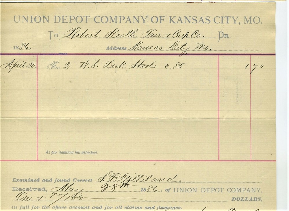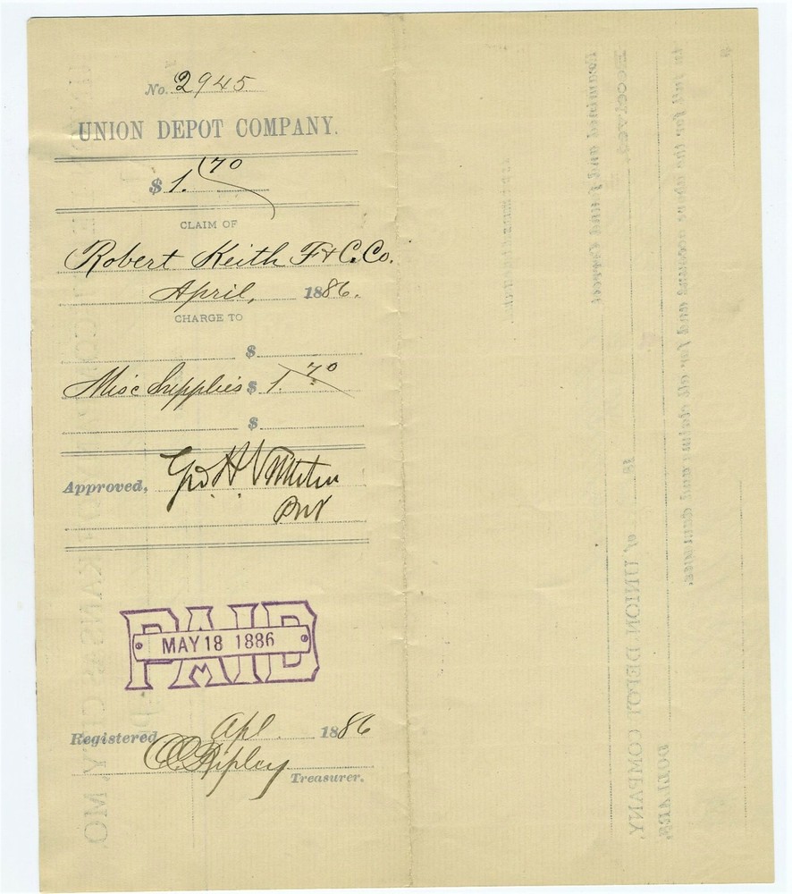 GRAPHIC 1886 BILLHEAD AND UNION DEPOT VOUCHER KANSAS CITY MISSOURI , ROBERT KEITH FURNITURE & CARPET CO. 2 PCS ORIGINAL. JOBBER AND RETAILERS IN FURNITURE, CARPETS, OILCLOTHS AND CURTAINS ADDRESS: 811, 813, MAIN ST. PRESIDENT: ROBERT KEITH VOUCHER SIGNED BY RAILROAD MOGUL, GEORGE NETTLETON SOLD TO: UNION DEPOT TRAIN STATION (NOT TO BE CONFUSED WITH THE MORE MODERN UNION STATION). SEE MY STORE: VINTAGE HARDWARE STORE COLLECTIBLES George H. Nettleton Railroad Baron 1831-1896 by Daniel Coleman At the peak of his career, George Nettleton lived in a West Bluffs mansion overlooking the Kansas City Stock Yards and Union Depot, both of which he managed in addition to the 800 miles of railroad track and 2,000 employees under his command. Nettleton was as close to a railroad baron as Kansas City could boast in the late 1800s, with the exception that he was not an owner of the various lines he controlled. George H. Nettleton was born November 13, 1831, in Chicopee Falls, Massachusetts, located just northwest of Springfield. The 1850s saw Nettleton’s career as an engineer advancing steadily along with the miles of track laid by the various railroads for which he worked. . He served for a time as an assistant, then general superintendent of the Hannibal & St. Joseph Railroad. The Hannibal Bridge opened under Nettleton’s watch in 1869. Nettleton was also instrumental in the laying of one of the earliest rail lines in the Kansas City area when he oversaw completion of the Cameron to Kansas City road. In 1872, Nettleton became the general superintendent of the Atchison, Topeka & Santa Fe Railroad, and from his headquarters in Topeka, Kansas, supervised the line’s extension as far as the state’s western border. He moved to Kansas City in 1874 and turned his attention toward developing the growing transportation center his railroad endeavors had helped to create. He organized and managed the Kansas City Stockyards, and, at the helm of the Union Depot Company, administered the city’s first major railroad station and yards in the West Bottoms. Nettleton was an important link to eastern capitalists who backed Kansas City business ventures. He helped incorporate the First National Bank of Kansas City and served as president of the Fort Scott & Memphis Railway. In the early 1890s, they built a 12-room, brick mansion on the West Bluffs at 7th Street overlooking Nettleton’s industrial domain, but he died only a few years later at age 64, on March 26, 1896. In 1900, Julia Nettleton donated the structure to be used as a home for elderly women, and although these occupants moved to new quarters in 1917. ORIGINAL, LETTERHEADS, BILLHEAD, BILLHEADS, HARDWARE.