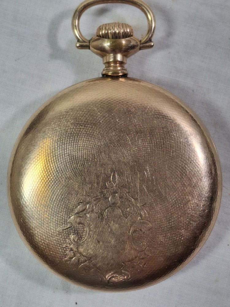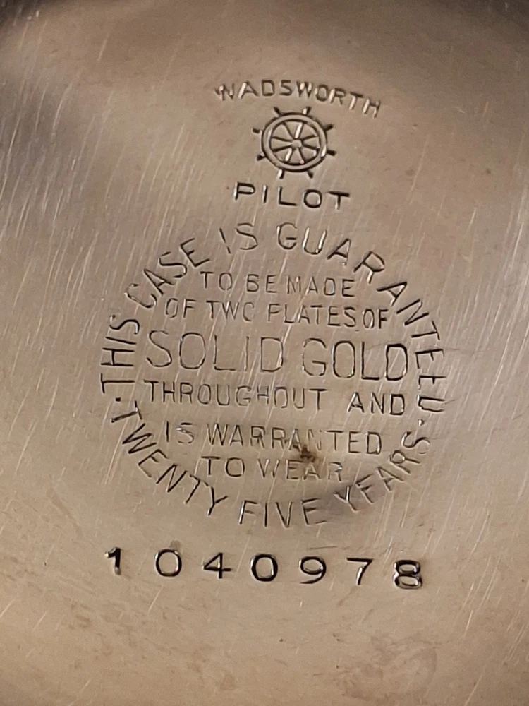 The 1896 Wadsworth Pilot Pocket Watch is a luxurious timepiece with a solid yellow gold plate and a matte finish. This double plate watch features an Arabic numeral dial, 12-hour dial, and a white color scheme. It has been wound and found operational, but not tested for accuracy or duration. Manufactured in the United States in the late 19th century Illinois Watch Co,, this open-faced pocket watch is a timeless piece that exudes elegance and sophistication. Perfect for both men and women, this Wadsworth pocket watch is a classic accessory that adds a touch of luxury to any outfit.