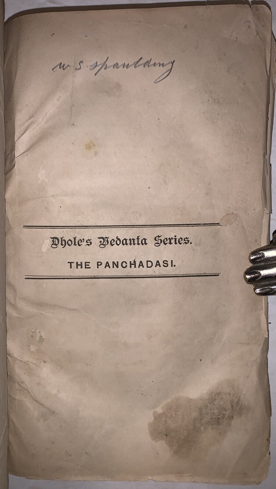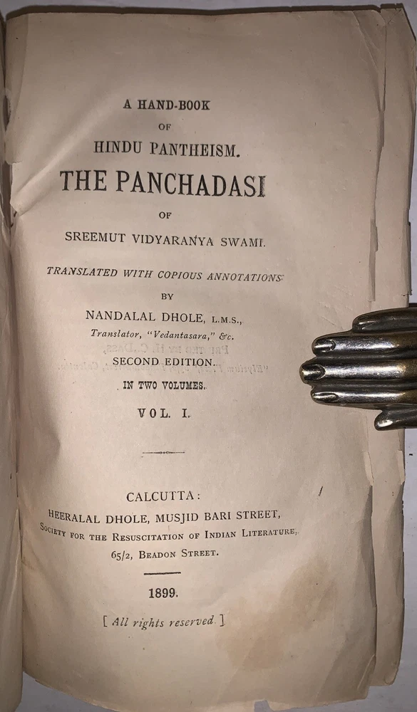 A Hand-Book Of Hindu Pantheism The Panchadasi Of Sreemut Vidyaranya Swami Translated with Copious Annotations by Nandalal Dhole, L.M.S. Second Edition Two Volumes in One Calcutta: Heeralal Dhole 1899-1900 Octavo, 333 pages, publisher's original brown wraps. Title in manuscript to top wrap. Top wrap and the first few pages are a little loose. Some tears to wraps and spine, rubbing and wear, some discoloration, previous owner's inscription, else in good + condition. A Handbook of Hindu Pantheism: The Panchadasi of Sreemut Vidyaranya Swami is a comprehensive English translation and commentary on the Panchadasi, a seminal text of Advaita Vedanta attributed to the 14th-century philosopher Vidyaranya Swami. The Panchadasi explores the nature of ultimate reality, the self, and liberation, emphasizing the non-dualistic philosophy of oneness between the individual soul (Atman) and the universal consciousness (Brahman). Divided into fifteen chapters, the text is grouped into three sections—Viveka (discrimination), Deepa (illumination), and Ananda (bliss)—each addressing a specific aspect of spiritual realization. This edition serves as an accessible guide to the profound teachings of Hindu pantheism, bridging ancient Sanskrit philosophy with modern readers through detailed explanations and insights. It remains a vital resource for those seeking to understand Hindu metaphysics and the principles of Advaita Vedanta. If you have any questions, feel free to ask, and don't forget to check out my other listings.