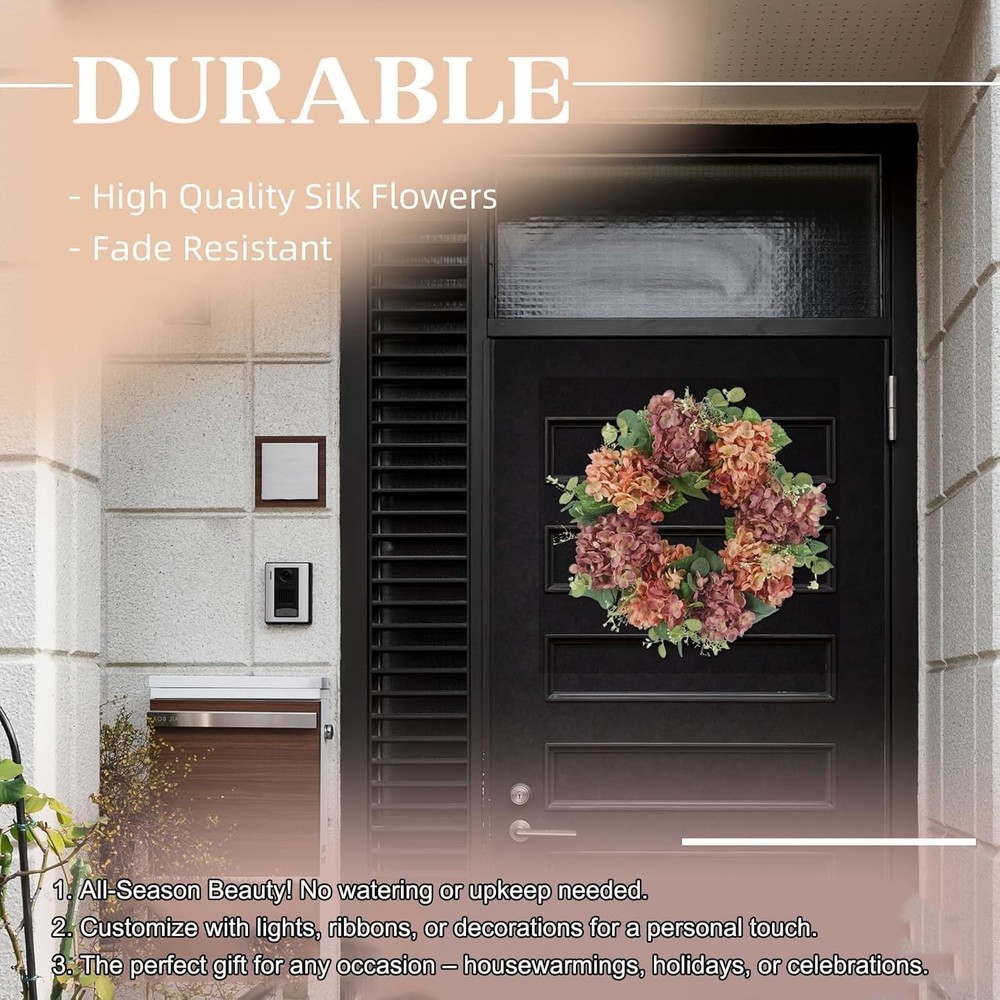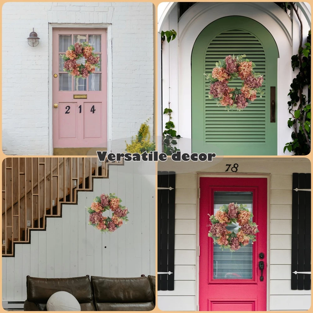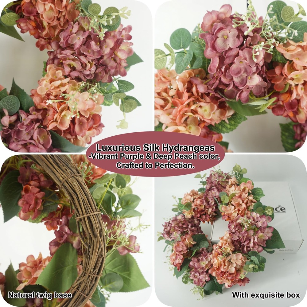 Vibrant Design: front door wreath boasts a mixture of peach-pink and light purple silk hydrangea blooms, eucalyptus & hydrangea leaves, and other realistic plastic plants, bringing a touch of fresh, natural beauty. The natural twig base adds a rustic charm to the summer wreath Vibrant Design: front door wreath boasts a mixture of peach-pink and light purple silk hydrangea blooms, eucalyptus & hydrangea leaves, and other realistic plastic plants, bringing a touch of fresh, natural beauty. The natural twig base adds a rustic charm to the summer wreath High Quality: This 100% handcrafted wreath for front door is arranged by professional florists, and made from realistic flowers and greenery that are non-toxic, durable, and fade-resistant Versatile Decor: This 18-inch flower wreath (10-inch inner diameter) is ideal for both indoor and outdoor use. Hang it on your front doors, living room walls, windows, fireplaces, or cabinets, or even use it as a dining table centerpiece. It’ll add a romantic festive touch wherever it's placed Easy to Hang: The summer wreath for front door outside is compressed for better packing and shipping. Once received, just take a couple of minutes to fluff to reshape the front door wreath so as to get a full and beautiful one, and simply hang it up and enjoy the burst of colors it brings! Exquisite Surprise: Encased in a meticulously designed box, this captivating front door wreath serves as a remarkable gesture for housewarmings, birthdays, or even to celebrate Mother's Day. It's a heartfelt way to share the joy of the season with cherished friends and family. Should you require any further information regarding this exquisite wreath, kindly reach out to us