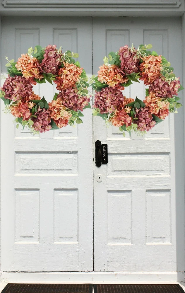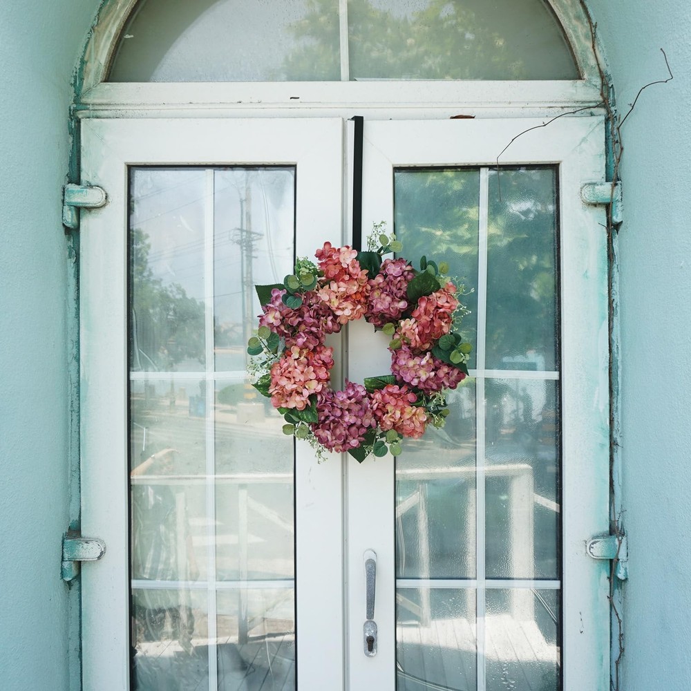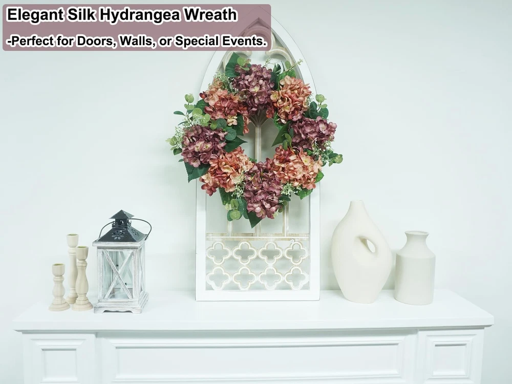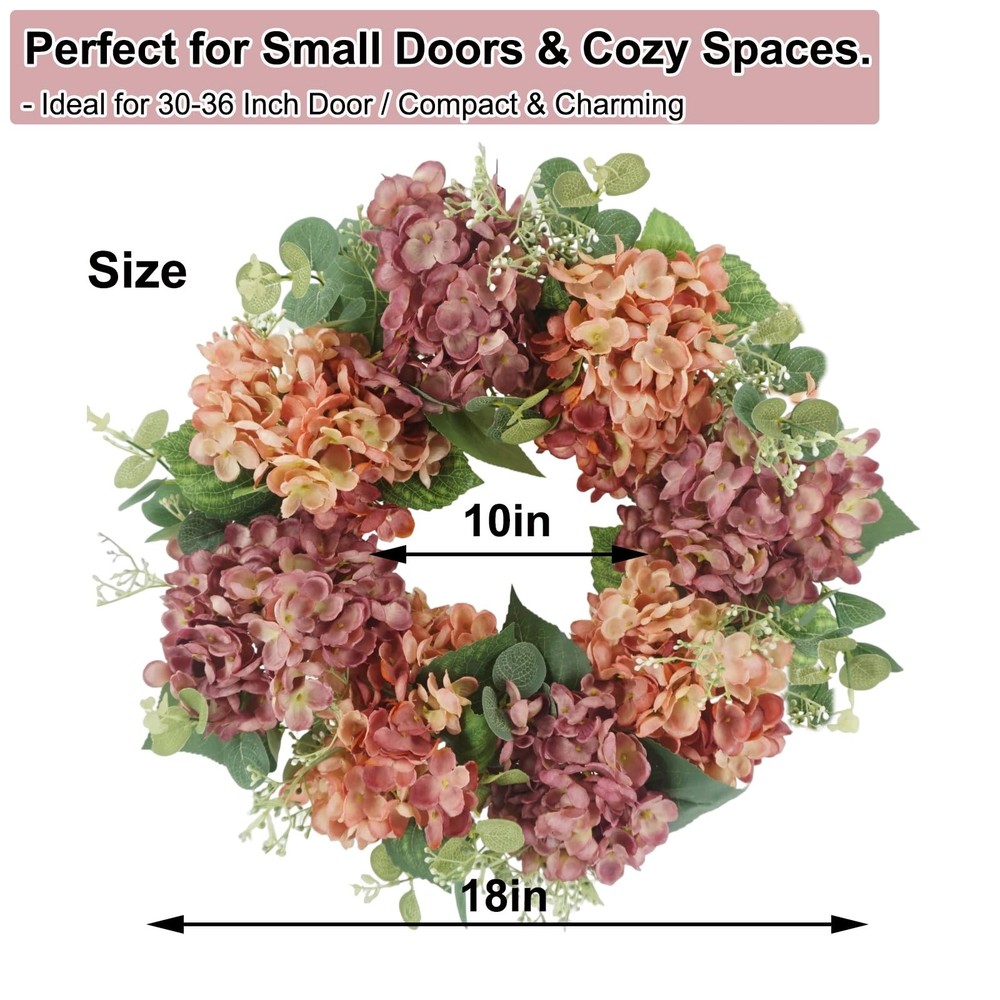 Vibrant Design: front door wreath boasts a mixture of peach-pink and light purple silk hydrangea blooms, eucalyptus & hydrangea leaves, and other realistic plastic plants, bringing a touch of fresh, natural beauty. The natural twig base adds a rustic charm to the summer wreath Vibrant Design: front door wreath boasts a mixture of peach-pink and light purple silk hydrangea blooms, eucalyptus & hydrangea leaves, and other realistic plastic plants, bringing a touch of fresh, natural beauty. The natural twig base adds a rustic charm to the summer wreath High Quality: This 100% handcrafted wreath for front door is arranged by professional florists, and made from realistic flowers and greenery that are non-toxic, durable, and fade-resistant Versatile Decor: This 18-inch flower wreath (10-inch inner diameter) is ideal for both indoor and outdoor use. Hang it on your front doors, living room walls, windows, fireplaces, or cabinets, or even use it as a dining table centerpiece. It’ll add a romantic festive touch wherever it's placed Easy to Hang: The summer wreath for front door outside is compressed for better packing and shipping. Once received, just take a couple of minutes to fluff to reshape the front door wreath so as to get a full and beautiful one, and simply hang it up and enjoy the burst of colors it brings! Exquisite Surprise: Encased in a meticulously designed box, this captivating front door wreath serves as a remarkable gesture for housewarmings, birthdays, or even to celebrate Mother's Day. It's a heartfelt way to share the joy of the season with cherished friends and family. Should you require any further information regarding this exquisite wreath, kindly reach out to us
