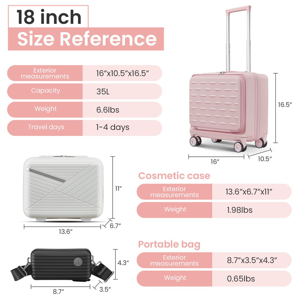 This 18" carry-on is a game-changer for travel! The front-open door and laptop interlayer make access super convenient, while the TSA lock adds security. The hard shell feels durable yet lightweight, and the spinner wheels glide smoothly. Love the included crossbody and cosmetic bags—perfect for keeping essentials organized. The stylish pink color stands out, and it fits airline requirements. Highly recommend for hassle-free trips!