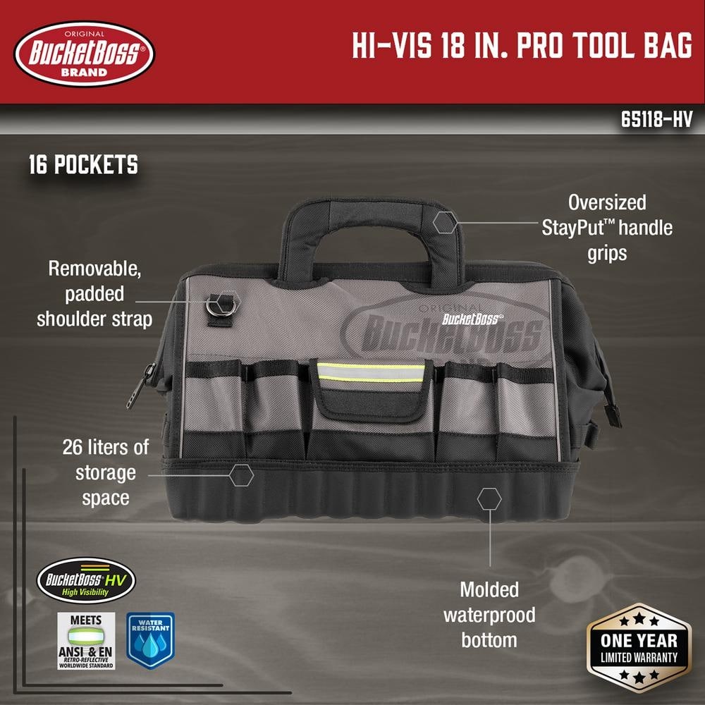 Heavy-duty 1680d tool storage bag w/14 total pockets Carry your tools w/you w/oversized StayPut? handle grips Removable shoulder strap,side pull handles & waterproof zipper Today,Bucket Boss carries over 100 different products that organize and hold tools in the strongest,most efficient ways. For 30 years,we have prided ourselves in creating durable products that can withstand many years of wear and tear. We strive to stay ahead of the pack by constantly upgrading features and using the best quality materials on the market to create the best product for our end users. From the Bucket Boss Professional HV High-Visibility Series,the 18"HV Pro Tool Bag is for those who demand only the best! Equipped w/3M Scotchlite Retro Reflective that meets ANSI and EN1150 ... Urintelligentbi Hello, respected customer 18"High Visibility Professional Tool Bag Heavy-duty 1680d tool storage bag w/14 total pockets Carry your tools w/you w/oversized StayPut? handle grips Removable shoulder strap,side pull handles & waterproof zipper Today,Bucket Boss carries over 100 different products that organize and hold tools in the strongest,most efficient ways. For 30 years,we have prided ourselves in creating durable products that can withstand many years of wear and tear. We strive to stay ahead of the pack by constantly upgrading features and using the best quality materials on the market to create the best product for our end users. From the Bucket Boss Professional HV High-Visibility Series,the 18"HV Pro Tool Bag is for those who demand only the best! Equipped w/3M Scotchlite Retro Reflective that meets ANSI and EN1150 worldwide standards for high-visibility and jobsite safety. Features the famous Gatemouth wire frame technology,which keeps the bag open for easy access. Constructed w/heavyweight 1680 2-ply poly fabric and boasting a molded,waterproof bottom to protect bag contents. Other features include a waterproof zipper to keep contents dry,StayPut handle grips that remain in an upright position for easy gripping,14 total tool pockets,and ID window for business or name card,and pull handles on both ends of the bag for easy retrieval from the truck. A detachable,padded "boomerang" shoulder strap can be adjusted for a customized fit. 1680 heavy-duty poly fabric Molded,waterproof bottom and oversized stay put handle grips HV retro-reflective meets EN1150 worldwide standard 8 internal pockets,7 external Removeable shoulder strap and side pull handles and waterproof zipper I.D. window and 26 l of storage space Tools not included Color Family:Gray|Color/Finish:Gray/Black|Denier:1680|Features:Zippered Top|Holding Capacity (cu in.):25 cu in|Included Accessories:Shoulder Strap|Material:Polyester|Number of Pockets:15|Number of inside pockets:8|Number of outside pockets:7|Pack Size:1|Product Weight (lb.):4.75 lb|Returnable:90-Day|Tool Bag Grade:Heavy Duty|Tool Bag Type:Bag/Tote|Tool Storage Product Type:Bag/Tote|Tools Product Type:Tool Storage|Nominal Width (in.):18 in|Product Depth (in.):11 in|Product Height (in.):12 in|Product Width (in.):18 in Item Specifics UPC 721415651181 MPN 65118-HV Brand Unbranded Type Tool Bags Payment [ 1. We accept Paypal. Each buyer's payments is protected by Ebay. 2. Payment time affects delivery time. 3. If you want more quantities or other models , please contact us! ] Shipping [ 1.Processing time It normally takes 3 business days. We will confirm in time after receiving the payment from the buyer, verify the address of buyer then deliver the item according to the buyer's order time. 2.Shipping time We ship to eBay's address only,please ensure your address in eBay. We ship to all parts of the world, but we are sorry that we do not support the Russian Federation and Ukraine for the time being. There may be some delay due to flight, National holiday, weather, local natural disaster impact, etc, hope you can be patient and contact us freely, we will try our best to help you. ] Returns [ 1. We gu arantee to provide you with a five-star shopping experience, and provide return& refund services for buyers. If you are not satisfied when you receive the items, please contact us within 30 days for return and refund. (Buyer pays return shipping) 2. Please don't open case via ebay or paypal. 3. For order questions please contact us via the Ebay Message System. We are willing to answer your questions and we will provide you the best soloution within 24 hours. Please understand that we are not in the office on Saturday and Sunday, so the questions asked over the weekend will be answered on the following Monday. 4. We sincerely invite you to leave a fair feedback after completing the transaction. If you are satisfied with our service, please rate us. Your valuable feedback and comments are very important to us. ] Contact Us If you are not satisfied when you receive the items, please contact us within 30 days for return and refund. (Buyer pays return shipping) Urintelligentbi Hello, respected customer DESCRIPTION PAYMENT SHIPPING RETURN POLICY CONTACT US Shop Category Store Home Other Hot Item Delivery New List Item Help & Info Payment Policy Shipping Policy Return Policy FAQ About Us 18"High Visibility Professional Tool Bag Item Specifics UPC : 721415651181 MPN : 65118-HV Brand : Unbranded Type : Tool Bags Payment Shipping Returns Contact Us [ 1. We accept Paypal. Each buyer's payments is protected by Ebay. 2. Payment time affects delivery time. 3. If you want more quantities or other models , please contact us! ] [ 1.Processing time It normally takes 3 business days. We will confirm in time after receiving the payment from the buyer, verify the address of buyer then deliver the item according to the buyer's order time. 2.Shipping time We ship to eBay's address only,please ensure your address in eBay. We ship to all parts of the world, but we are sorry that we do not support the Russian Federation and Ukraine for the time being. There may be some delay due to flight, National holiday, weather, local natu