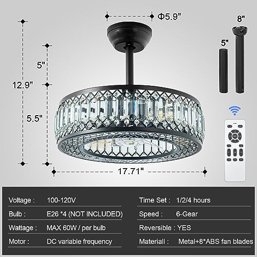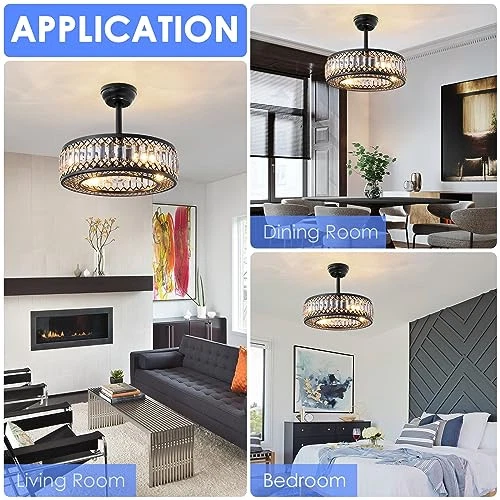Menu 1. We require immediate payment. 2. We currently accept payment via eBay managed payments only. 3. Once payment is cleared, we will dispatch your shipment within 1-3 business days. Please refer to the "Shipping" tab for more information regarding shipping speed to your destination. Modern Black Crystasl Ceiling Fan with Light, Caged 18" Bladeless Ceiling Fan with Remote Control, 6 Speed Low Profile Enclosed Ceiling Fan with Reversible Motor for Bedroom Kitchen Living Room Product description Crystal Ceiling Fan with Lights: Dazzling look cage ceiling fan light with 7 blades and 4 E26 light bases(Bulbs Not Included), perfectly decorate industrial, vintage, rustic and modern style homes, such as bedroom, living room, dining room, corridor, etc Smart Ceiling Fan with Remote Control: 1/2/4 hour timing, Light & Fan turn ON/OFF, 6-Gear wind speed, Natural wind speed, Forward and Reverse rotating direction. All of the funtion can be controled by remote ( 2 x AAA batteries are required but not included ) Modern Bladeless Fandelier with Reversible Motor: Reversible wind direction help to circulate the airflow in winter and forward wind in summer. Meet your different needs in all seasons. It brings you coolness in summer and promotes heat circulation in winter. Nor Just a classic ceiling fan light but also a home decor 4-LIGHT Caged Ceiling Fan Light: 4*E26 lamp base(bulb not included). Any E26 edison bulb is easily assemble without removing the cage. Max load 60 watt. You could choose warm or cold white as you want, even a energy saving bulbs Easy Installation Ceiling Fan: Including installation accessories and manuals. Most functional components have been assembled, the only thing you need to do is installing this ceiling fan to ceiling. T is also a hanging hook for this ceiling fan light, which can support the fan while it's being connected to the electrical wires. One person can finish the installation PLEASE MESSAGE US IF YOU HAVE ANY OTHER QUESTIONS, AND MANY THANKS FOR READING ALL OF THIS. Copyright ©#. All Rights Reserved.