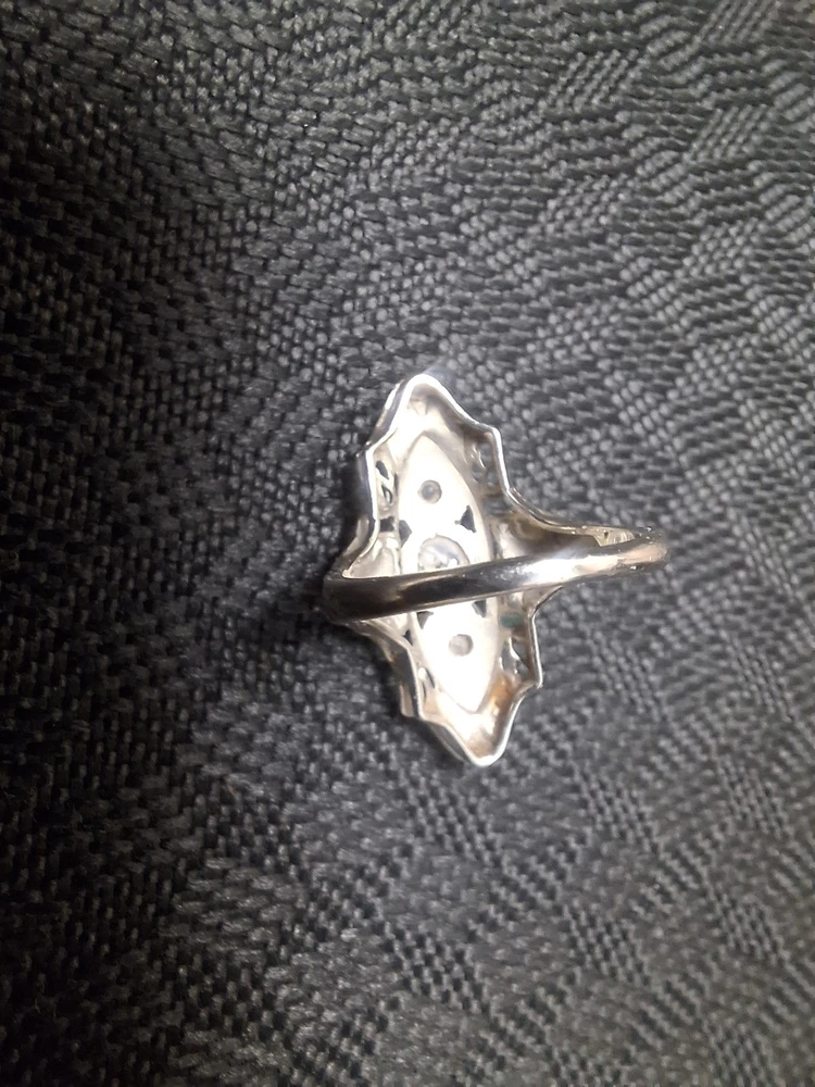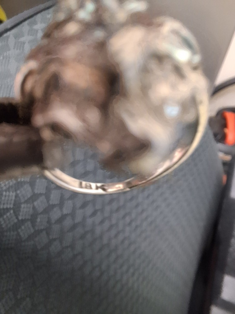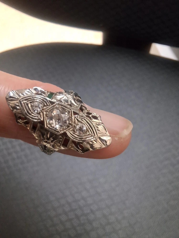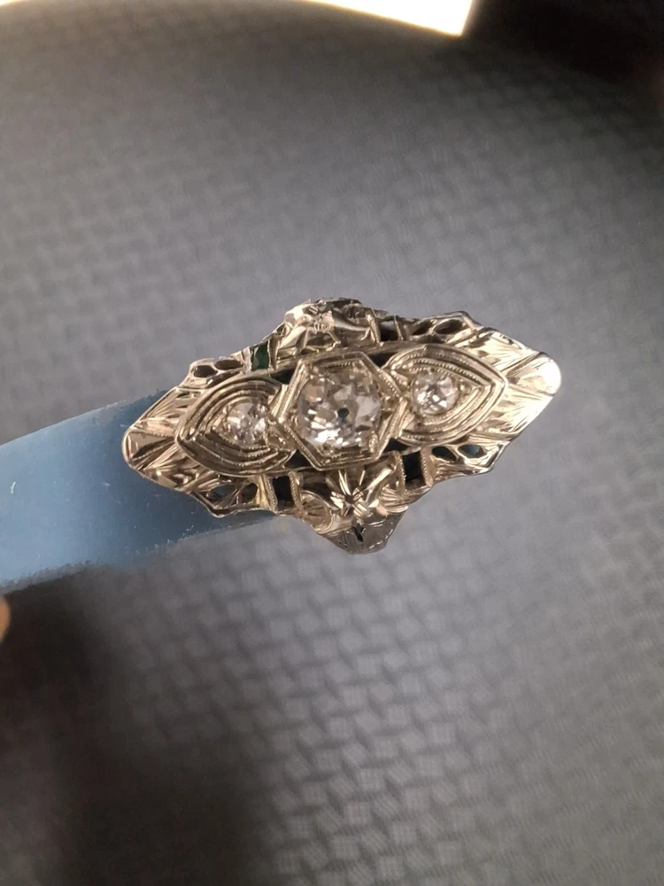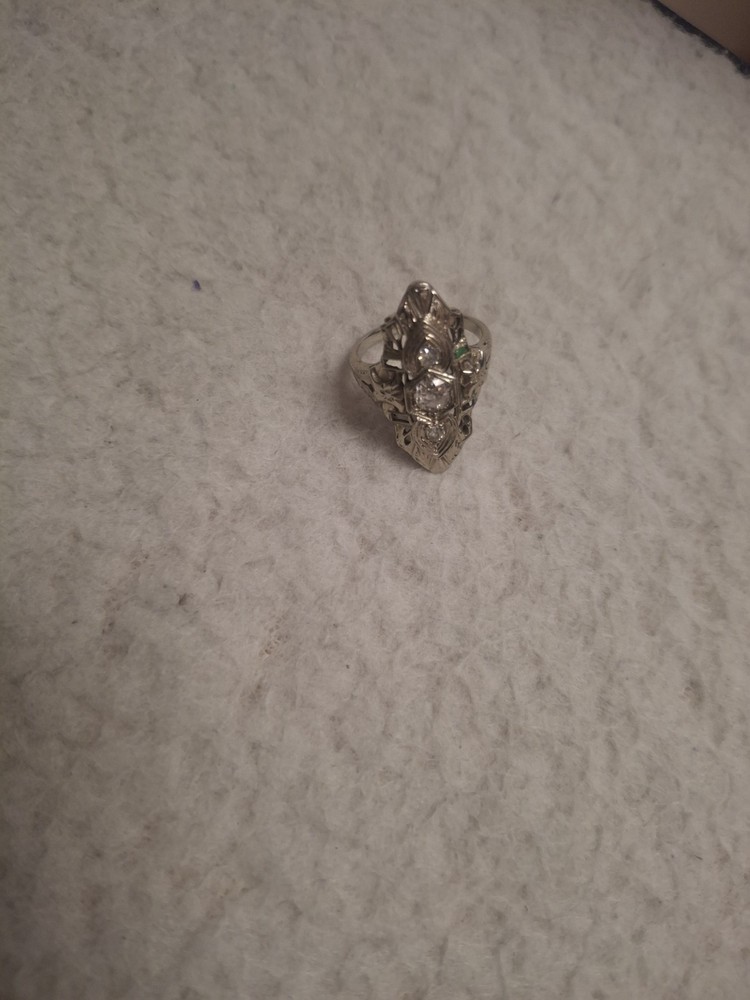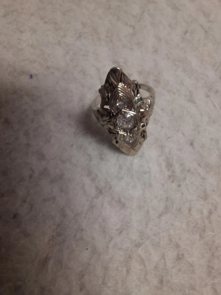 This is a 18K Gold Diamond ring, not sure of size but small. The ring weighs 3.5 grams and has one large Diamond in the center and two smaller ones on each side. There was four small green gems but only one remains. Beautiful ring in great condition except the missing stones. It appears to be a vintage ring! The gold and diamonds have been tested for authenticity.