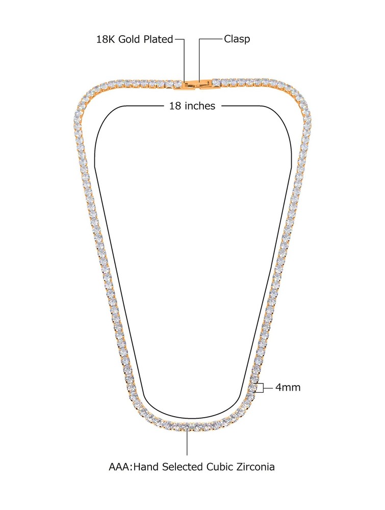 Elevate your style with our 18K Yellow Gold Plated Cubic Zirconia Round 4MM Classic Tennis 18 Inches Chain Necklace. This unisex, classic design features a solid pattern and a secure fold-over clasp, perfect for any occasion. The necklace showcases a single, high-grade AAA hand-picked cubic zirconia stone, securely set in a four-prong basket setting, ensuring a long-lasting, brilliant finish. Measuring 18 inches, it's a versatile piece that complements any outfit. Crafted with hypoallergenic, nickel-free materials, it's safe for all skin types. Enjoy peace of mind with our 90-day satisfaction guarantee. 18K Yellow Gold Plated Brass Tennis Chain Necklace Comes With 4mm Round High Grade AAA Hand Picked Cubic Zirconia Stones With An Amazing Sparkle. Stones are assembled secure in a four-prong basket settings and Gold Plated to ensure a long-lasting and brilliant finish. The classic tennis Necklace measures 18 inches which is a perfect classic piece for any women. The classic design can be worn with any outfit or any occasion. Rest assured this necklace is built with our strength fold over clasp for a strong lock around the neck Safe On All Skin Types: All bracelets are hypoallergenic and nickel free so they are safe for all skin types. If you have sensitive skin, you will love our product. 90 Day Satisfaction Guarantee! We at Jewelry Stand behind ALL of our products. If you are unhappy with your purchase for ANY reason whatsoever please contact us and we will make it right. Our customer service team will be glad and ready to assist you 100%. We carefully work close with all of our factories insuring the highest quality and detail go in to every piece of jewelry we manufacture. We value nothing more than our customers as our customers are the backbone of our company.