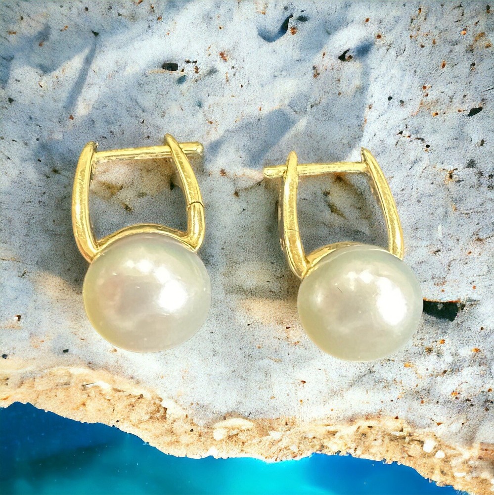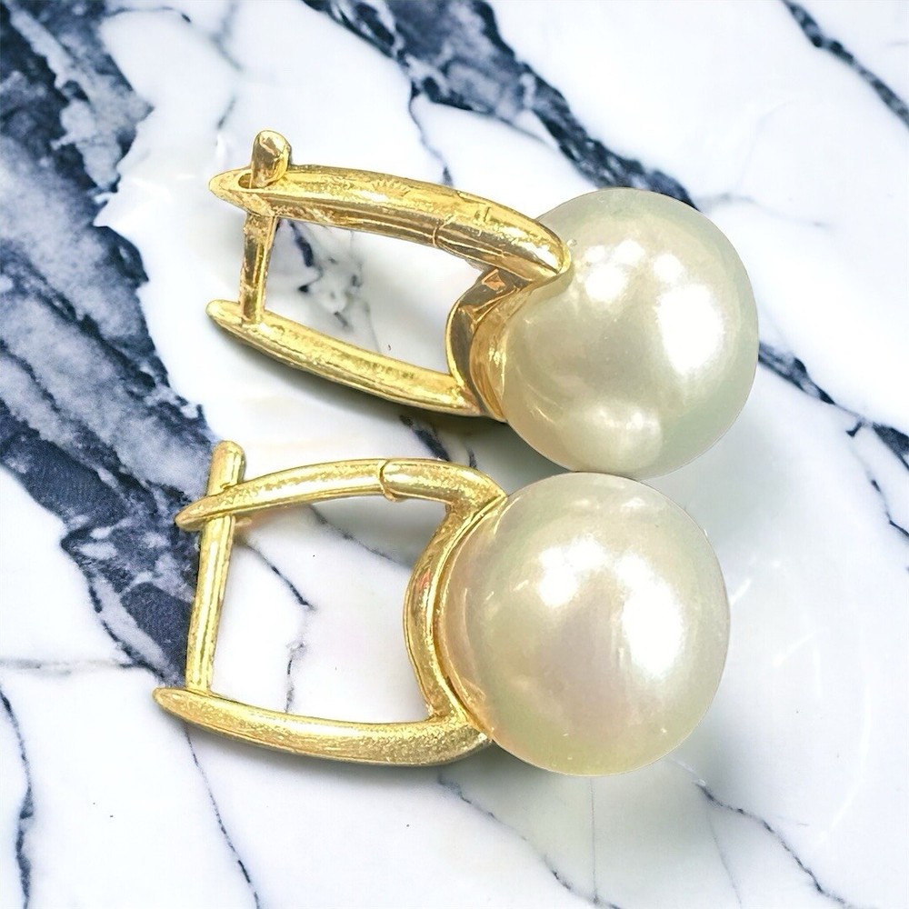 These elegant 18K yellow gold earrings from Love And Adore Jewels feature beautiful South Sea pearls. The huggie style earrings are perfect for adding a touch of sophistication to any outfit. The main stone is a stunning South Sea pearl, which is known for its luster and beauty. These earrings are perfect for those who love fine jewelry and want to make a statement with their accessories.