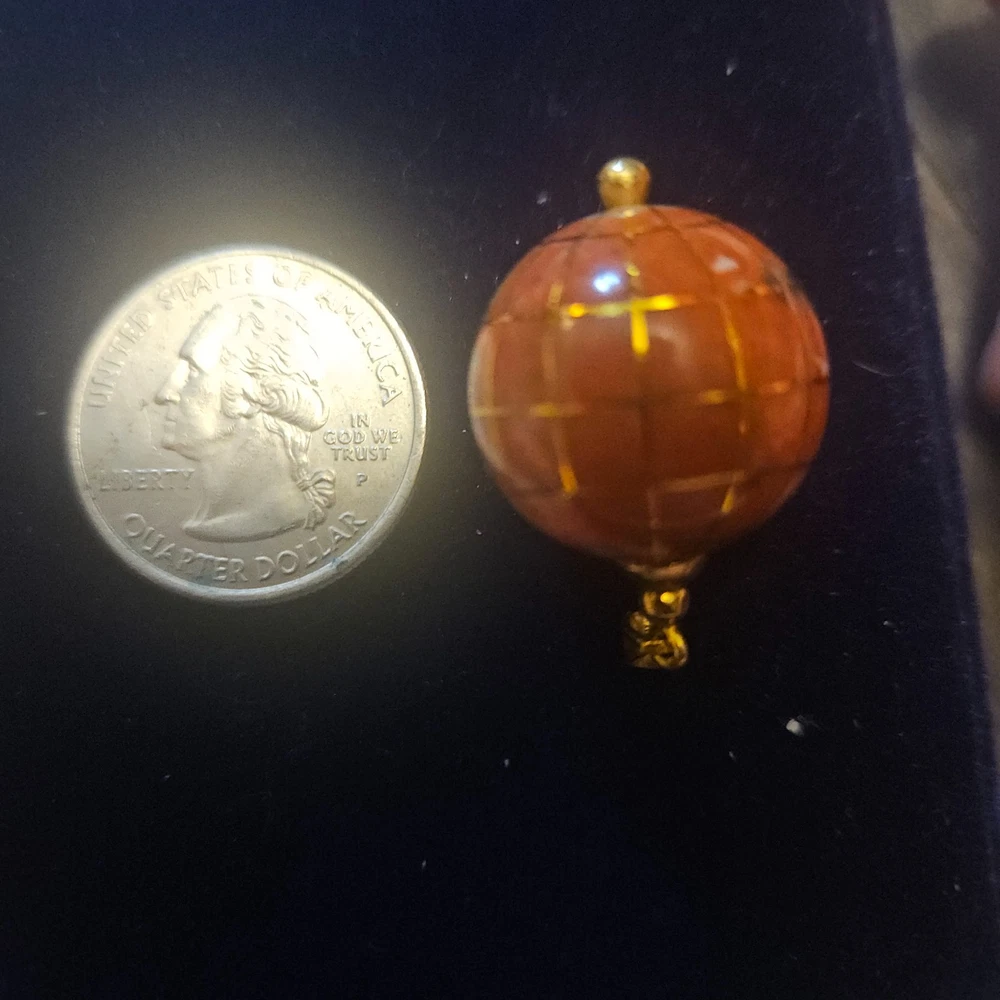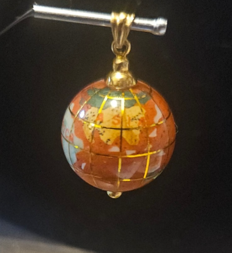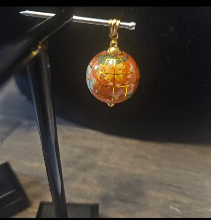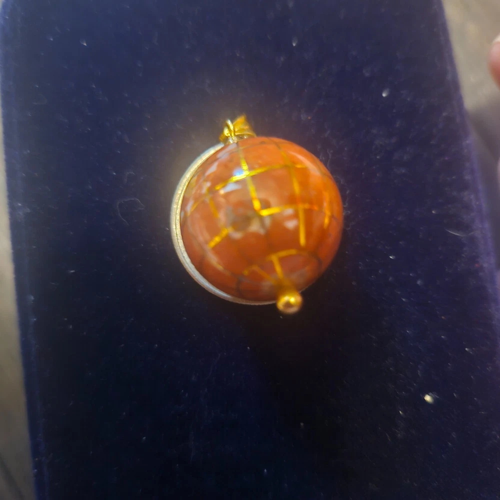 PRICE REDUCED AGAIN! Lowest Price of globes of this type. The Semi-Precious Stone is a stunning pendant featuring a beautiful abalone, mother of pearl, and jasper globe set in 18K solid gold with 18K inlay, bail and all trim.The globe is an intricate combination of natural shells,natural stone and an inlay of gold....a unique piece. It is approximately 11/4 inch tall and 3/4 inch wide.Weighs 6.6 grams. NOTE: The speckles throughout the globe are the different components of the stone. NOT DEFECTS For instance the round mark on Australia is a bluish green irredesent like abalone. The globe was created first, gold inlays added and then coated resulting in a shiny and smooth surface. The globe is still in its original state as it was created. There are no scratches or damage to the surface. Condition is Pre-owned great condition, no damage...smooth and shiny. 18K gold test- see Photo. Other measurements and coin comparisons in Photo. Free Shipping, usually mailed within 24 hours. Velvet Gift Box