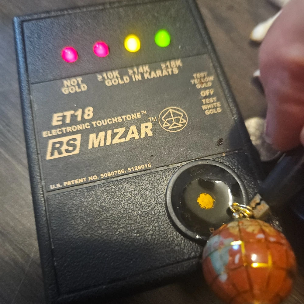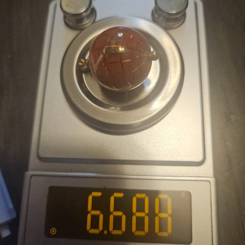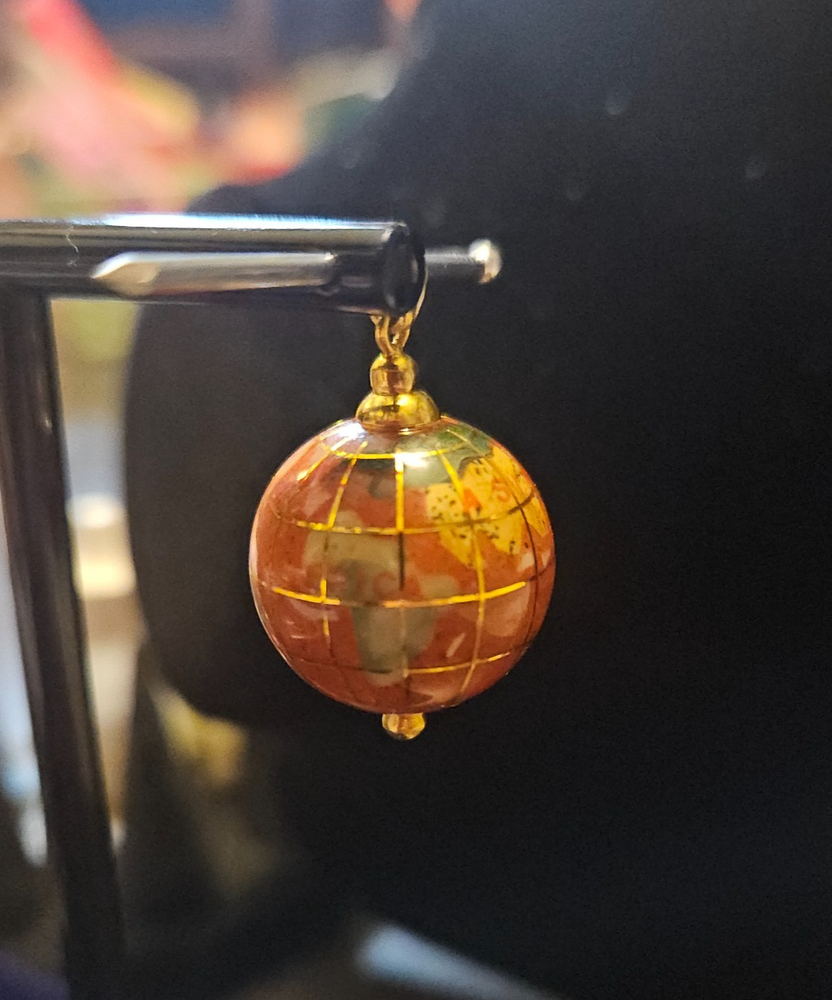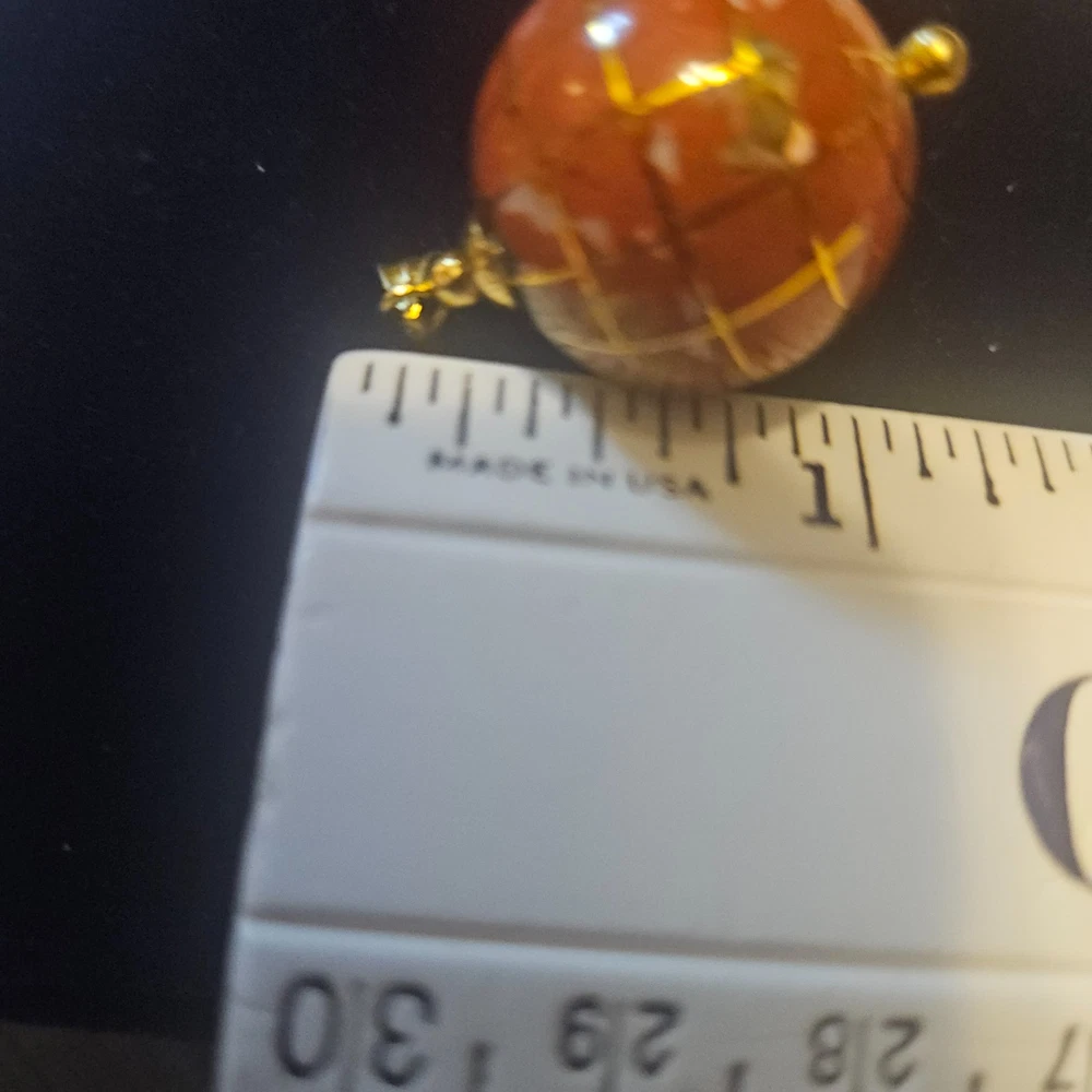 PRICE REDUCED AGAIN! Lowest Price of globes of this type. The Semi-Precious Stone is a stunning pendant featuring a beautiful abalone, mother of pearl, and jasper globe set in 18K solid gold with 18K inlay, bail and all trim.The globe is an intricate combination of natural shells,natural stone and an inlay of gold....a unique piece. It is approximately 11/4 inch tall and 3/4 inch wide.Weighs 6.6 grams. NOTE: The speckles throughout the globe are the different components of the stone. NOT DEFECTS For instance the round mark on Australia is a bluish green irredesent like abalone. The globe was created first, gold inlays added and then coated resulting in a shiny and smooth surface. The globe is still in its original state as it was created. There are no scratches or damage to the surface. Condition is Pre-owned great condition, no damage...smooth and shiny. 18K gold test- see Photo. Other measurements and coin comparisons in Photo. Free Shipping, usually mailed within 24 hours. Velvet Gift Box