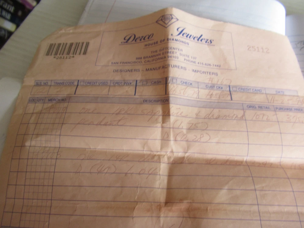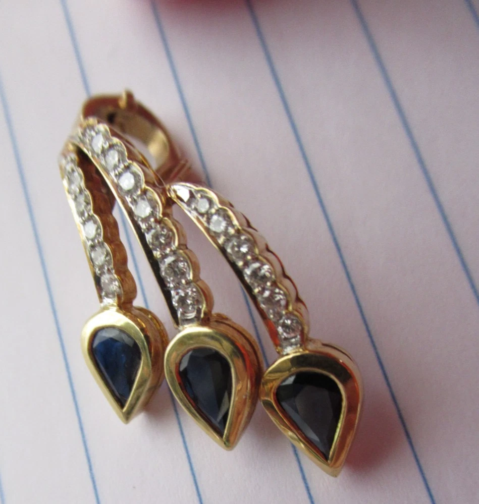 This 18KT gold pendant features an asymmetrical design with 20 natural diamonds and 3 beautiful sapphires as the main stones. The pendant has a slide closure. It is a perfect accessory for anniversary or birthday occasions, showcasing a yellow gold metal with a blue sapphire color. The pendant exudes beauty and elegance, making it a unique and luxurious piece of fine jewelry. THE PENDANT IS APPROXIMATELY 32.5 mm BY 12.1 mm AND WEIGHS 4.44 GRAMS. THE APPROXIMATE TOTAL DIAMOND WEIGHT IS .28CT AND THE SAPPHIRES 1.75CT. THIS IS ON ORIGINAL PURCHASE RECEIPT WHICH IS INCLUDED. RETAIL VALUE OVER $3,495.00. 2294a