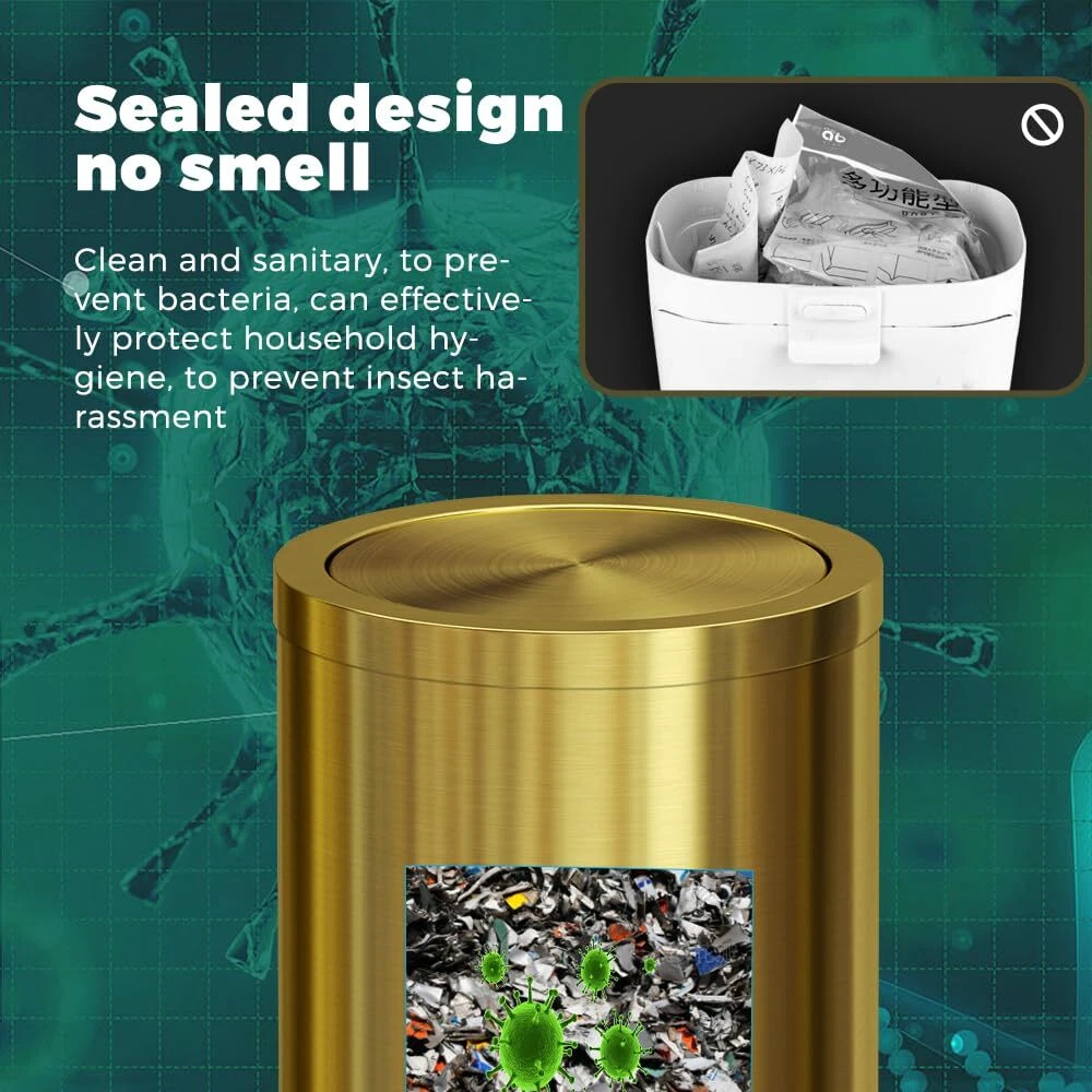 [Material and Appearance] : The whole trash can (including the lid and bucket body) is made of high-quality stainless steel material, with waterproof, rust-proof and fingerprint-proof characteristics. The barrel body adopts the wire drawing process, which not only enhances the visual texture, but also makes the trash can more thick and durable, and can maintain a beautiful appearance for a long time. [Swing Lid Design] : The lid is made of stainless steel and made by fine drawing process, which not only increases the structural strength but also enhances the overall high-grade feeling. The unique swing cover design supports 360-degree rotation and automatic return, making the disposal of garbage more convenient and fast operation, but also ensure good sealing, effectively reduce odor diffusion. [Composition] : This golden kitchen trash can is made up of three parts - a beautiful stainless steel lid, a PP plastic pressure ring to hold the garbage bag in place, and a sturdy stainless steel bucket body. This design ensures that the bags are perfectly hidden inside, avoiding unsightly problems caused by exposure. [Non-slip Base] : The bottom is equipped with non-slip gaskets, which can not only effectively prevent the garbage can from being dumped due to accidental collision, but also protect the ground from scratch damage, especially suitable for the family use of laying wood floors or tiles. [Large Capacity] : With 4.7 gallons of large capacity space, enough to meet the needs of the kitchen, living room and other areas in the daily family, but also very suitable for offices, meeting rooms and other high-end business places, is a practical and decorative ideal choice.