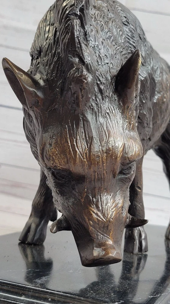 18LBS Signed ART Statue Bronze Marble wild boar Wild Pig & hunting dog WAR Art 18LBS Signed ART Statue Bronze Marble wild boar Wild Pig & hunting dog WAR Art Condition : This sculpture is in perfect condition Bronze Dimensions with Marble Base: Height 9 1/2" X Width 12" Marble Dimensions:12" X 7" Height without base:8 1/2" Weight:18 LBS Inventory:27-9944926572 Witness the captivating presence of the wild boar as it emerges from the forest's edge, exuding strength and defiance. This remarkable bronze sculpture captures the essence of this powerful creature with exceptional detail and artistry. From its alert gaze to the texture of its fur, every aspect of the boar has been meticulously crafted. Symbolizing warrior spirit, courage, and leadership in Celtic beliefs, the wild boar stands as a testament to bravery and perseverance. Its noble and fierce nature is beautifully portrayed in this handmade bronze sculpture, created using the ancient technique of lost-wax casting. The brown patina finish adds depth and character to the sculpture, highlighting the intricate details of the boar's form. Mounted on a black marble base, this sculpture becomes a striking focal point, whether displayed in a home, office, or gallery. The artist Moigniez's signature further enhances its quality and artistic value. Invite the spirit of the wild boar into your space and embrace the symbolism of strength and determination that it embodies. Wild Boar Pig Feral Hog Bronze Statue Sculpture Figure on Marble Base J. Moigniez 94492M Video will open in a new window Using the eBay App? Paste link into a browser window: [isdntekvideo] Shipping Terms : Most of our items are shipped via USPS (United States Postal Service) mail or UPS. Most orders are shipped within 24-48 hours of purchase. Please be aware that not all items are available for USPS shipping due to size and weight. We do ship to Hawaii, Alaska, Canada, Puerto Rico, APO/AE, and U.S. Virgin Islands, however, an additional charge may be required. Please contact us before making any purchases in these areas. For Non-USA customers, you may be responsible for all duty, tax, brokerage fees that may be due upon delivery (shipping costs cover freight charges only). We also ship internationally. Please refer to the "Shipping and Handling" chart for the rates for each area. Payment : We accept just about any form of payment. PayPal, Master Card, Visa or American Express credit cards. Money orders, cashiers checks, and even personal or business checks. For governmental institutions, we will also accept a purchase order. Please understand that for personal or business checks we have to wait for the check to clear (usually 7 days) before shipping. Condition : New Detailed Hand Crafted Hot Cast Bronze Satisfaction Guaranteed. This is Stock Photo, Slight Color Variation!! Listing and template services provided by inkFrog