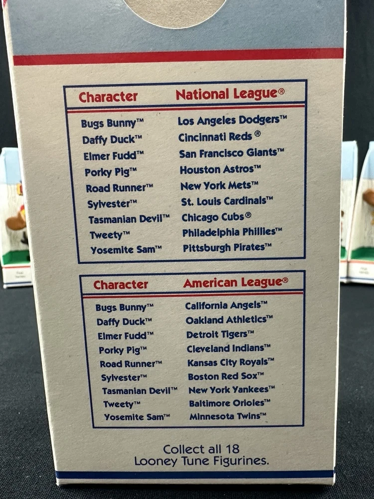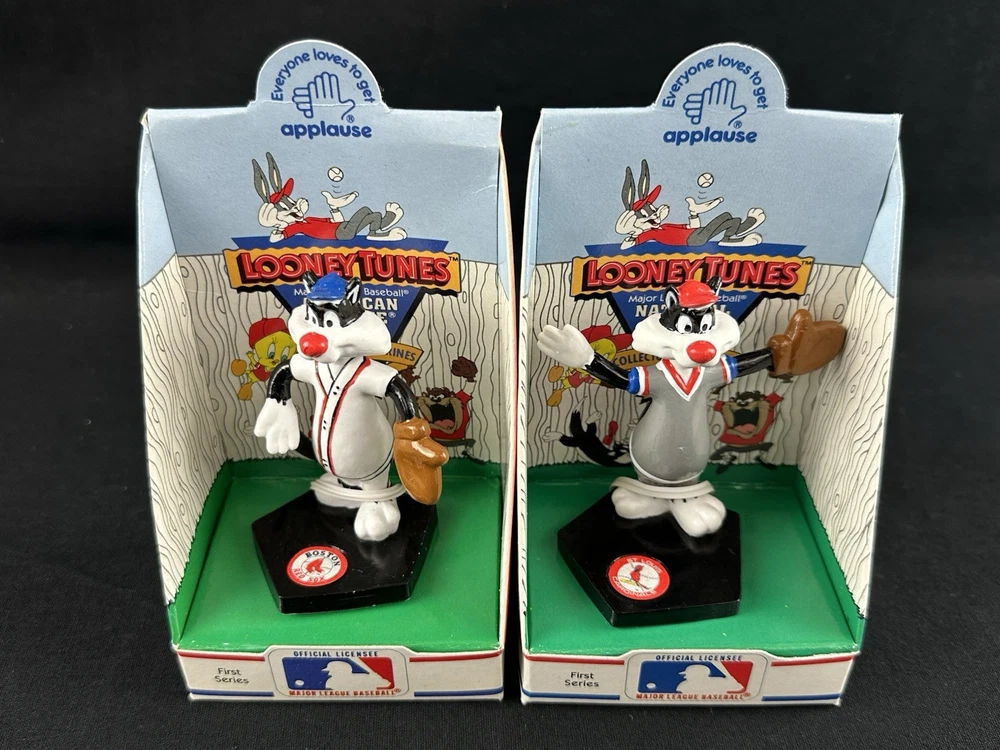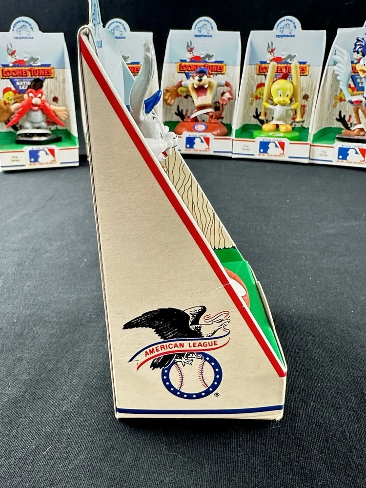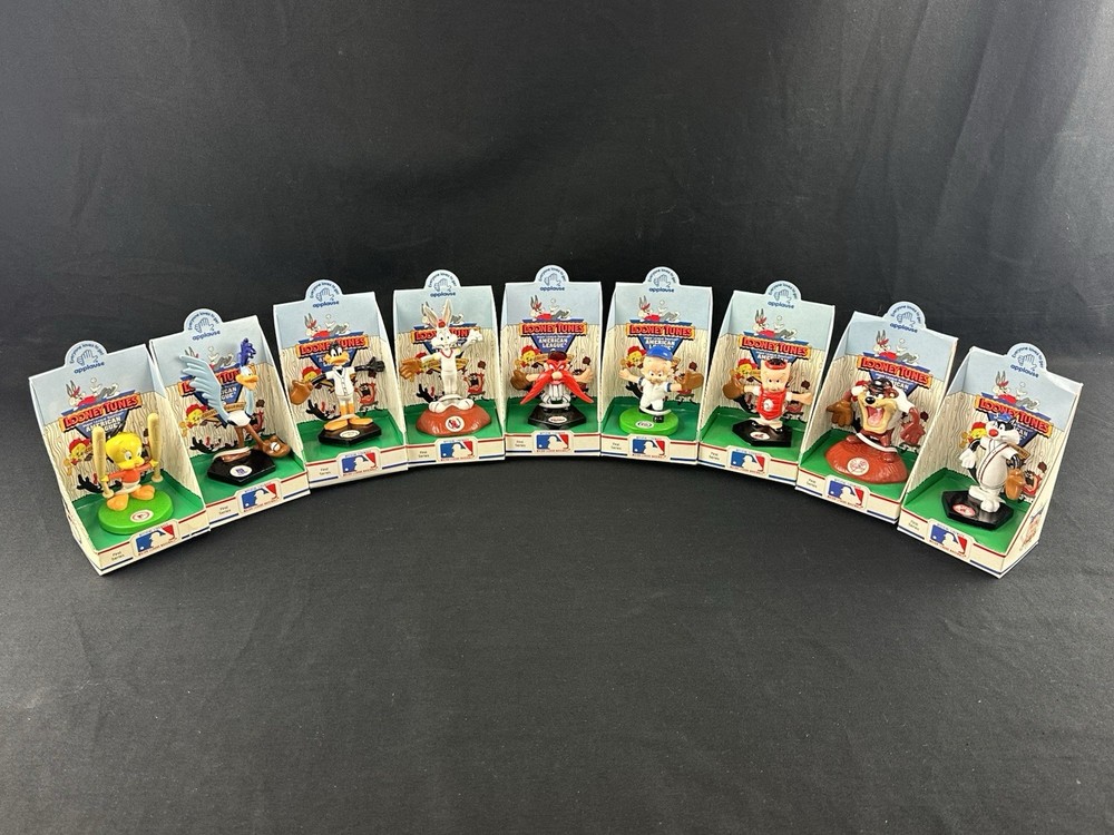 Up for sale is a Complete Set of (18) Applause PVC Looney Tunes Baseball Figures - Series 1 - New in Box. You get 9 National League teams and 9 American League teams. All figures are new in their original factory boxes. These were wrapped in plastic since purchase and removed for these pictures. No years of dust or fading on these! Great collection!