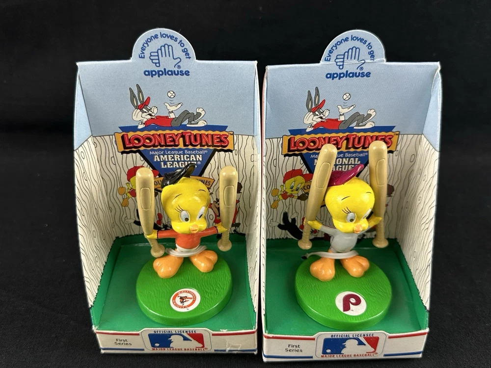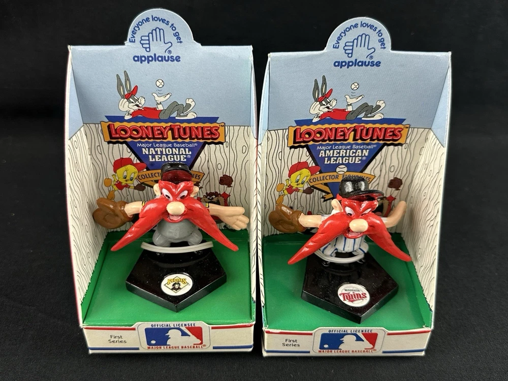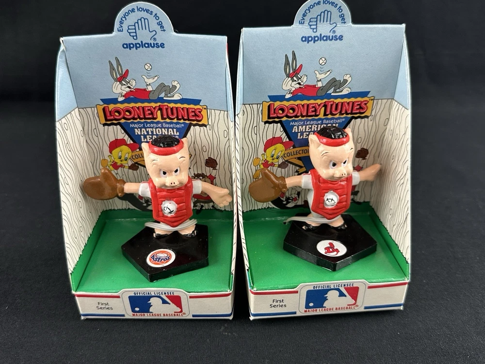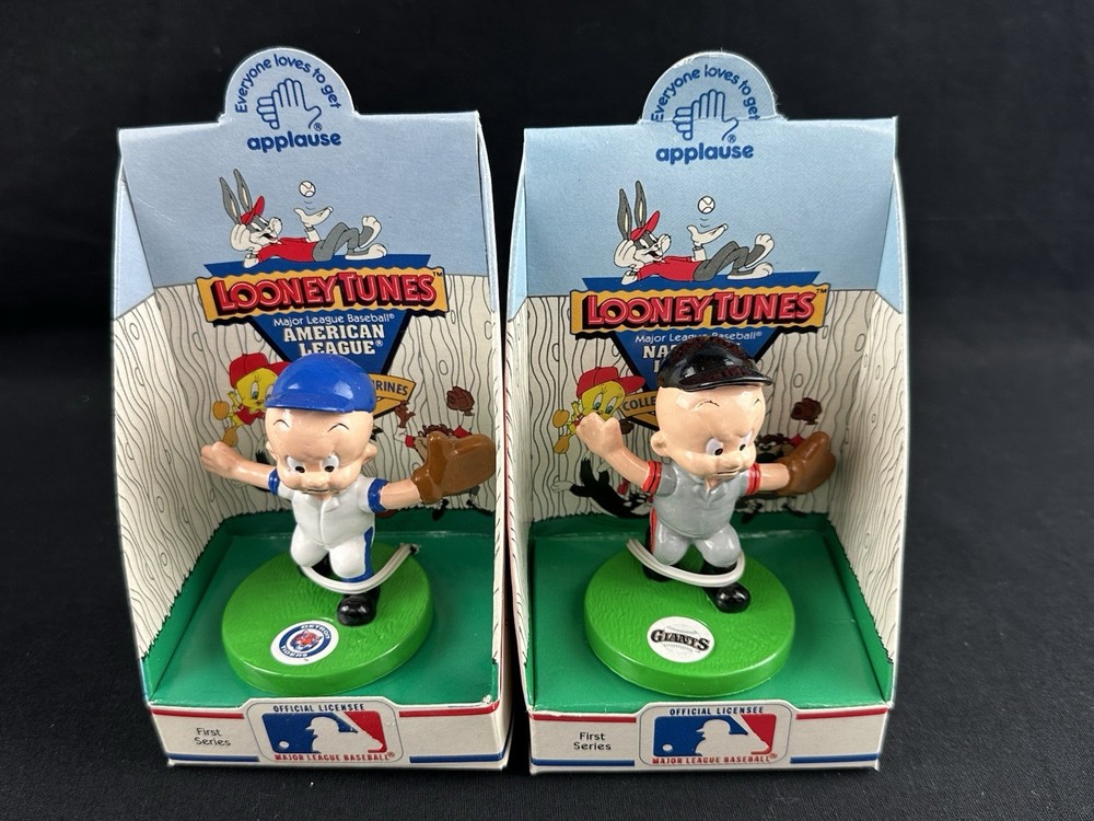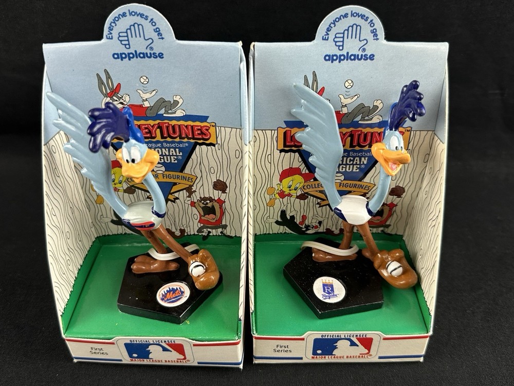 Up for sale is a Complete Set of (18) Applause PVC Looney Tunes Baseball Figures - Series 1 - New in Box. You get 9 National League teams and 9 American League teams. All figures are new in their original factory boxes. These were wrapped in plastic since purchase and removed for these pictures. No years of dust or fading on these! Great collection!