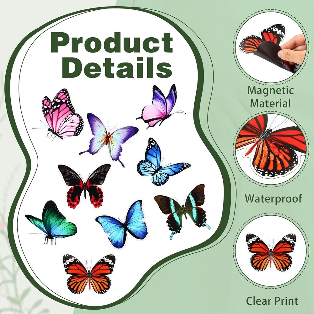 Easy to Install: the butterfly magnet for screen door is easy to use; Just need to stick 2 same magnets on both sides of the screen, then rotate to the right angle, and hear a click to achieve the desired effect; Meanwhile, due to the cutting process, there will be skewed after the product is installed Lovely and Visible Design: the butterfly screen magnet features a vivid and bright pattern, which is visible and cute; It can not only be applied as a beautiful decoration, but also a reminder on the screen door, to remind people not to bump into the screen when they see the magnet Screen Magnet Set: the package includes 18 pieces of butterfly magnetic screen savers, coming in 9 styles, enough and various to meet your daily using, replacing and sharing needs; You can choose the style you like to use, showing your personality and preferences Reliable PVC Material: the double sided screen magnets for screen doors are mainly made of quality PVC and magnet material, light in weight, sturdy and not easy to fall, applicable for a long time Applicable Occasions: these butterfly magnetic screen door magnets can be applied on various occasions, like your screen doors, garage doors, cars, refrigerators and more; They are not suitable for thick objects such as glass