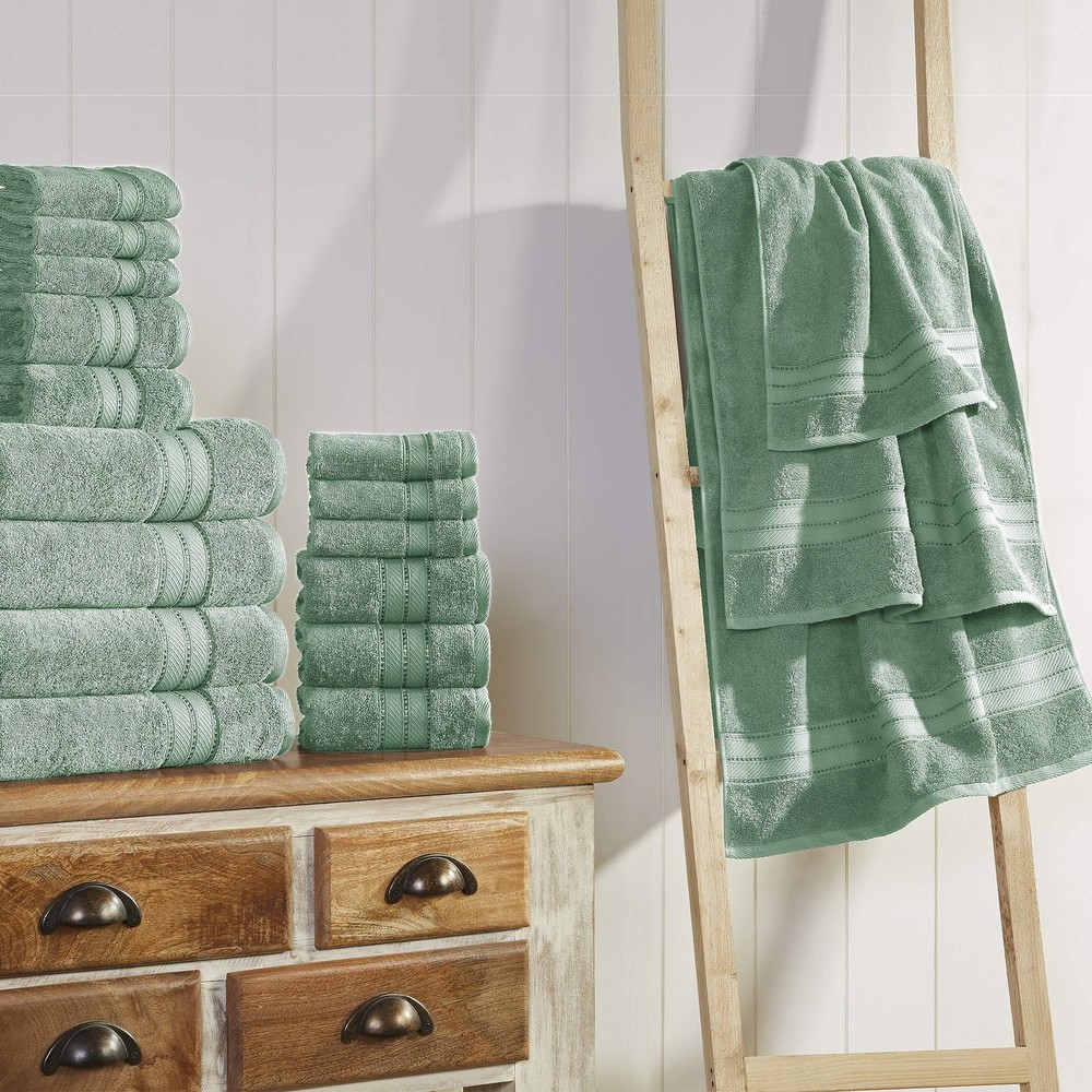 Elevate Your Bathroom With Our Ultra Soft Towel Set: Pillowy soft and plush, our modern Spun Loft 18-Piece Towel Set is perfect for enhancing your bathroom decor and bath times. Crafted from luxurious 600 GSM combed cotton, this elegant set boasts a timeless design that will stylishly complement your personal or guest bathroom. Finished with an extra-thick weave, wrap yourself in spa-like quality every time you step out of the shower or bath. Bath Towels measure 27 x 54 inches each; Hand towels are 16 by 28 inches each; and washcloths are 13 inch by 13 inches. Super Absorbent & Dries Quickly: Do you still drip puddles after drying off with your bath towels? Our medium density combed cotton bath towel set is designed to quickly absorb water from your skin after a long bath. Affordable and long-lasting, our bath set provides access to the kind of luxury towels you used to only experience on vacation. Soak up water and nestle yourself in pure bliss. Crafted From 100% Premium Combed Cotton: Made with impeccable 600 GSM cotton & fine-spun yarns, our fluffy Spun Loft towel set employs a medium-density weave that's extra durable and super soft to the touch. Bring hotel-quality right into your own home with this set and experience those luxurious towels you've been dreaming about since your last vacation. Made to become softer with each wash, maintain them with a machine wash in gentle cold water and sun dry or place on a low tumble. A Stylish Compliment To Your Bathroom Décor: Add a timeless flair to your personal or guest bathroom and choose between our collection of classic hues, such as white, pink, eucalyptus, charcoal, navy blue, & more to match your bathroom's theme. Treat your house guests -- or yourself -- to these luxurious quick dry bath towels and transform your bathroom into a hotel-like oasis. Pamper yourself right from the comfort of your own home. A Family Operated Brand With Over 40 Years Experience: Our family-operated brand has created elegant home textiles for more than 40 years, with every item hand-designed by talented designers in our California studio. At the intersection of luxury and functionality, we source only high-quality materials to enhance your home with décor you can be proud of. Make your go-to interior design brand and completely upgrade your space into the elegant oasis of your dreams.