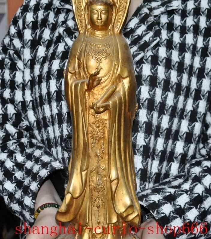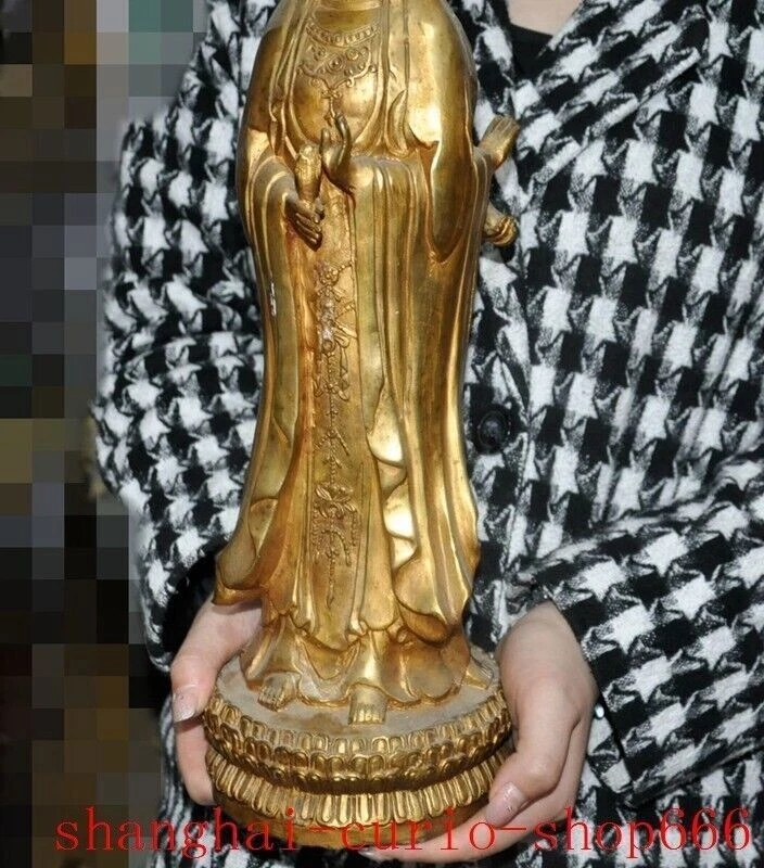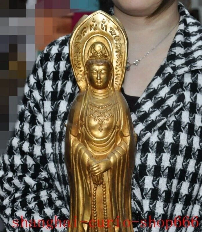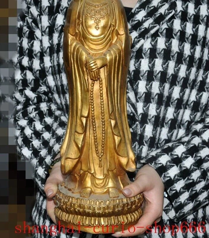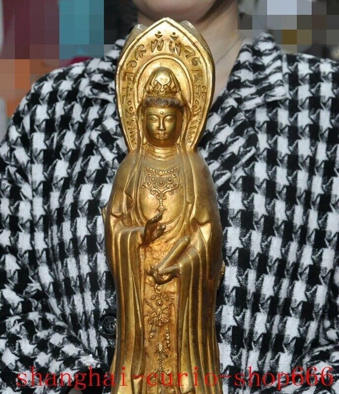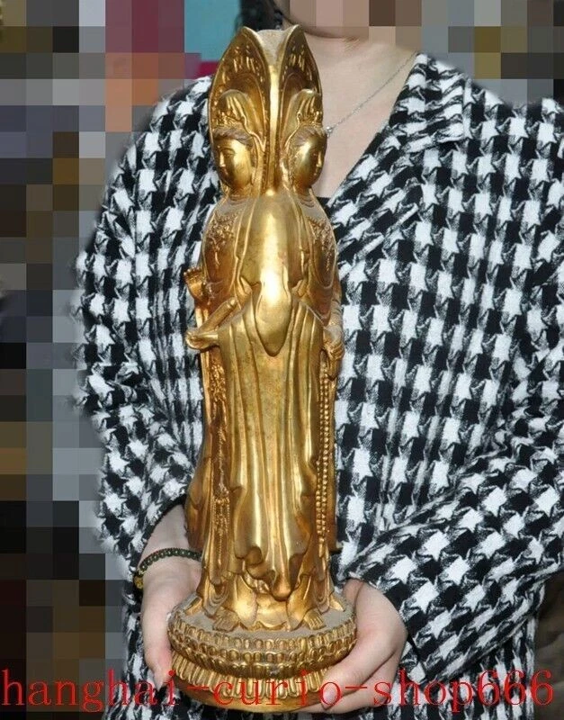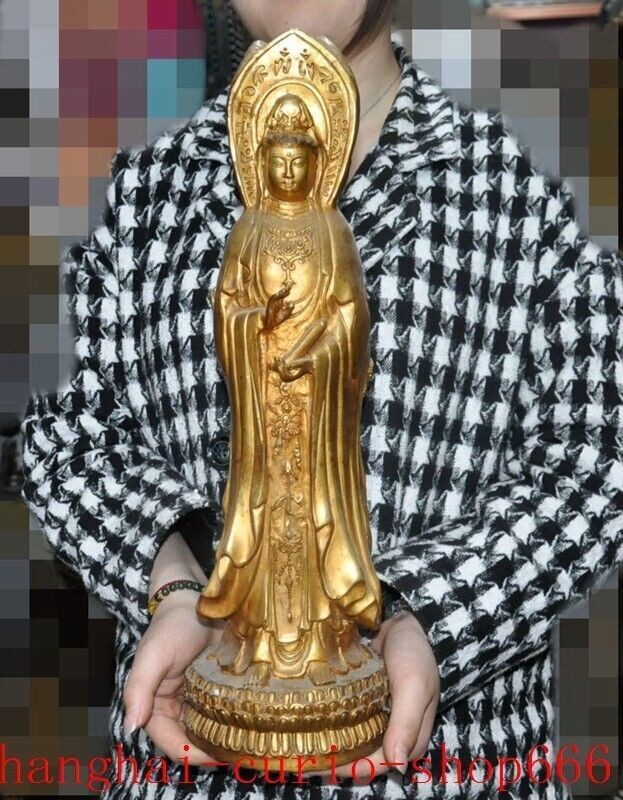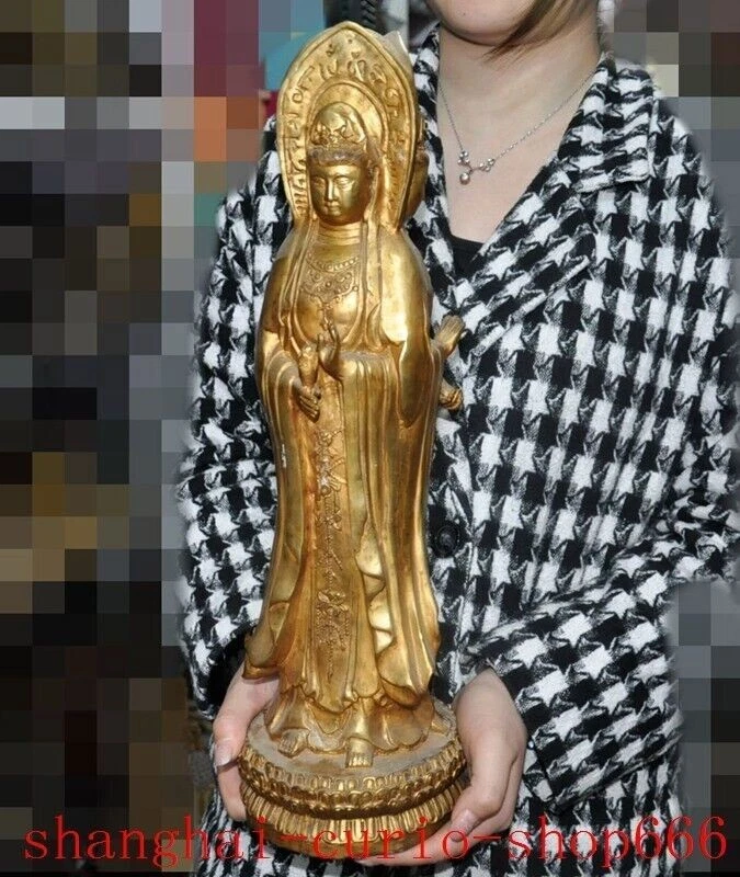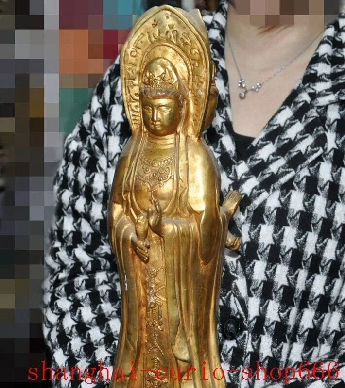 18"Tibet temple Bronze gilt 3 Sides Tara Kwan-Yin GuanYin Goddess Buddha statue Size : Height : 18 inch . Long : 5.4 inch . breadth : 5.4 inch Size : Height : 45 CM . Long : 13.5 CM . breadth : 13.5 CM Weight : 4.8 KG ----i ncluded the weight of packing materials Materials : Bronze gilt Condition : Good condition Origin : China