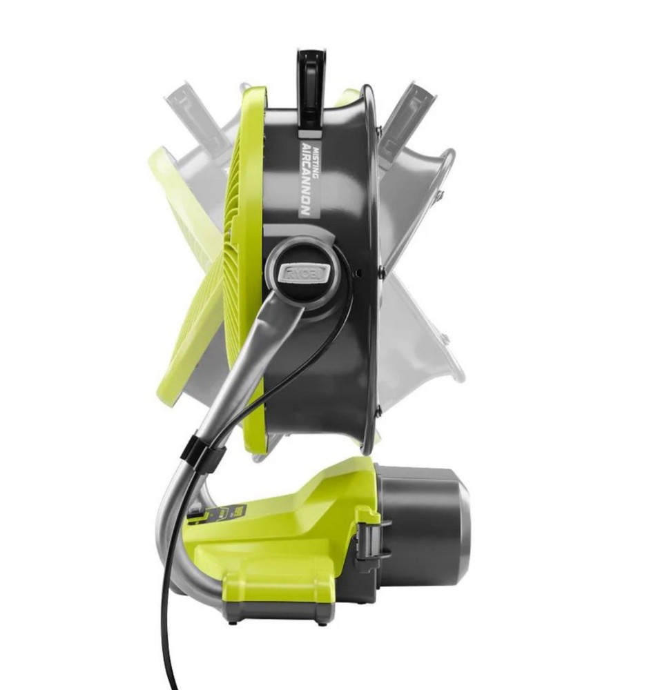 The 18V ONE+ HYBRID 12" MISTING AIR CANNON FAN by Ryobi is a powerful and versatile indoor fan that operates on an 18V battery for convenient cordless use. With a round shape, plastic material, and a 12" diameter, this fan features two speeds and a push button control style for easy adjustment. The adjustable tilt/head feature and rechargeable battery make it a convenient and efficient option for improving indoor air quality. The 54 dB operating sound rating ensures quiet operation, while the 1400 CFM air flow volume provides a strong breeze for comfort. FACTORY RECONDTIONED