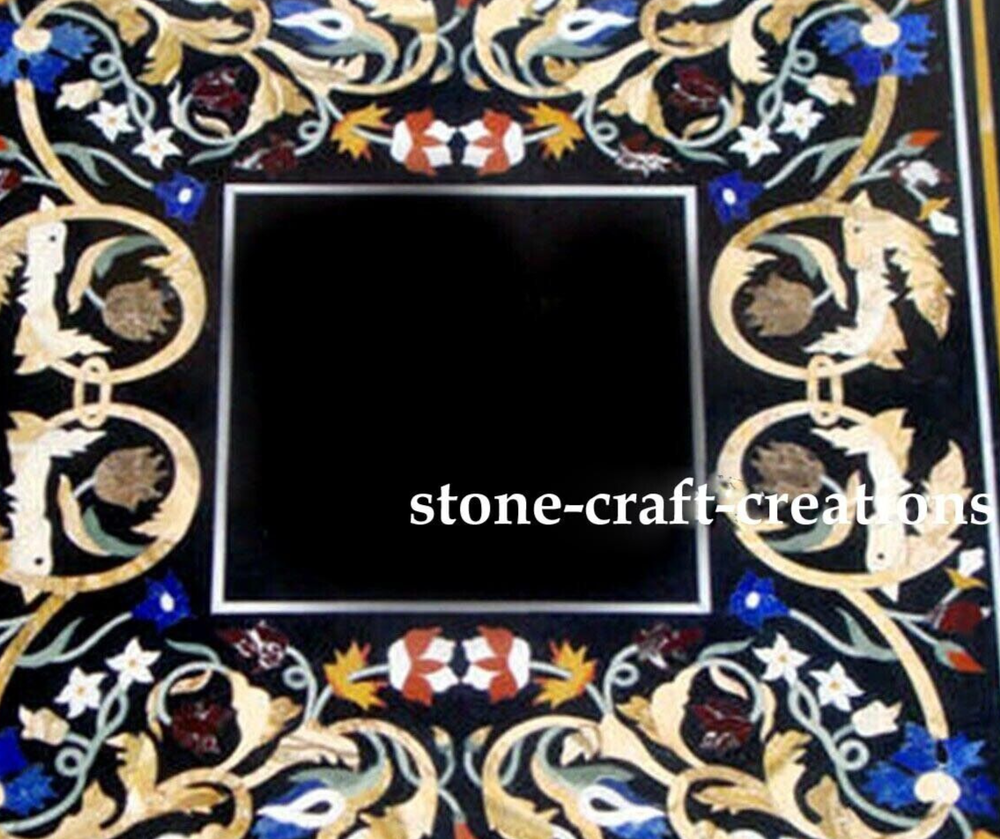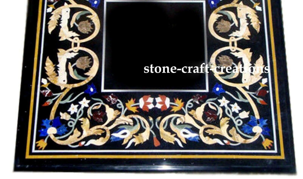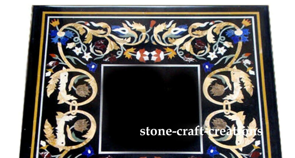 Welcome To Stone-Craft-Creations Shop Description Very unique Art by Indian Artist ,Coffee/Side Table top Used Material: Marble & Multi Semi Precious Gemstones Inlaid Size: 18"x18" inch Color: Black Shape: Square Pattern: Handmade Room: Bedroom, Dining Room, Hallway, Home Office/Study, Kid’s Bedroom, Kitchen, Laundry/Utility Room, Living Room,Patio, Playroom Packaging: Wood & Foam Export Packing Shipping: Air Can be customize ,Please message your desired size Process of Making Marble Inlay 1. We are inlaying semiprecious stones in three different colors of marble White Marble,Black Marble & green marble. 2. The Marble used to inlay the semiprecious stone comes from city of Makrana, Rajasthan India. 3. First we cut the marble in different shape example Round,Octagonal,rectangle,oval & square shape. 4. After cutting the marble we paint the surface of marble with Hina(red Color) so we can sketch the geometry on the surface of Marble. 5. With the Help Of emery wheel we cut,polish & shape the semiprecious in different forms of flowers,buds,leafs & stems all the cutting of the semiprecious stones are manually cut by the artisans. 6. After cutting the semiprecious stones we assemble them to complete the motif & then the semiprecious stones are placed on the surface of marble so we can trace them on the surface of marble to make the exact size of the cavities once the stones are traced we remove the stones from the surface of marble & then manually we chisels the marble with the diamond chisels & tungsten carbide chisels once the cavities are completed we place the semiprecious stone in the cavities to check the depth of the stones. 7. When we are fully sure that the stone fits well in the cavities we use special kind glue to fix the semiprecious stones into the marble. 8. After completing the inlays into the marble we first rub the surface of marble with sandstone & then we polish the surface of marble with sandpaper which brings the natural shine on the surface of marble & to the semiprecious stone & we use wax polish to make the surface shiny. 9. Most interesting expect of this pietre dure( marble inlay with hard stone) all the designs are made by the artisans are purely an imagination of artist once made they cannot make another one exactly the same it will look similar but will not be the same. 10. This beautiful art is a dying art of Agra,India the artisans those make this beautiful art are the descendants of those families who built the Tajmahal in 17 century Tajmahal is a monument of love & you can easily see the artwork done with the same technique on the walls of the Tajmahal. 11. I Invite you to come to Agra,India & visit the beautiful Tajmahal & you will surely be impressed & we request you give us a chance to show you the true handmade art of Agra by our artisans. 12. When you are purchasing this beautiful handmade Marble inlay art you will always be happy because all the pcs made by our artisans with love,hope & happiness. 13. You will always be enjoying the beautiful handmade marble inlay artwork secondly you will be supporting the local artisans of Agra,India to keep this beautiful dying art Alive. 14. All the purchase benefits the artisans & the buyer as there is no middle men in selling & buying. Inspiration/Story Behind This Product 1. This beautiful inlay art is a dying art of Agra,India the artisans those make this beautiful art are the descendants of those families who built the Tajmahal in 17 century Tajmahal is a monument of love & and one of the seven wonders in the world you can easily see the artwork done with the same technique on the walls of the Tajmahal. Note 1.The marble inlay table is made in Agra, India. 2.The marble inlay table will be delivered by FedEx or DHL free of cost door to door. 3.If there is any local tax,custom duties or Vat will be paid by the buyer at the destination. 4.The parcel is dispatch with proper packing & fully insured covering all kind of risk. 5.This marble table illuminates if the light arrangement is made under the plate. 6.It is an art piece which will be a beauty & the conversation pieces at home. 7.If You Are Looking Something Customize, Let Us Know We Will Make For You As Per Your Design, Size & Shape. 8. This is only Table Top & Base/Leg is not included. If you want stand/leg also, please contact us For Wholesale or corporate Inquiry please contact us. Thank you very much for admiring beautiful handmade marble inlay art. Please recommend your friends & family members to visit our ebay store this art is Dying art of Agra & we need your participation to keep this dying art alive. Thanking you in anticipation for your great support. If you are in Agra please email us we love to show you the process of marble inlay work at our premises