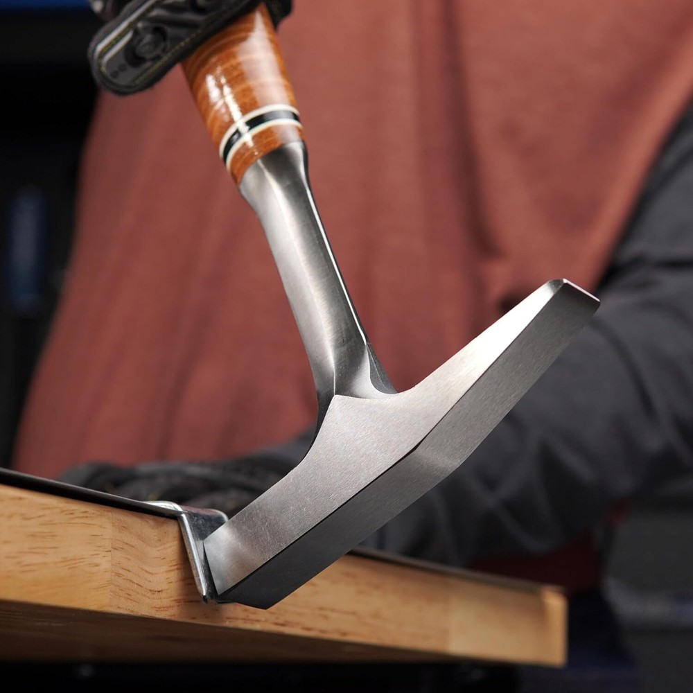 PRECISION SQUARE HAMMER - The smooth face design of this cross peen hammer ensures clean, accurate strikes, making it essential for meticulous metalwork. Professionals will appreciate its ability to deliver precise results, especially in applications requiring tight tolerances, such as HVAC installations or custom metal fittings. From working on HVAC installations to custom metal projects, this hammer is an essential tool that enhances efficiency and accuracy on the job. FORGED IN ONE PIECE - Crafted from a single piece of solid steel, our metal working tools offer unmatched durability and balance. The one-piece construction minimizes the risk of breakage during heavy use and ensures consistent performance over time. For professionals who rely on their tools daily, this durability translates into fewer disruptions and greater productivity. GENUINE LEATHER GRIP – Featuring a hand-sanded and lacquered genuine leather handle, this tinner's hammer combines durability with comfort. The high-quality grip ensures a secure hold during use, reducing fatigue and enhancing control. Its timeless design not only looks great but also maintains functionality, making it a pleasure to use on any job site.