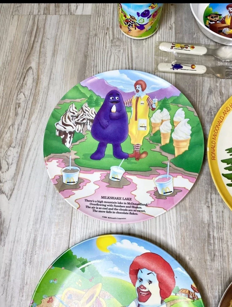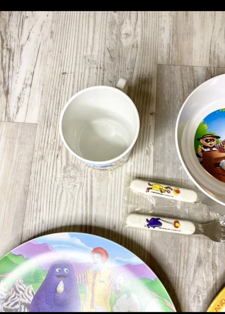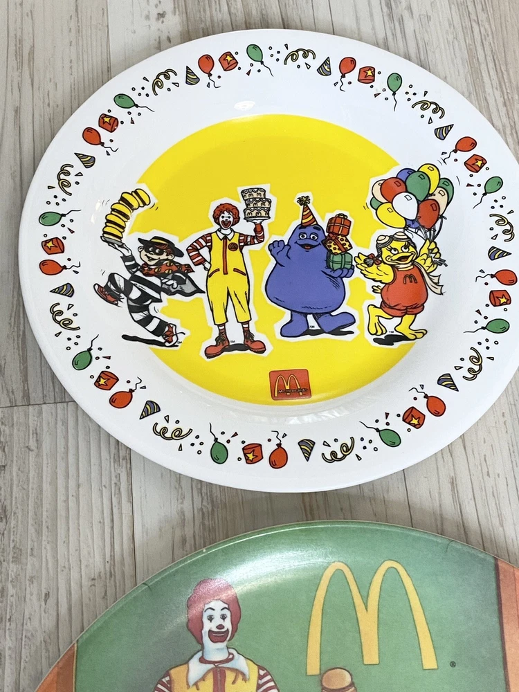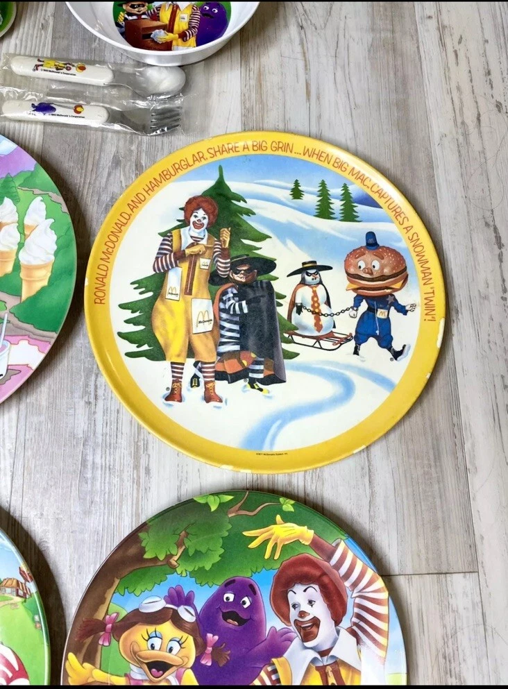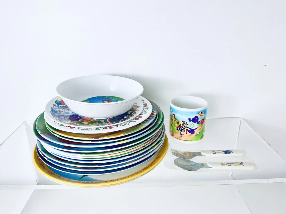 18 Plates total 14 are melamine plastic 1 is glass the small birthday party They range from years 1977- 2000 These are pre-owned some have scratches / flaws The 1977 plate is cracked Bowl Cup Collector Spoon Fork ( new sealed)