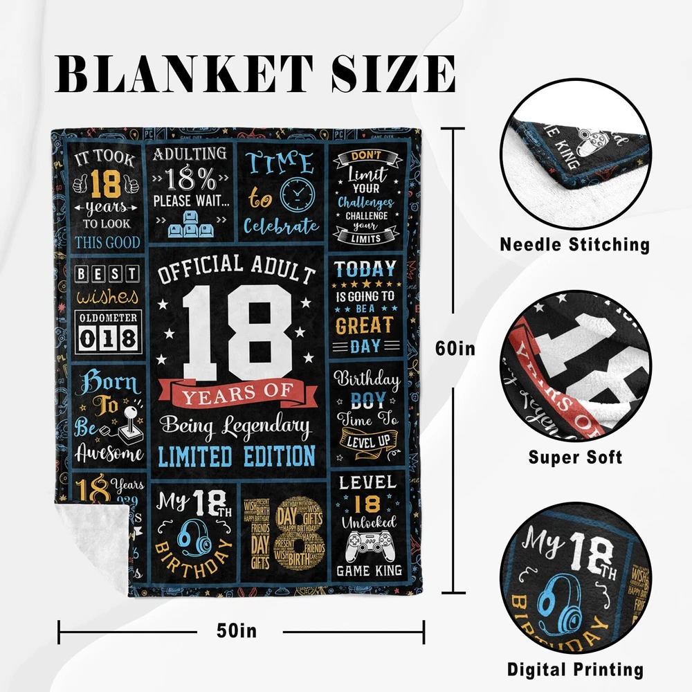 Unforgettable 18th Birthday Gifts for Boys What better way to celebrate a 18th birthday than with a memorable gift? Our blanket is the perfect present for your son, grandson, stepson, brother, friend, or classmate. This unique gift ensures that they will never forget their 18th birthday. It stands out as cool gifts for 18 year old boys and is a thoughtful choice for 18 year old boy. Versatile for Various Scenarios Our blanket is designed to be versatile and practical for many different settings. Whether they are reading a book, watching TV, lounging on the couch, or studying on a chair, this blanket is the ideal companion. It’s also perfect for camping trips, napping at school, or staying cozy in an air-conditioned room. This adaptability makes it of the best 18th birthday gifts for boys, offering comfort and warmth wherever it is used. High-Quality Craftsmanship Quality is at the heart of our product. Made from premium materials, our blanket is not only warm and breathable but also lightweight and skin-friendly. The vibrant and clear patterns on the blanket provide a visual feast, making it a joy to look at. Additionally, the blanket is resistant to deformation, ensuring long-lasting use and maintaining its quality over time. This superior craftsmanship makes it a standout choice for 18 year old boys. Easy Care and Maintenance Our blanket is designed for easy care. Due to the packaging, it might have some minor wrinkles when first received. However, this is nothing to worry about – a simple wash will restore its smooth and fluffy appearance. This convenience adds to its appeal as of the top birthday gifts for 18-year-old boys. The Perfect Birthday Gift In summary, our blanket is the ultimate gift for a 18-year-old boy. It combines practicality, high quality, and thoughtful design. Whether you are looking for 18th birthday gifts for boys or simply the coolest gifts for a 18-year-old boy, our blanket is sure to bring joy and comfort to any young teenager. BEST CHOICE FOR 18 Year Old Boys: Turning eighteen is a milestone worth celebrating. Our birthday blanket, designed for boys who are going to be 18, is the perfect gift to celebrate their 18th birthday. With its cool design, it stands out as cool gifts for 18 year old boys. PERFECT GIFT FOR FAMILY AND FRIENDS: Searching for the ideal birthday gift for a special 18-year-old boy? This blanket is an excellent choice! Featuring game consoles and computer keyboards, it’s sure to delight any game enthusiast. It’s a practical and fun birthday gift for your son, grandson, nephew, stepson, classmate, or friends. PREMIUM QUALITY: Our 18th birthday blanket is made from premium flannel, ensuring it is warm, breathable, lightweight, and skin-friendly. It can provide the recipient with a cozy and relaxing experience, ensuring long-lasting comfort. VERSATILE USAGE: This blanket, with its cool and colorful designs, adds personality to any space. It’s perfect for watching TV on the couch, lounging on the sofa, sleeping on the bed, studying/reading on a chair, taking out Camping, playing games, and napping at school, this versatility makes it an ideal gift for 18-year-old boys. EASY TO CLEAN: For the dark color of the blanket, please wash alone or with similar texture/color items in cold water to ensure it remains vibrant and we are confident that it doesn’t easily deform. This makes it a practical and thoughtful 18th birthday gift for boys, perfect for those looking for reliable 18 year old boy birthday gifts.