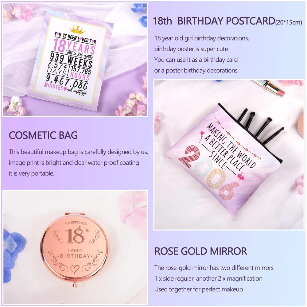 18 YEAR OLD GIRL BIRTHDAY GIFTS: Our gift boxes are beautifully designed and each gift is carefully arranged like a precious treasure waiting to be discovered. All these 18th birthday gifts for girls are well-designed, gifts for girls, girlfriends, sisters, daughters, nieces, sisters, friends, daughters 18th birthday gifts, let people open the moment, feel full of surprise and warmth GIFTS FOR 18 YEAR OLD GIRL CONTAINS : 12 Beautifully Packaged Gifts 1 x 20 oz stainless steel tumbler, 1 x scent candle, 1 x cosmetic bag, 1 x happy birthday 18 Makeup Mirror, 1 x natural stone bracelet, 1 x soft fuzzy socks, 1x bath bomb, 1 x diamond handmade soap, 1 x Hair Tie, 1 x birthday card, 1 x Postcard, 1 x Happy Birthday Gift Box. Receiving this gift box set, she will feel extremely happy and cherished, as if she has an exclusive luck and blessing PREMIUM QUALITY INSULATED VACUUM TUMBLER : “Sweet 18”20 oz cup, made of 18/8 food-rugged stainless steel, can keep drinks warm for 6 + hours, cool for 9 + hours, with this cup of iced juice or warm coffee, you can add a cozy life. Receiving such a practical and beautiful cup as a gift will make people feel incredibly intimate and warm, and a good day begins with your birthday gift BIRTHDAY GIFTS FOR TEENAGERS READY FOR YOU:Our gifts come beautifully gift boxed, no need to re-wrap, and don't forget to leave a personalized gift message by choosing to do so. Create a special birthday for a girl! We want the person you care about to receive the perfect gift, no matter you have any questions, please us, our after-sales team will give you the greatest support