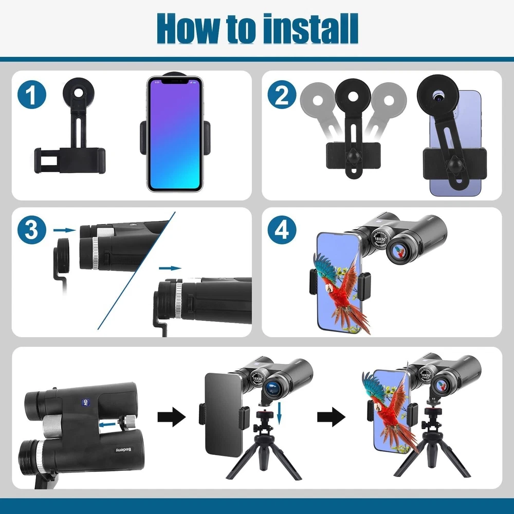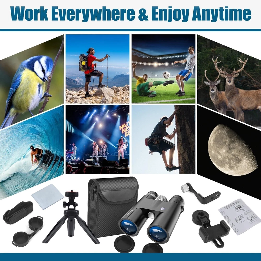 Binoculars, 19mm large eyepiece binoculars, with 18X high power magnification and 50mm objective lenses, provides you 399ft/1000yds large field of view, delivers large clear and bright image details. Binoculars for Adults,17mm BAK4 prism lens binoculars adopt fully multi-coated lense and phase-coated prism, which increase the light transmission of binoculars to 99.9%. makes the image more transparent,clearer and brighter. Waterproof binoculars, IPX7 waterproof and fogproof, A rubber-armored, polycarbonate housing protects your binoculars from damage, Waterproof - Perfect protecting binoculars,and stands up to the toughest weather conditions.They're also prevent internal fogging of the lenses. Binoculars for bird watching, The birding binoculars come with a new phone adapter and a tripod so you can stabilize your phone to take clearer and more beautiful photos.Capture the wonderful moments and share with your friends. HD High Powered Binoculars, the lightweight, portable design, Our professional binoculars for adults and kids is easy to use, focus with or without glasses. flexible adjust, Our binoculars provides high quality binoculars.