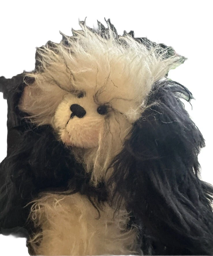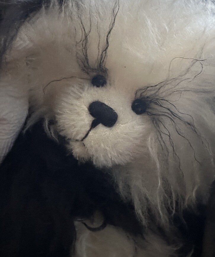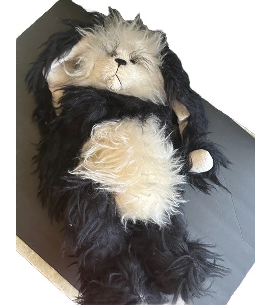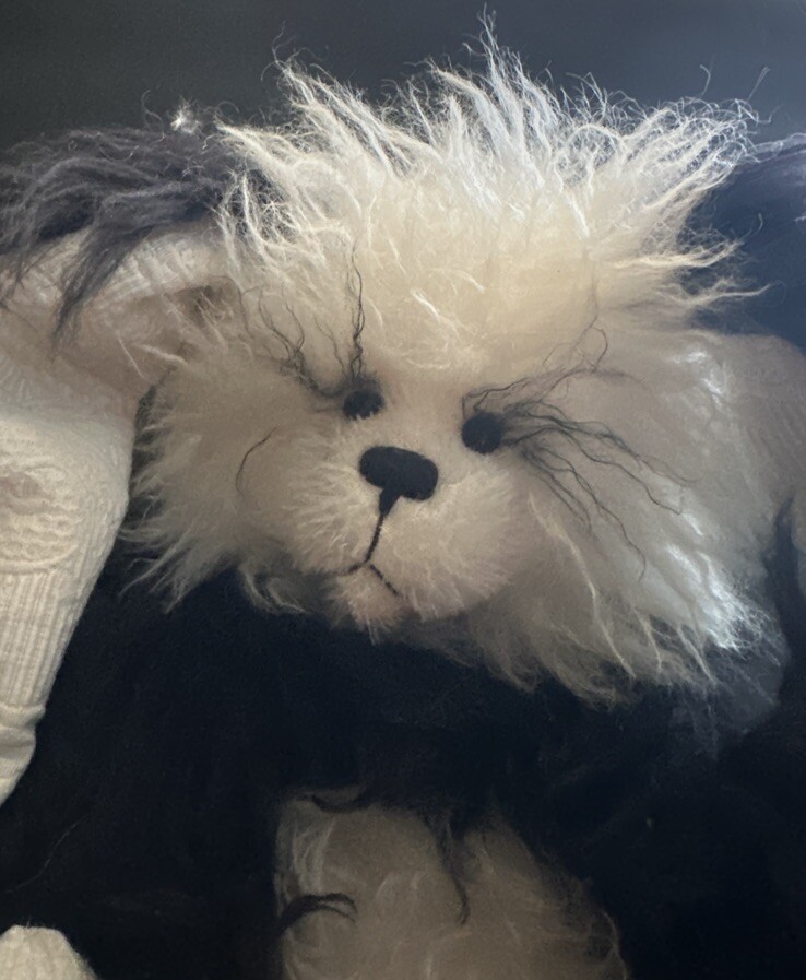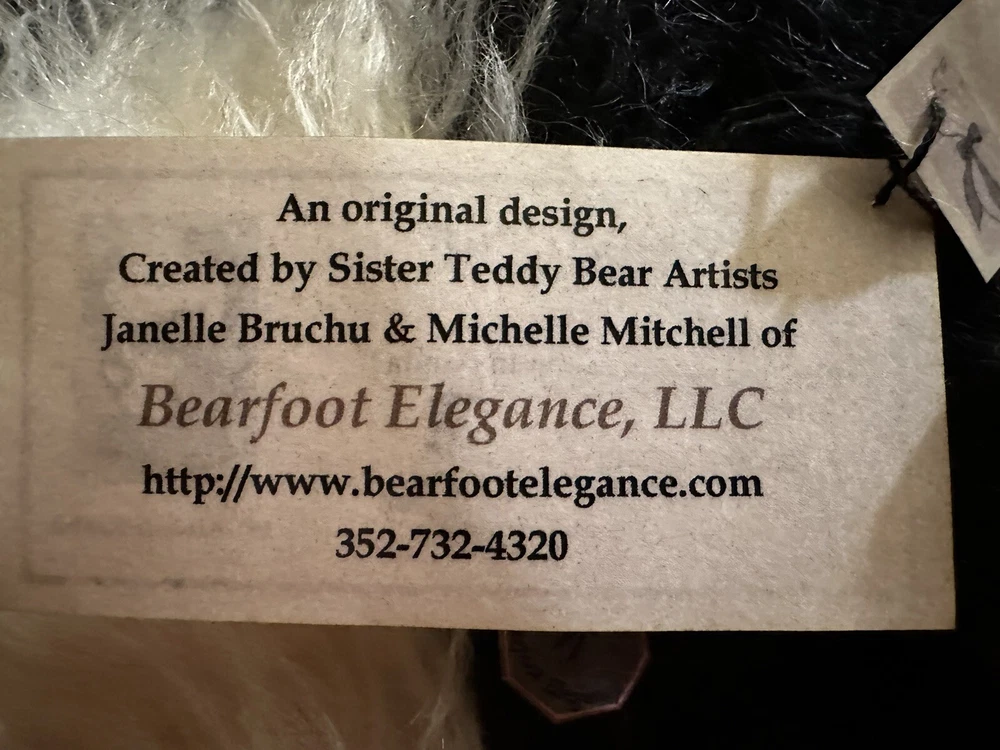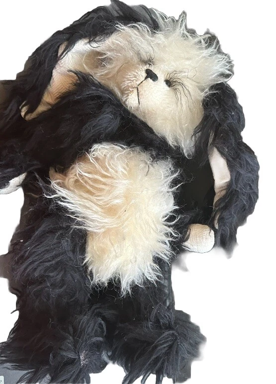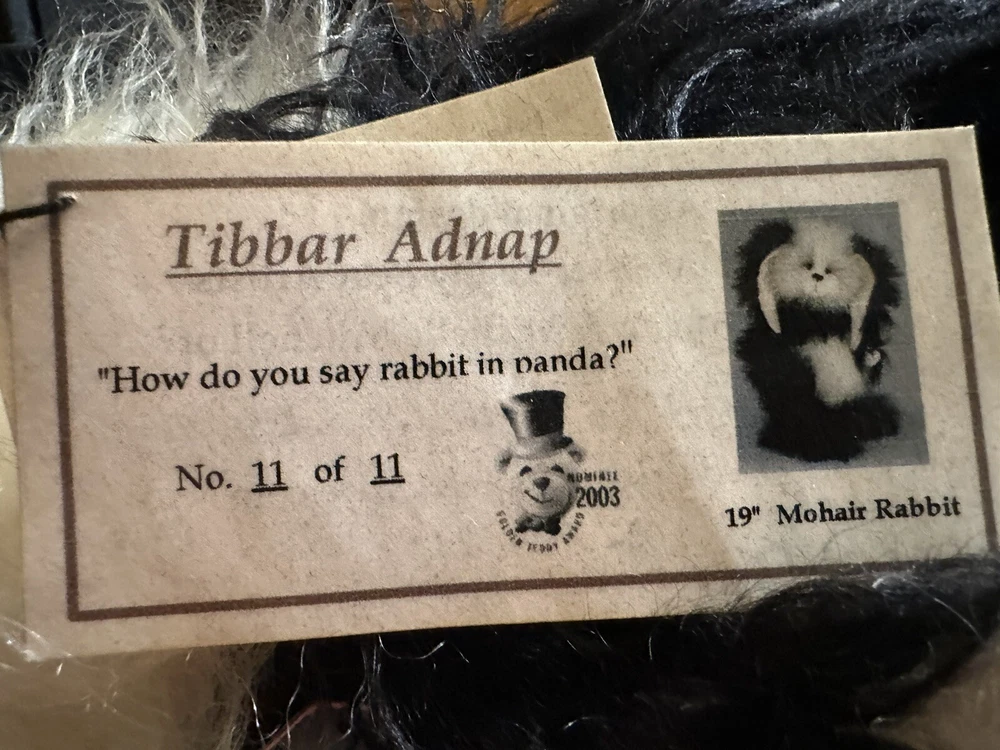 It’s a mohair Rabbit Panda Bear!!! “Tibbar Adnap” is Rabbit Panda spelled backwards! This design is one of only 11 made; this is number 11! This rabbit/bear was a Nominee in 2003 for Best Artist award in the US Teddy Bear Artist Competition. It’s a handmade custom designed bear by sisters Janelle Bruchu & Michelle Mitchell. There was only 11 of these made and this is number 11. I purchased this beautiful bear from them personally at a bear convention. This bear is gorgeous. It is 19” long and weighs almost 6 pounds. Made of mohair, poly fiberfill, poly pellets, excelsior, upholstery fabric & has glass eyes. This is an adult collectible and is from my personal collection.